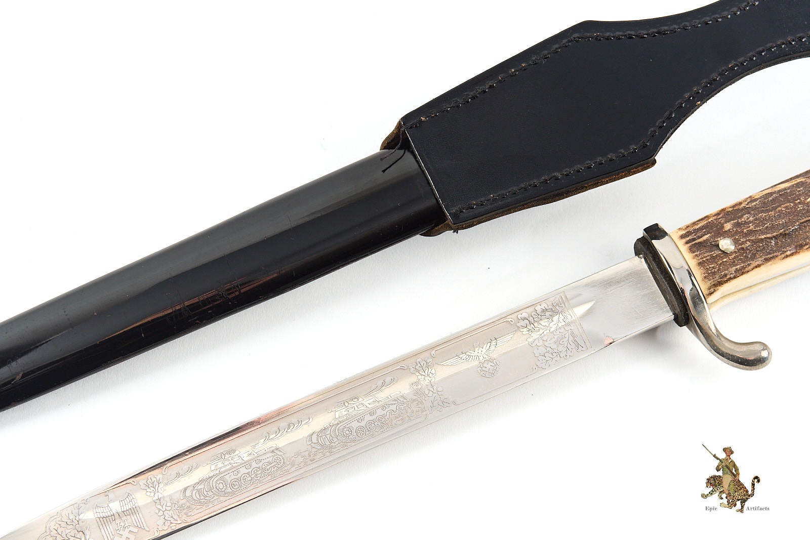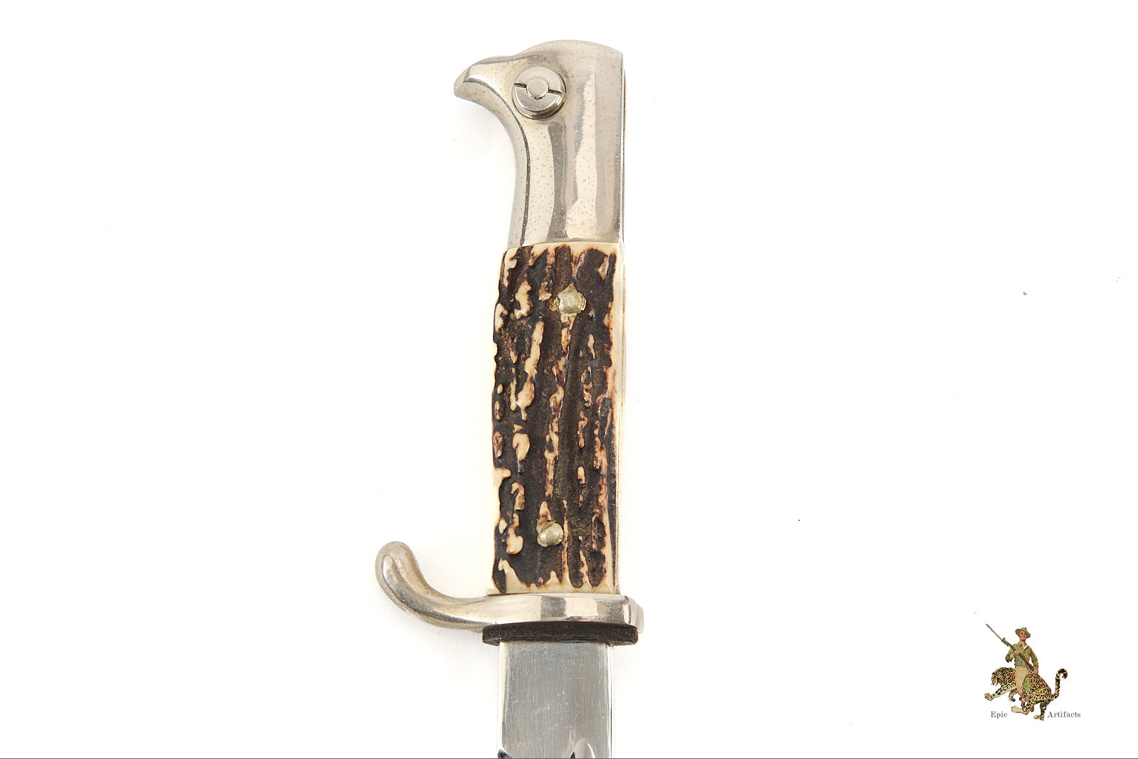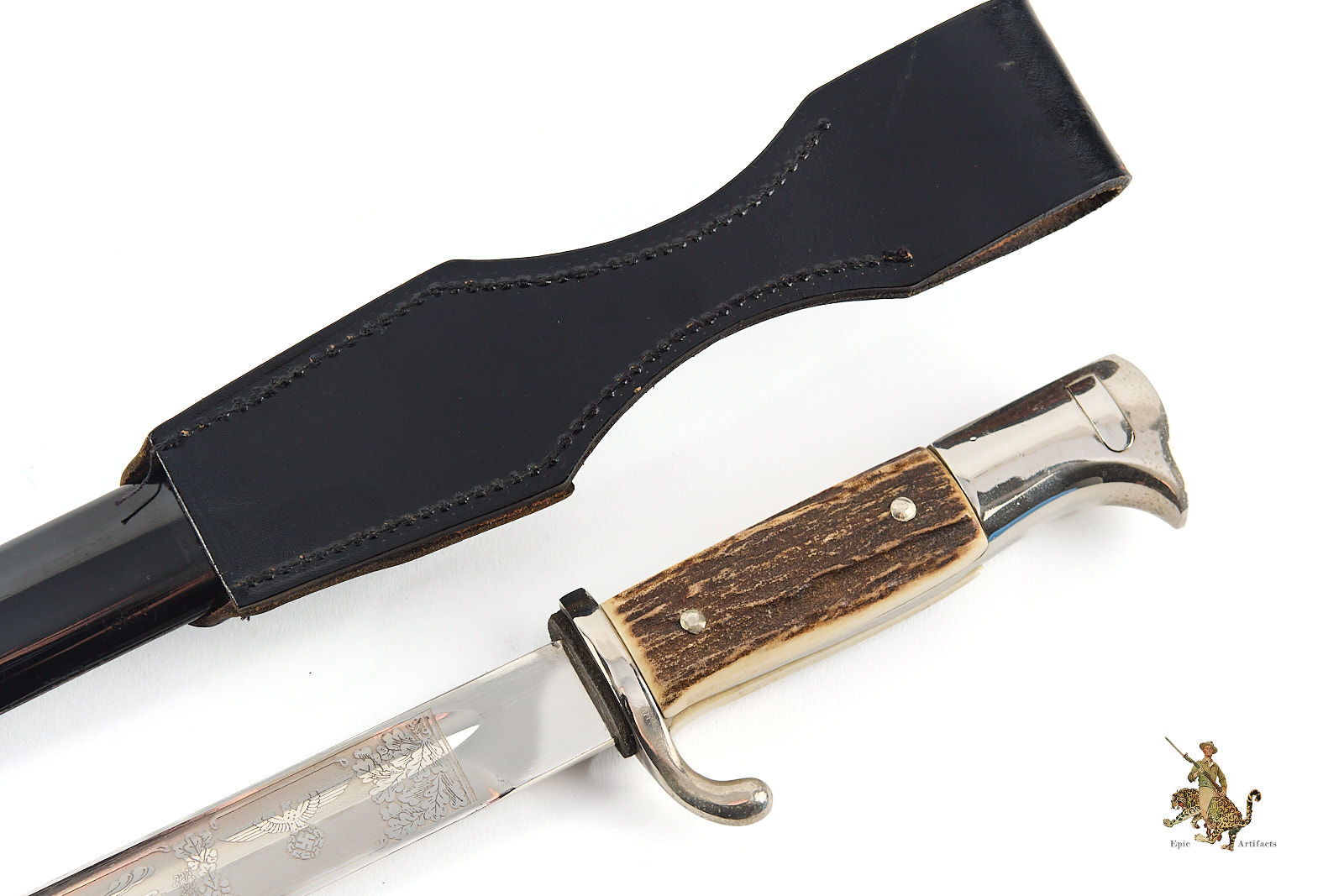 Overall, this Heer Panzer Stag Grip Double Etched Bayonet with Frog represents a finely preserved and visually striking example, combining decorative blade work with strong original components, making it a desirable addition to an advanced collection of German edged weapons.