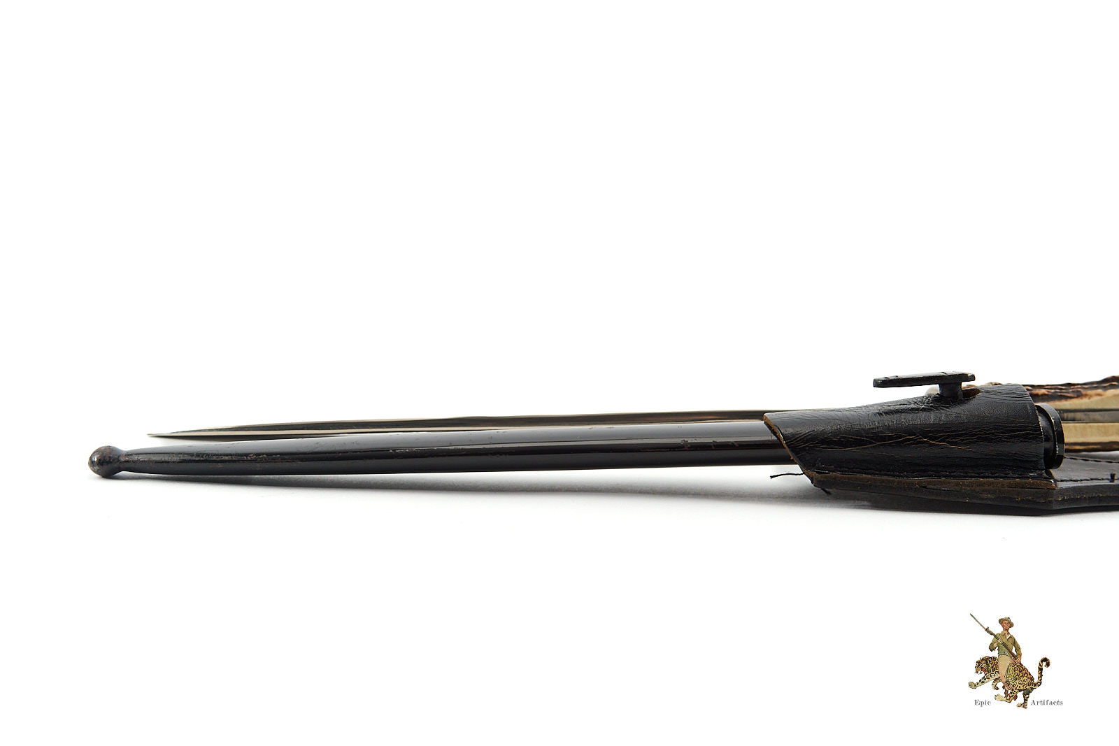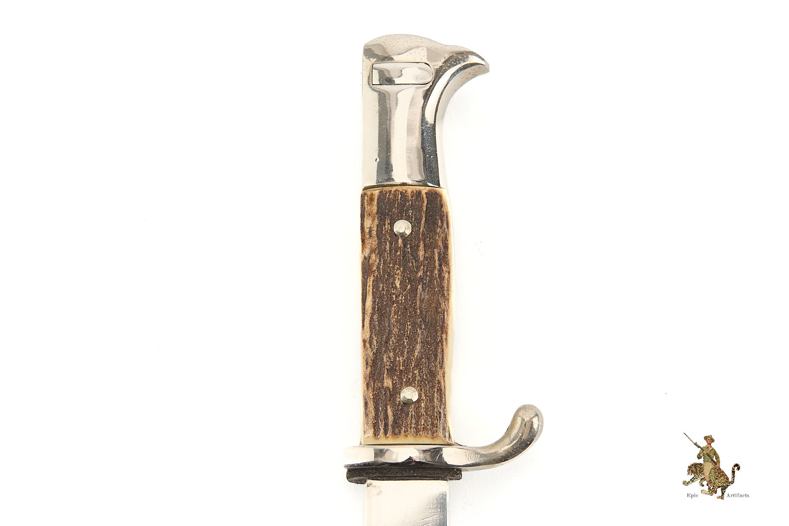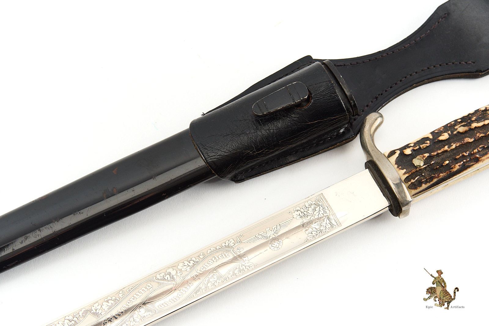 Overall, this Heer Panzer Stag Grip Double Etched Bayonet with Frog represents a finely preserved and visually striking example, combining decorative blade work with strong original components, making it a desirable addition to an advanced collection of German edged weapons.
