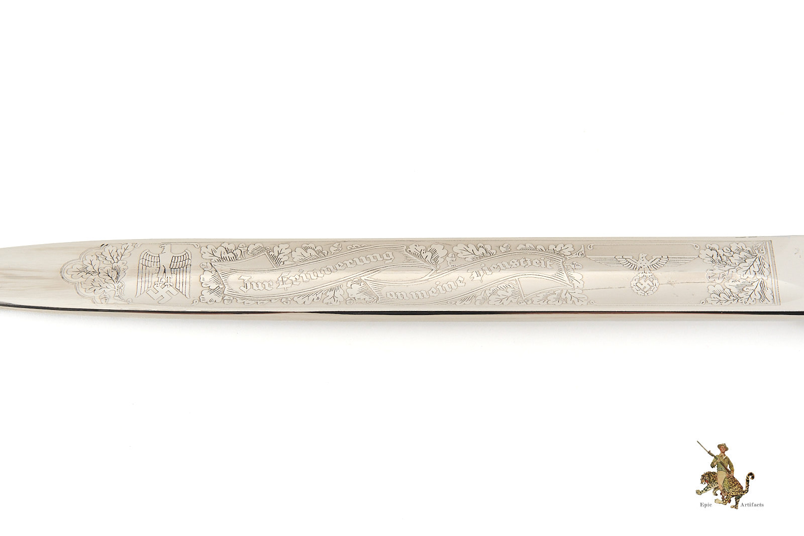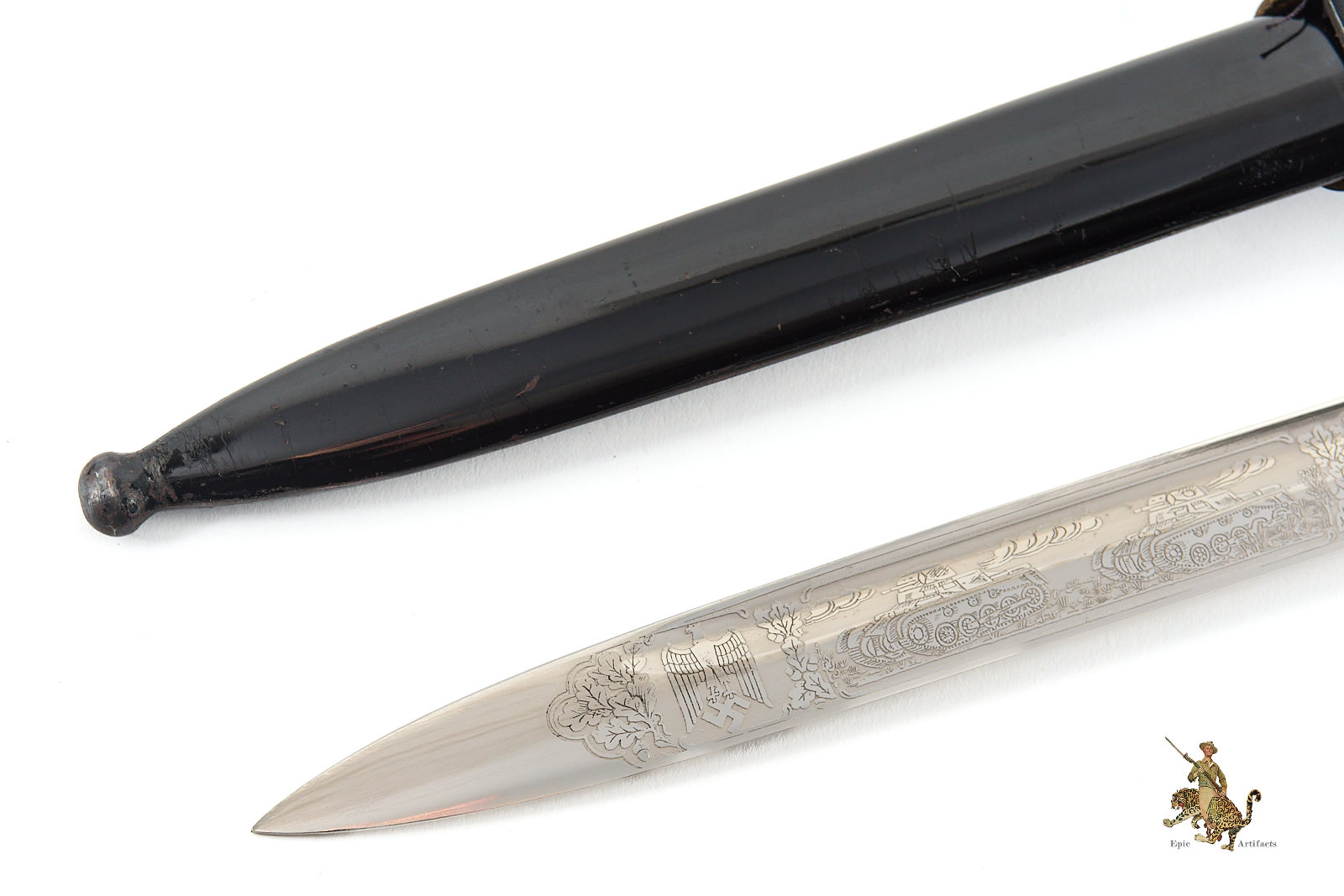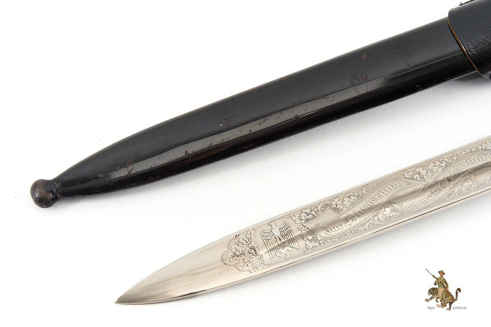 Historical Description: After WWI, the German military, known as the Reichswehr, was restricted to a relatively small force. Hitler changed this in 1935, reintroducing universal military conscription, and creating a new German Armed Forces- the Wehrmacht. Within the Wehrmacht, the German Army was known as the Heer, and a new dagger was designed and introduced for the officers of this new German Army in May 1935. As with all German Army officer uniforms and accoutrements, they were not issued; rather, the officer had to purchase them. These were ceremonial and decorative pieces of regalia, that were worn on occasions that did not call for carrying a sword. The overall pattern and design of the dagger remained consistent throughout the production run, but the large number of individual manufacturers created a wide variety in detail, especially regarding the handle fittings. There were approximately 42 different manufacturers of the blades. There were construction changes over time as well. Early German Army daggers generally featured plated brass alloy handle fittings. Later, zinc was used. Wartime type scabbards were generally unplated, with a gray finish. Production of German Army daggers ceased around 1943. The German Army was a huge organization, and large numbers of these daggers were produced. But there were many specific variants that were produced in low numbers, especially the highest quality, luxury type pieces for well-heeled officers. Some daggers were personalized, and customized, and are unique. The striking and attractive design of the German Army dagger was well-received by officers at the time, and these are very sought-after by collectors today.