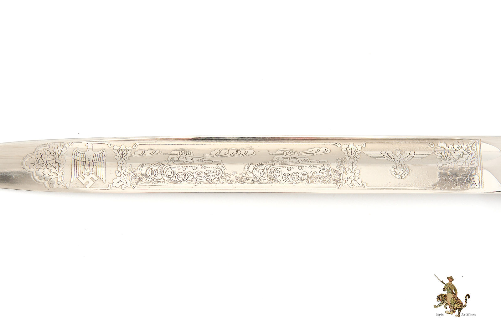 Product Description: A highly attractive Heer Panzer Stag Grip Double Etched Bayonet with Frog, preserved in excellent overall condition and distinguished by its decorative double-etched blade. One side bears the traditional commemorative inscription “Für Erinnerung An Meine Dienstzeit” (“In Memory of My Service Time”), while the opposite side is ornamented with etched depictions of dual Panzer tanks, reflecting its association with armored units.