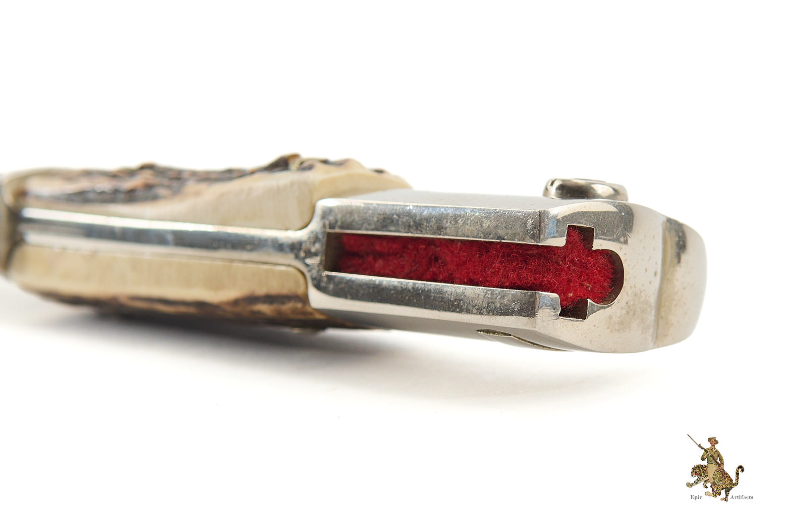 The blade retains the majority of its bright chrome finish, showing only light scratching and expected signs of handling. The hilt is fitted with handsome stag grip scales, both well preserved, and the bayonet release button functions smoothly as intended. A felt spacer remains present within the hilt assembly, and the guard retains its original leather washer.
