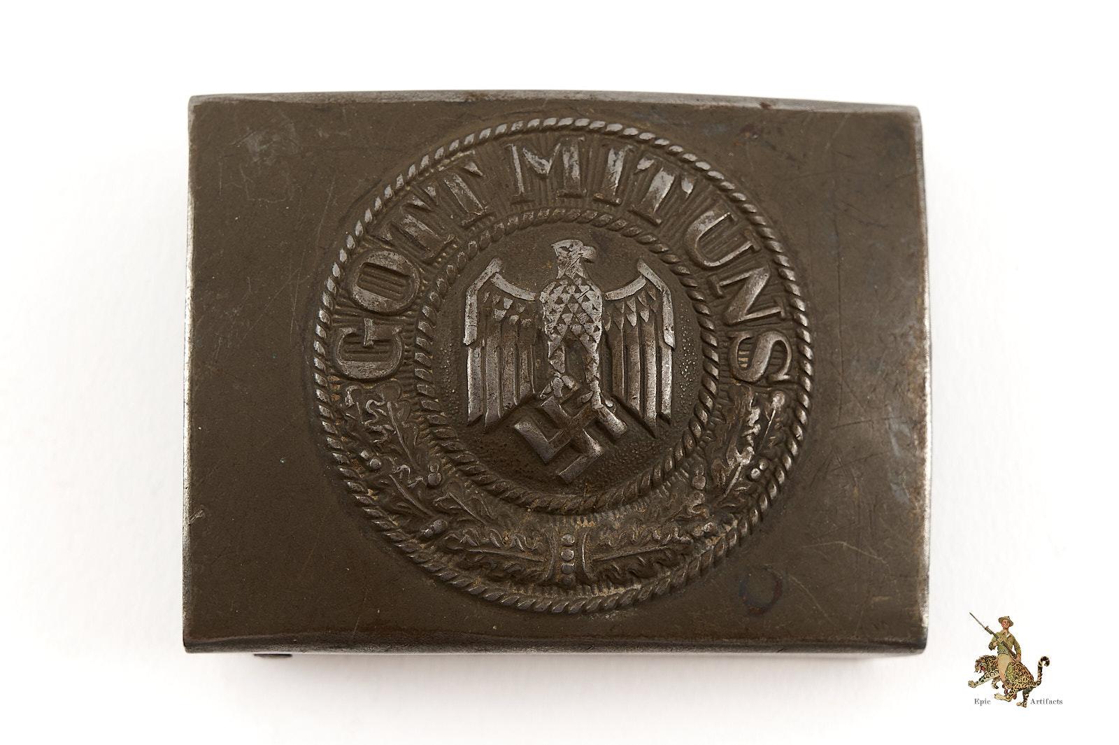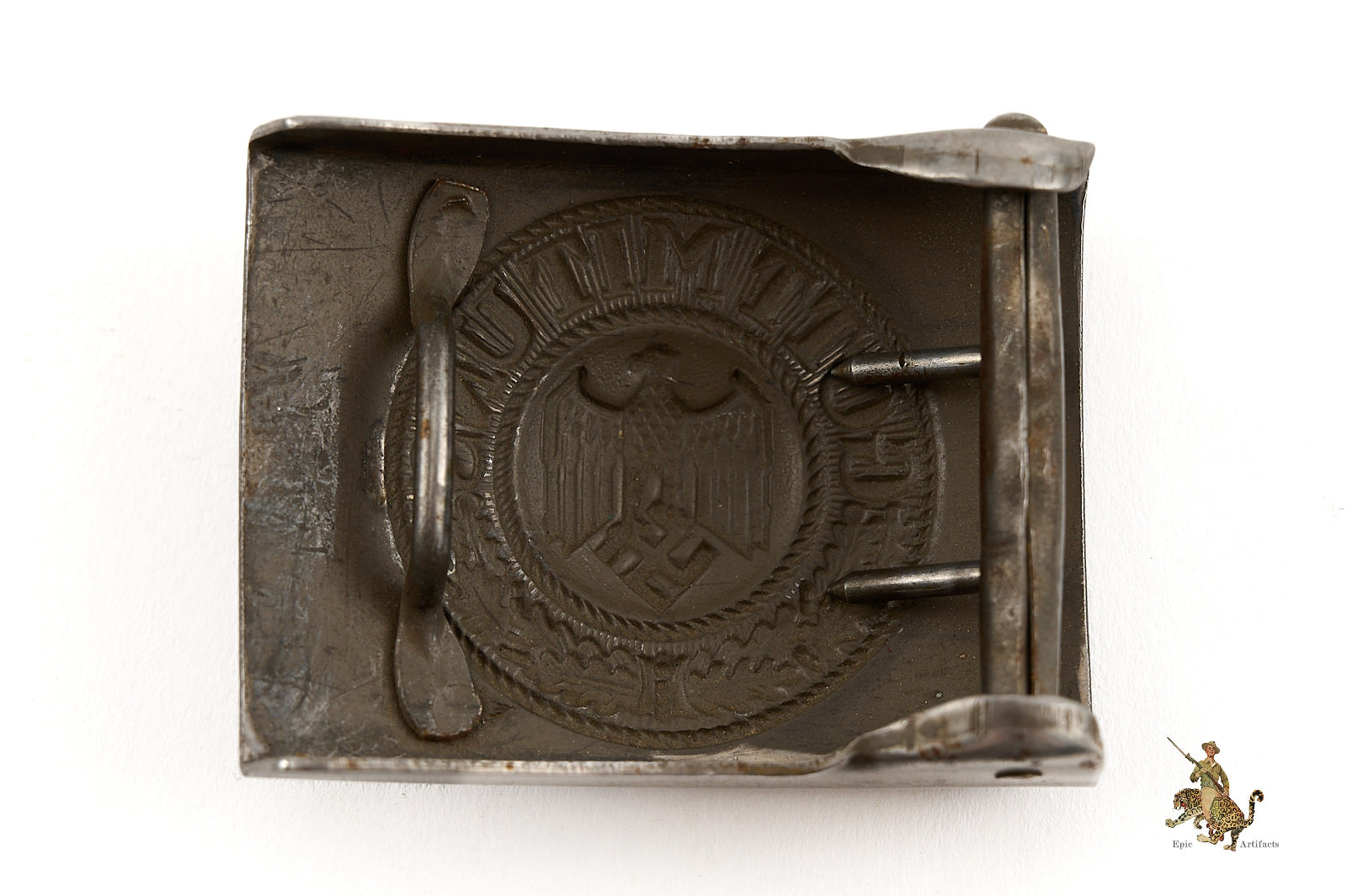 Historical Description: The belt buckle was an important part of the regalia worn by all uniformed military, civil, political and paramilitary organizations during the Third Reich. The belt (“Koppel”) was part of the uniform and would always be worn while on duty. The belt buckle (“Koppelschloss”) was generally specific to each organization, with many organizations having separate belt buckles for officers and for enlisted personnel, sometimes with different colors and finishes to further denote specific purposes. The buckles were adorned with various mottos and designs specific to the organizations for which they were intended. Many designs used the German national eagle emblem, in a variety of forms. Belt buckles were worn with uniforms ranging from finely tailored officer parade uniforms, to the issue uniforms of enlisted soldiers in combat. Generally speaking, most German belt buckles of the Third Reich were made with two prongs on the reverse, to allow the buckle to be worn and adjusted on a belt. The buckle had a catch that would mate with a hook on the belt, when worn. The earliest Third Reich buckles were often made of brass, or nickel silver. Later, aluminum became very common, and was used on private purchase as well as enlisted buckles of the German military, with or without a painted or plated finish. After WWII began, most enlisted military buckles were steel. Nazi belt buckles were popular souvenirs for Allied troops who served in Europe. Some types were made by the millions and remain quite common today. Others were made in limited numbers and are very rare.
