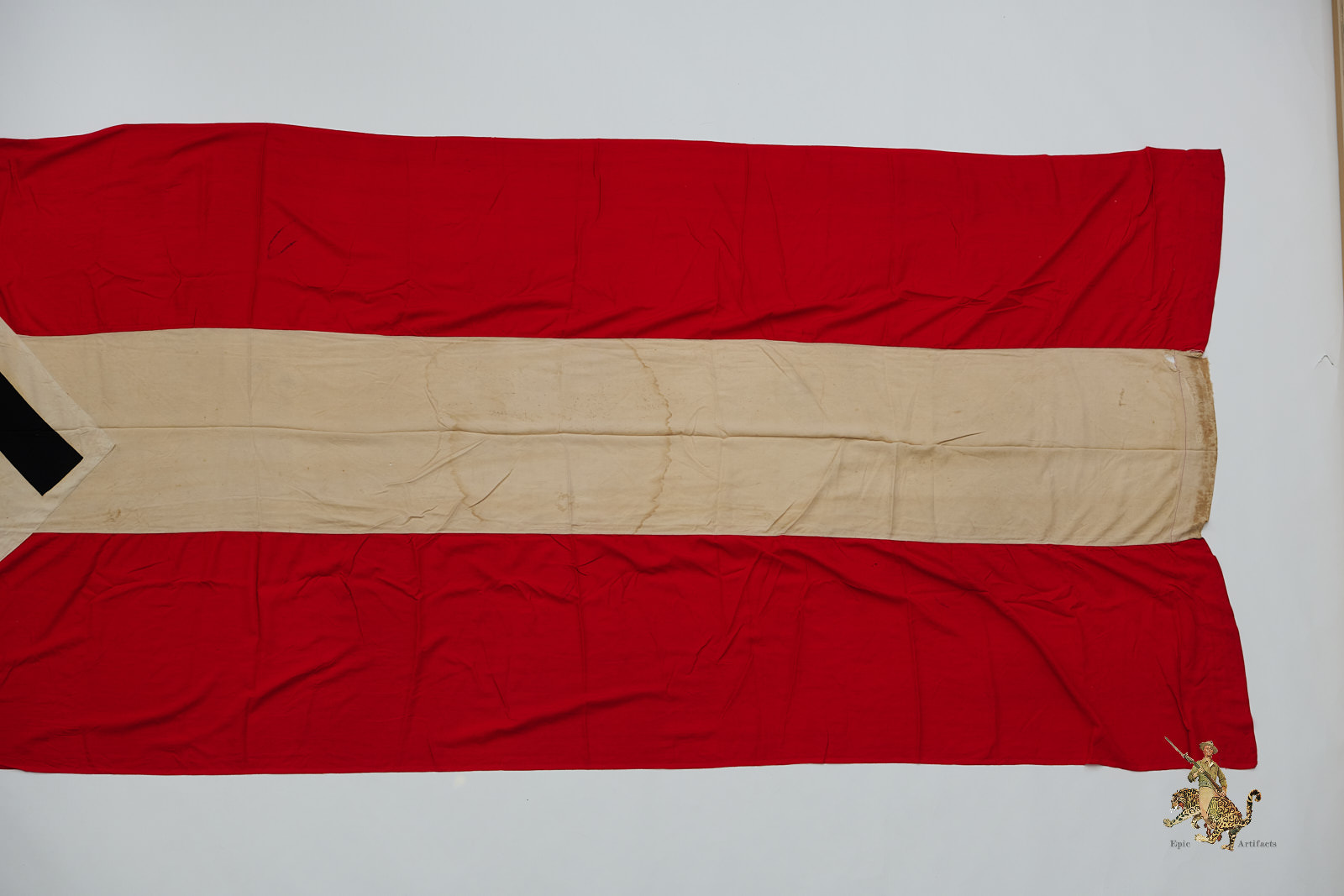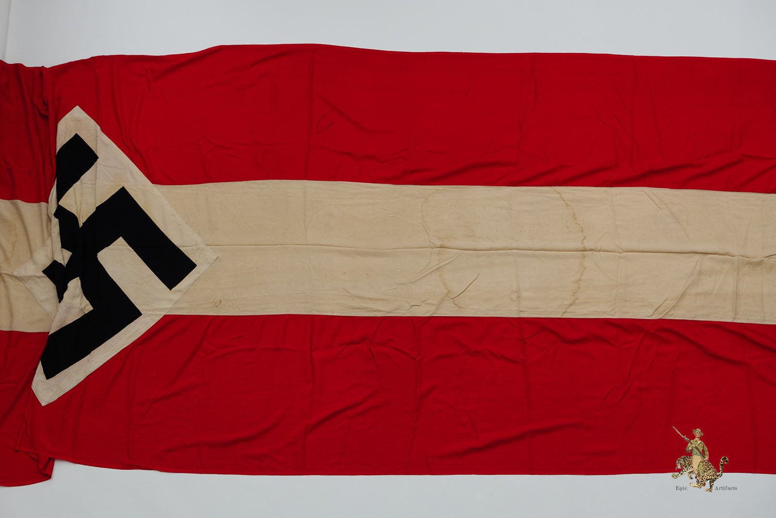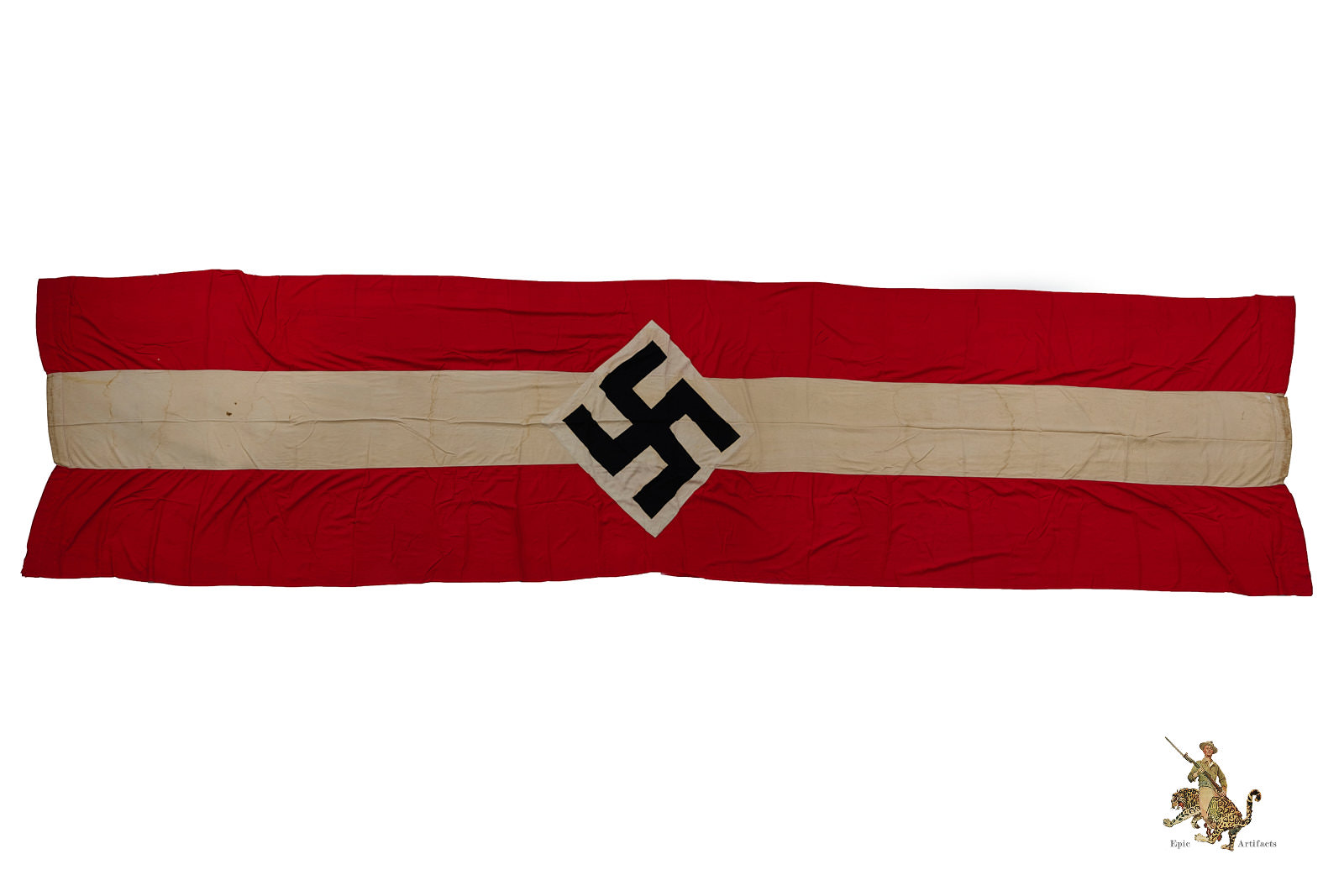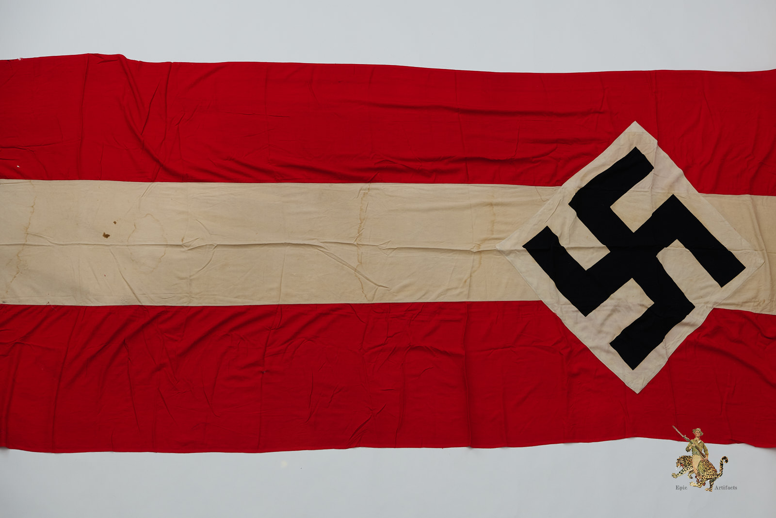 Product Description: This HJ Flag 52″ X 214″ Long window banner is made of a thin polished cotton fabric. A very long window or building banner, this piece measures over 4 ft wide, and close to 17 ft long.  The Banner consists of red panels with a white panel sewn in middle, with printed black swastika on white diamond sewn into middle. Flag is reinforced on each end with folded over and machine sewn ends creating space to mount by pole or rope.  Flag shows tattering and holes mostly towards ends as shown.  Portions of the white cloth show discoloration and staining. The condition rates as very good.