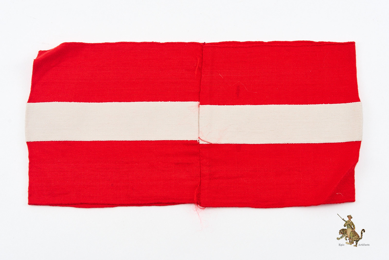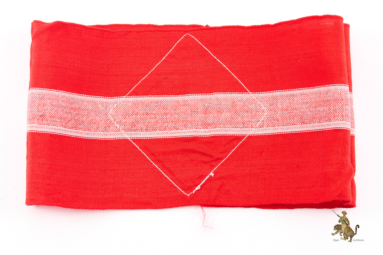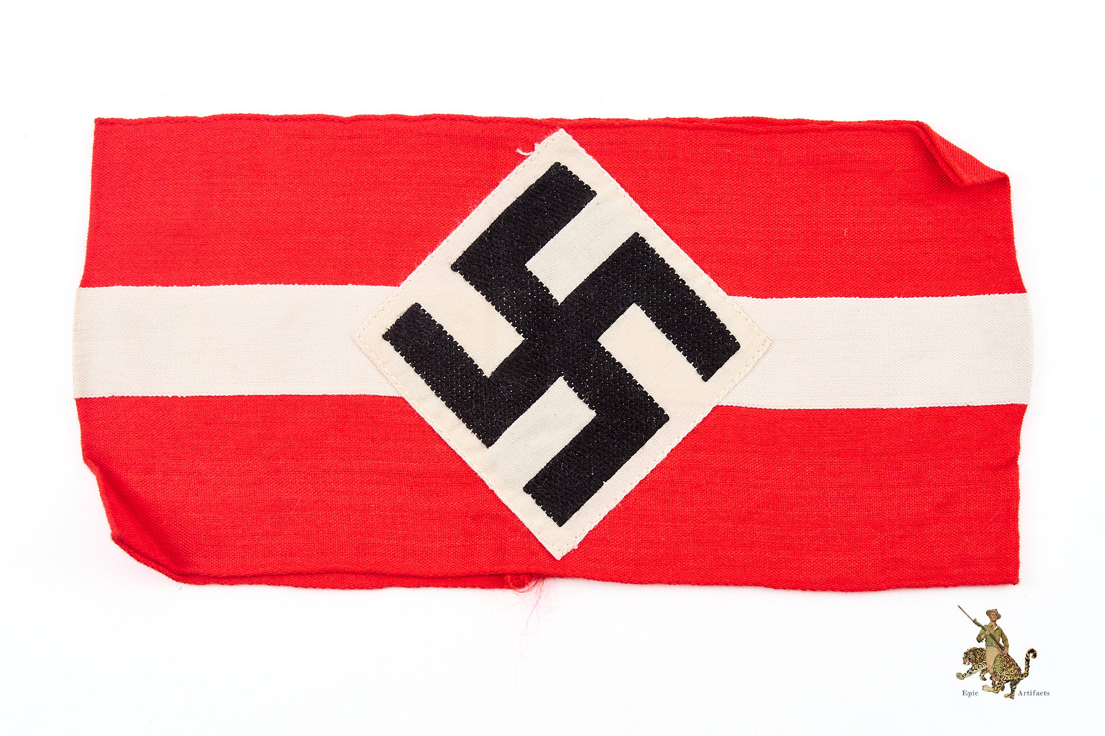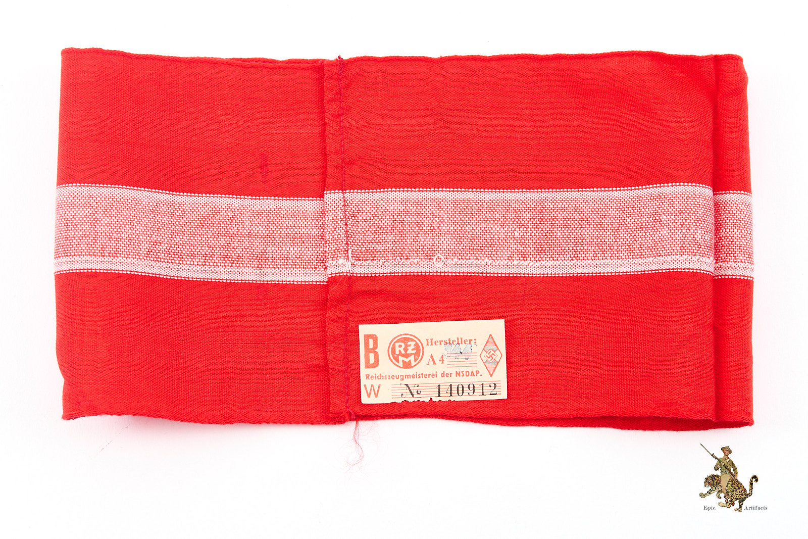Product Description: A well-preserved Hitler Youth HJ Armband with RZM Tag fashioned from red polished cotton with a finely woven white central stripe and featuring a machine-woven swastika diamond securely stitched to the band. The edges are typical woven edge, and the ends are cleanly joined, reflecting careful original construction. The Obverse shows little to no wear and the color remains clean and vibrant. Inside the armband remains the original RZM tag marked to maker A4/344.  The reverse shows a few stray threads, but they do not affect the integrity of the armband.  Desirable for its condition and integrity, this Hitler Youth HJ Armband represents an appealing and collectible specimen of its type, rating as excellent ++ for the period.