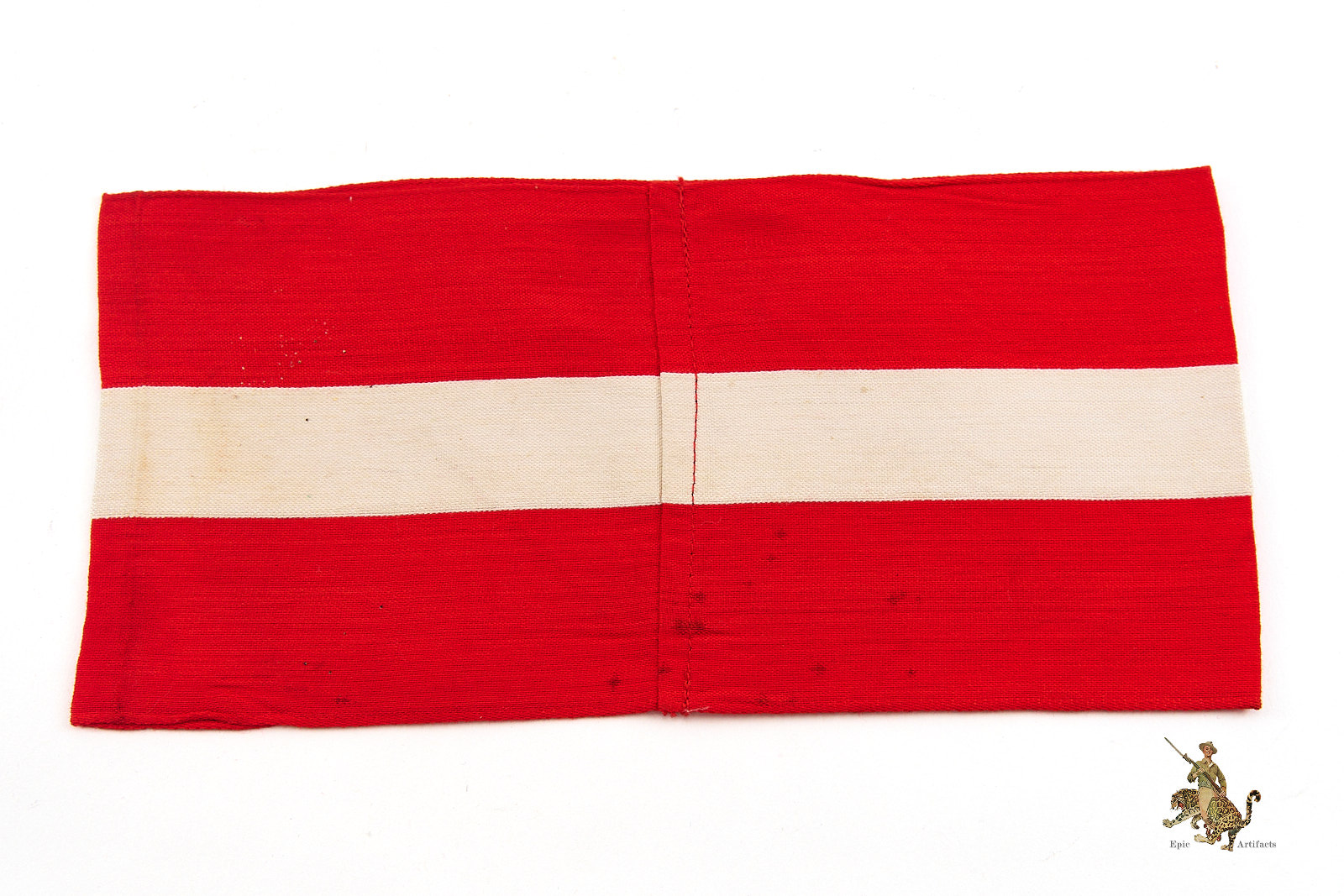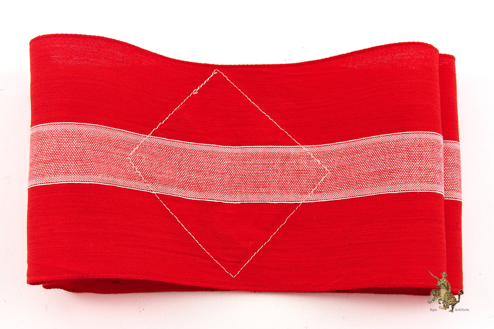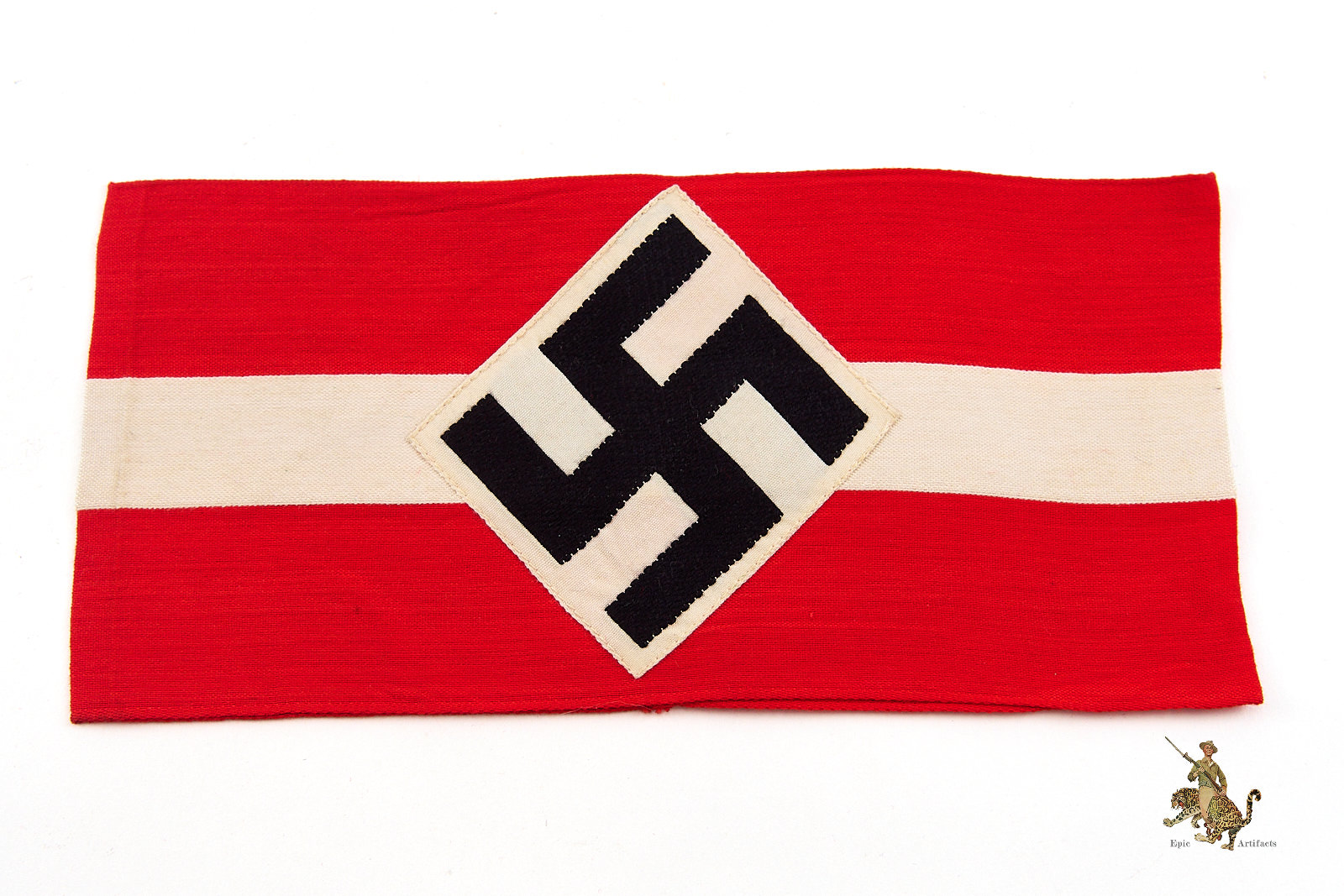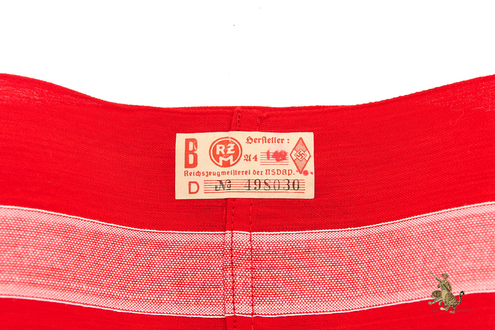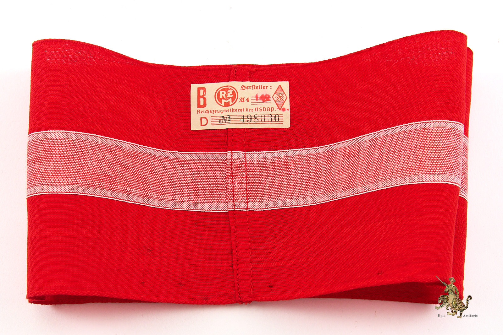 Product Description: A well-preserved Hitler Youth HJ Armband with RZM Tag fashioned from red cotton with a finely woven white central stripe and featuring a machine-woven swastika diamond securely stitched to the band. The edges are neatly machine-finished, and the ends are cleanly joined, reflecting careful original construction. The Obverse shows light discoloration primarily to the white areas, attests to authentic age and wear without detracting from its overall presentation. Reverse shows minor spotting from age. Inside the armband remains the original RZM tag marked to maker A4/149. Desirable for its condition and integrity, this Hitler Youth HJ Armband represents an appealing and collectible specimen of its type, rating as excellent ++ for the period.
