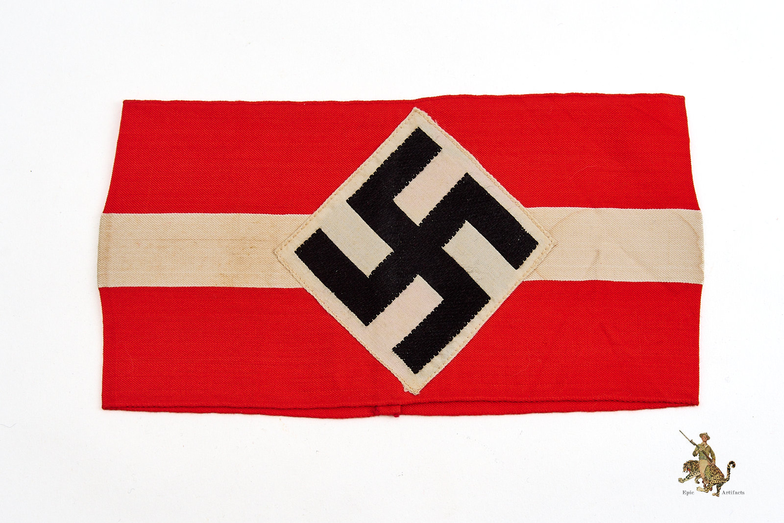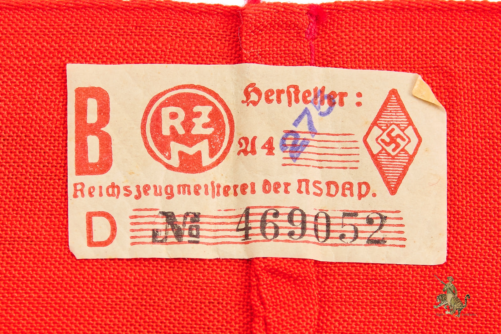 Product Description: A well-preserved Hitler Youth HJ Armband with RZM Tag fashioned from red cotton with a finely woven white central stripe and featuring a machine-woven swastika diamond securely stitched to the band. The edges are neatly machine-finished, and the ends are cleanly joined, reflecting careful original construction. The Obverse shows light discoloration primarily to the white areas, attests to authentic age and wear without detracting from its overall presentation. Reverse shows two spots of tape residue from being mounted in an album or frame. Inside the armband remains the original RZM tag marked to maker A4/275. Desirable for its condition and integrity, this Hitler Youth HJ Armband represents an appealing and collectible specimen of its type, rating as excellent for the period.