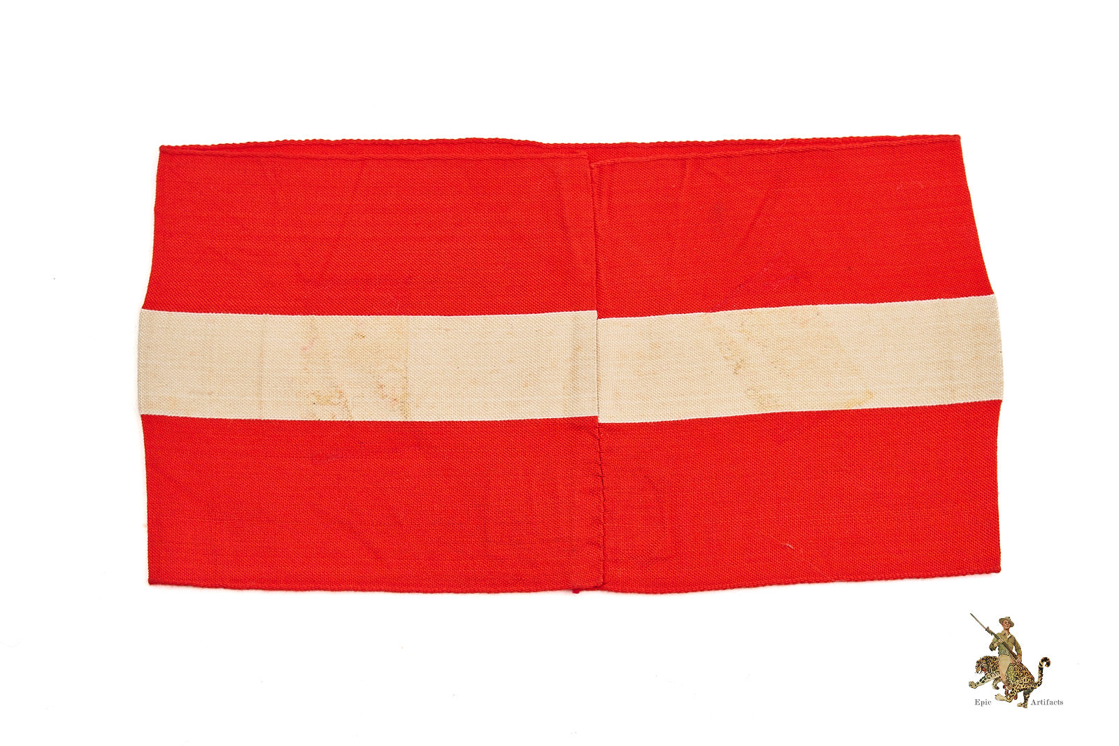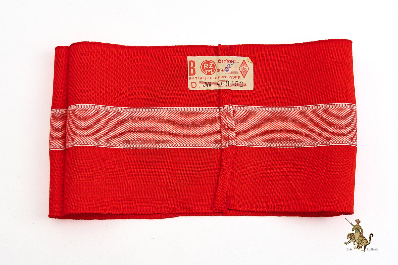 Historical Description: Nearly every military, civil, political and paramilitary organization in existence during the Third Reich used armbands. Armbands were worn on military and civilian uniforms and also on civilian clothes, from suit jackets to work clothing. They were used to denote membership in organizations, to indicate a specific role or function of the bearer, and as insignia of rank. Many organizations would change the design of their armbands over time, which added to the variety produced. These were manufactured in countless variations, ranging from simple printed bands to elaborately hand-embroidered pieces of the highest quality. Some Nazi armbands were worn by all members of large organizations and were made by the millions. Others were intended for use at a specific time and place and were unique. Many types were made in very limited numbers. Some bore metal insignia or special identifiers that indicated the wearer’s rank, unit affiliation, or nationality. Armbands were sometimes but not always marked with ink stamps by the issuing authorities.