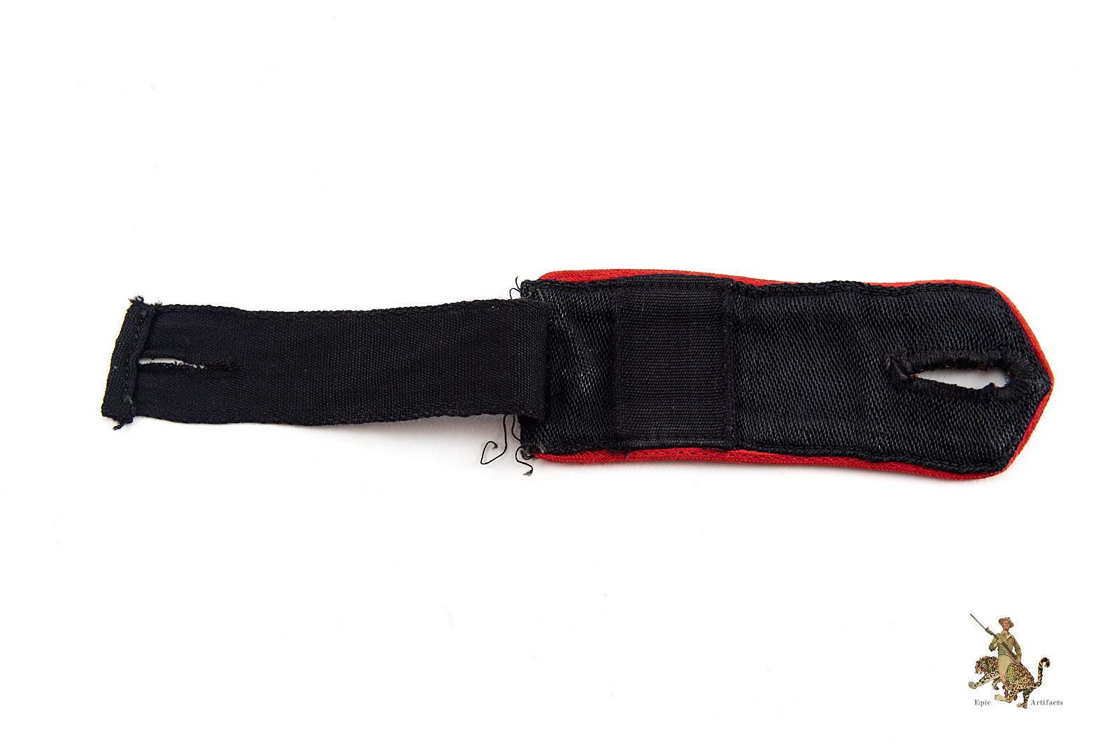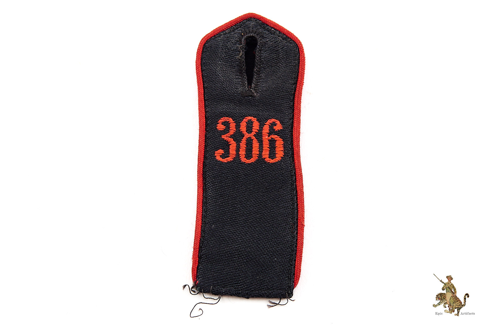 Product Description: A single Hitler Youth Shoulder Board Bann 386 slip-on shoulder strap displaying period construction and appealing originality. Worked in polished cotton with rayon piping, the piece is embroidered with the designation for Bann 386, showing only modest wear and a few loose threads consistent with light use. Evidence of prior attachment to a uniform is present yet unobtrusive, enhancing its authenticity without detracting from its overall appearance.