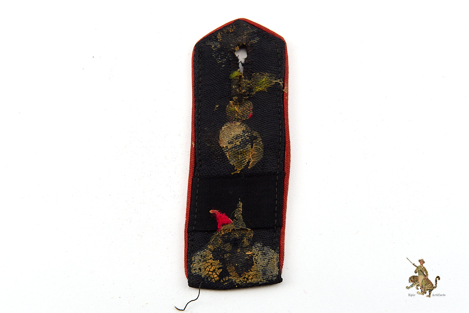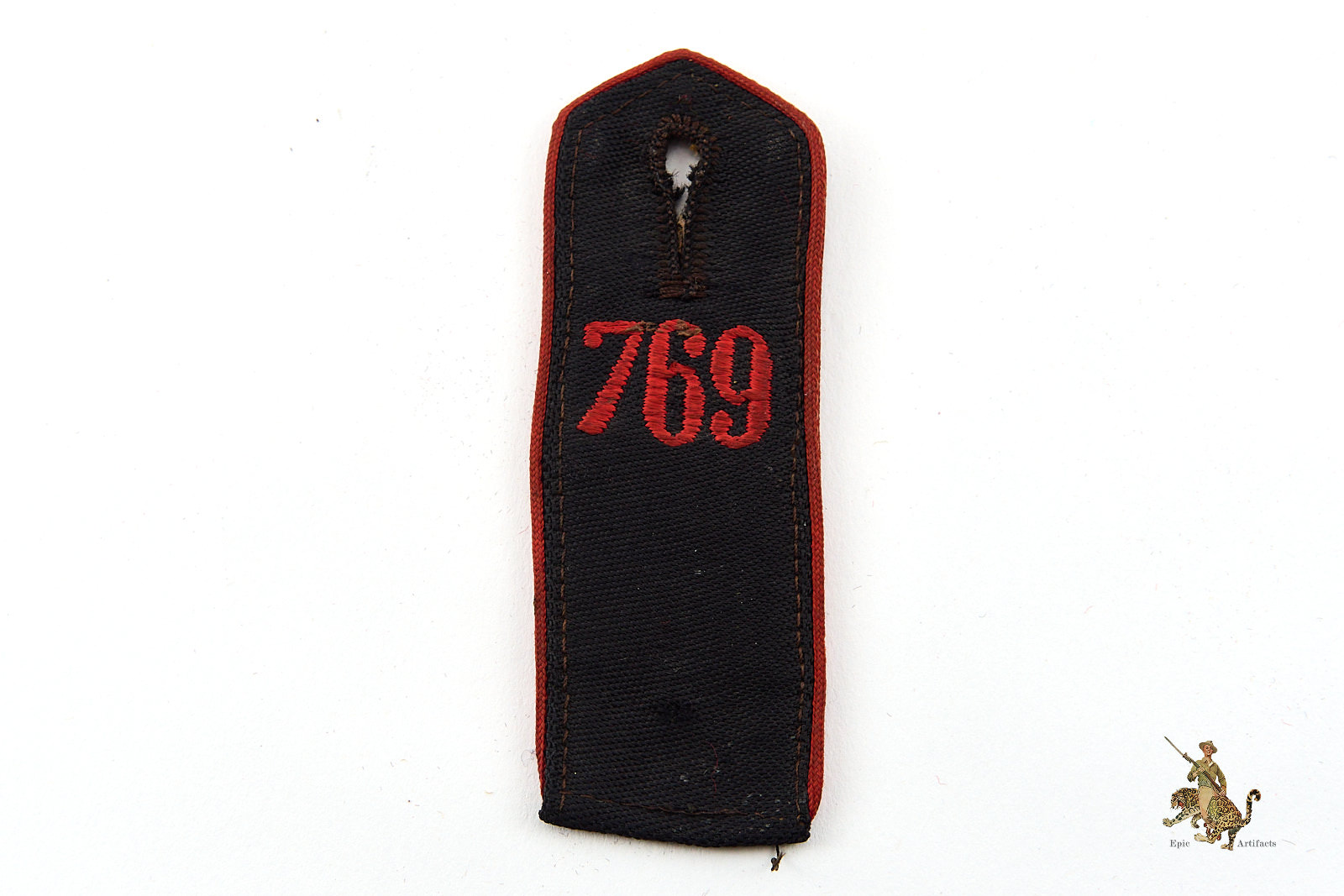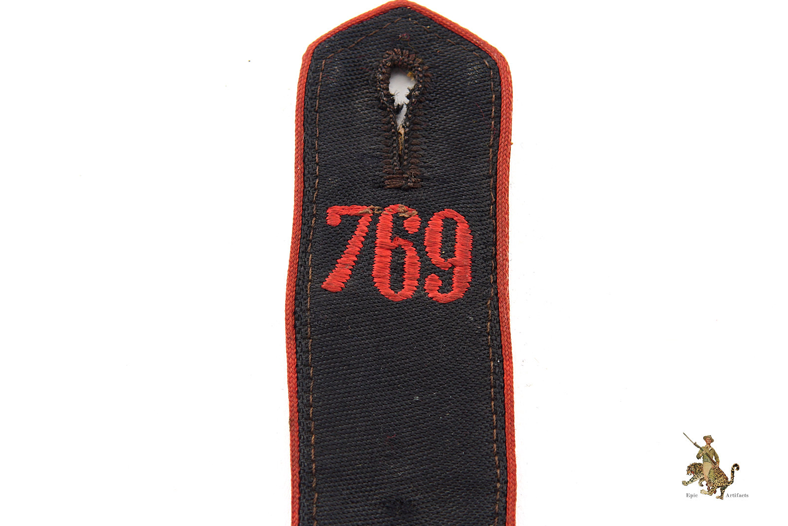 Product Description: A single Hitler Youth Shoulder Board Bann 769 sew in shoulder strap displaying period construction and appealing originality. Worked in polished cotton with rayon piping, the piece is embroidered with the designation for Bann 769, showing only modest wear and a few loose threads consistent with light use. Evidence of prior attachment to a uniform is present yet unobtrusive, enhancing its authenticity without detracting from its overall appearance.  The reverse of this strap shows glue residue from being mounted in an album.