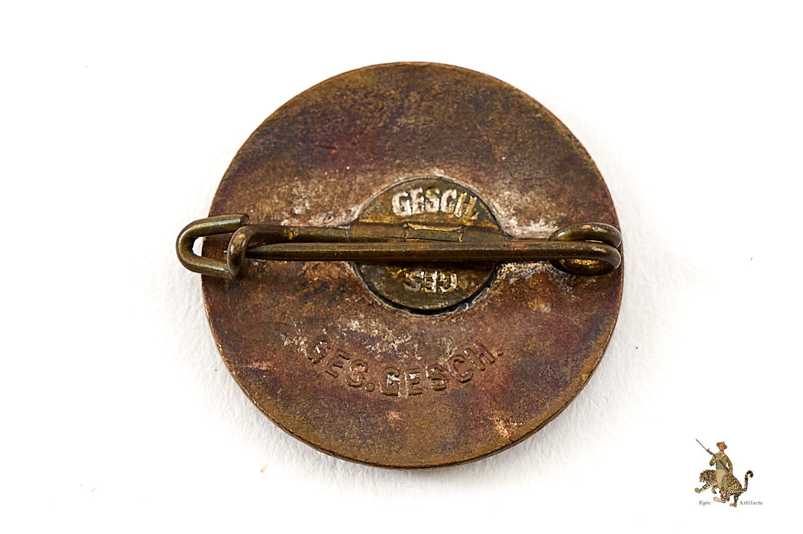 Product Description: An early example of the HJ Hitler Youth 1st Pattern Membership Pin, featuring the distinctive enameled obverse with a black swastika rising from a stylized sunburst, encircled by the inscription “H.J. Deutsche Arbeiter Jugend”. The red and black enamel retains strong color with only light surface wear consistent with age.