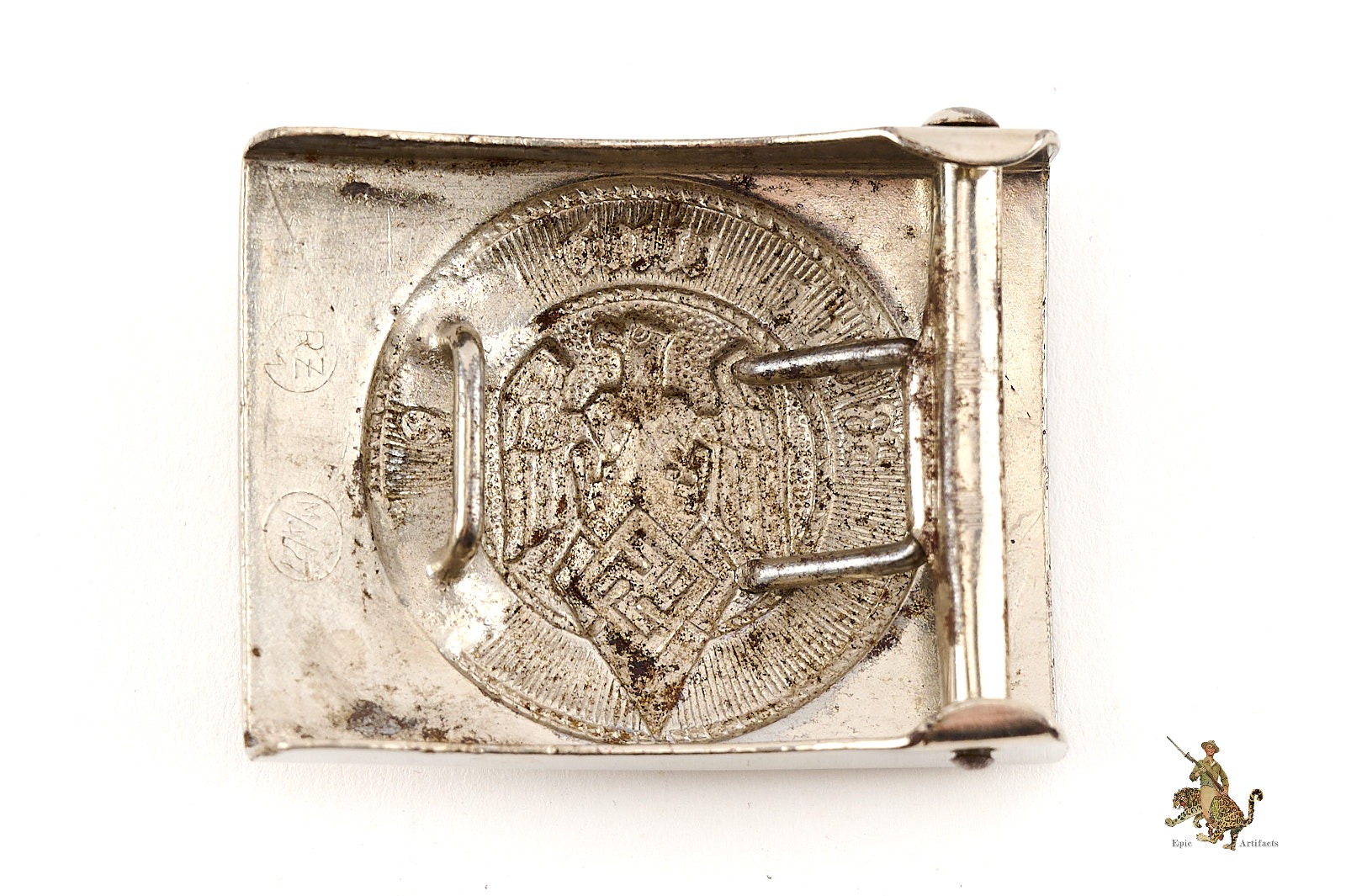 Historical Description: The belt buckle was an important part of the regalia worn by all uniformed military, civil, political and paramilitary organizations during the Third Reich. The belt (“Koppel”) was part of the uniform, and would always be worn while on duty. The belt buckle (“Koppelschloss”) was generally specific to each organization, with many organizations having separate belt buckles for officers and for enlisted personnel, sometimes with different colors and finishes to further denote specific purposes. The buckles were adorned with various mottos and designs specific to the organizations for which they were intended. Many designs used the German national eagle emblem, in a variety of forms. Belt buckles were worn with uniforms ranging from finely tailored officer parade uniforms, to the issue uniforms of enlisted soldiers in combat. Generally speaking, most German belt buckles of the Third Reich were made with two prongs on the reverse, to allow the buckle to be worn and adjusted on a belt. The buckle had a catch that would mate with a hook on the belt, when worn. The earliest Third Reich buckles were often made of brass, or nickel silver. Later, aluminum became very common, and was used on private purchase as well as enlisted buckles of the German military, with or without a painted or plated finish. After WWII began, most enlisted military buckles were steel. Nazi belt buckles were popular souvenirs for Allied troops who served in Europe. Some types were made by the millions and remain quite common today. Others were made in limited numbers and are very rare.