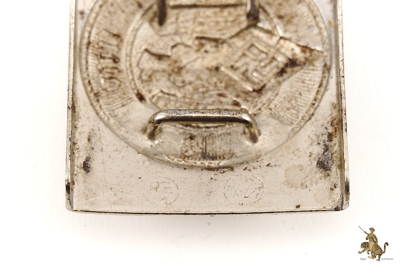 Product Description: A bright and well-detailed example of the Hitlerjugend (Hitler Youth) belt buckle, executed in chromed metal and marked RZM M1/27, denoting manufacture by Overhoff & Cie., Lüdenscheid. The front displays the iconic HJ diamond emblem over a mobile swastika, surrounded by a raised circular border.