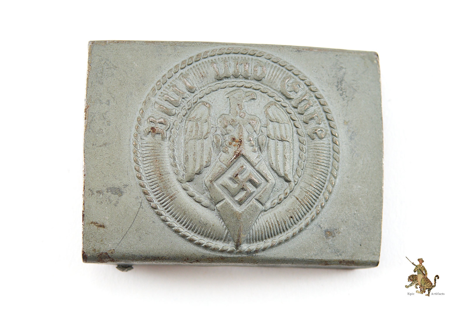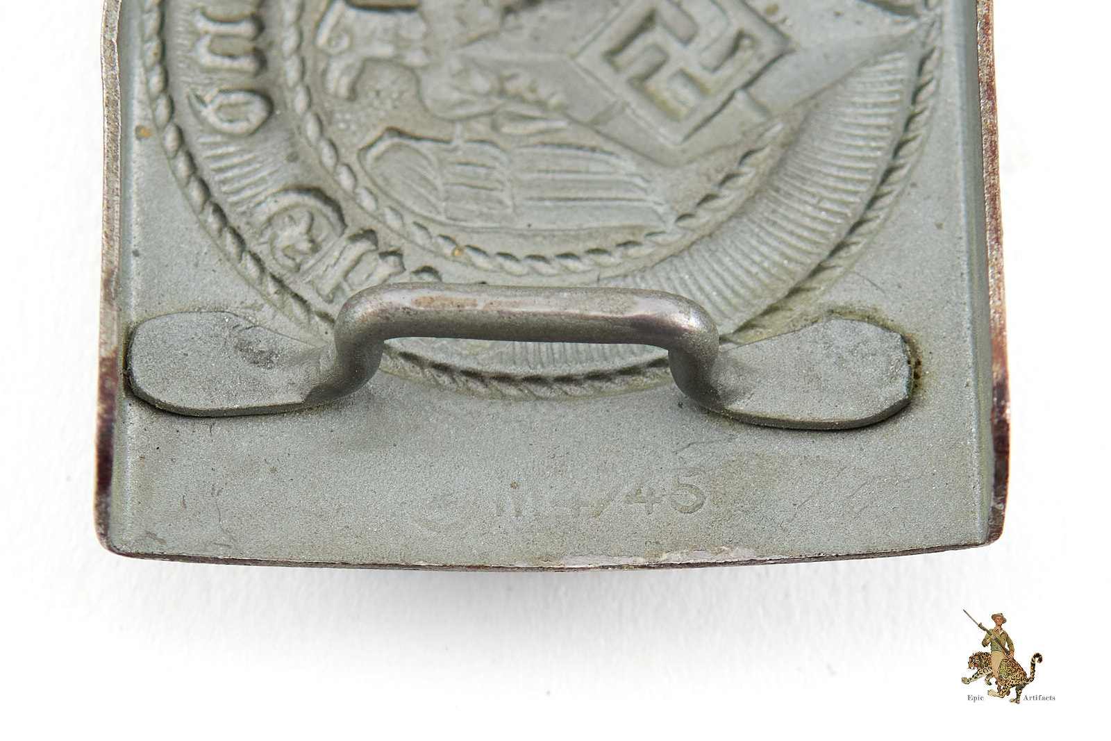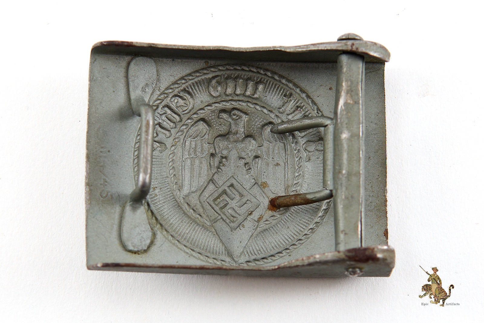 Product Description: This Hitler Youth Belt Buckle by RZM M4/45 is a nice, attractive example of the standard buckle worn by the Hitlerjugend (HJ). This one is constructed out of a single piece of stamped steel, and likely dates from the war years. The obverse of the buckle shows only very light wear, with some minor loss to the finish showing the steel below. The details to the eagle, motto and roundel are super showing wear only to the high points. The reverse of this buckle is clearly maker marked “RZM M4/45,” indicating manufacture by the firm of Cramer & Dombach, Lüdenscheid. The steel welded catch remains intact, and the steel roller bar and prong assembly is complete and functional, with no issues. This Hitler Youth Belt Buckle by RZM M4/45 measures approximately 2 7/16 inch wide by 1 7/8 inches high, and remains in excellent condition.