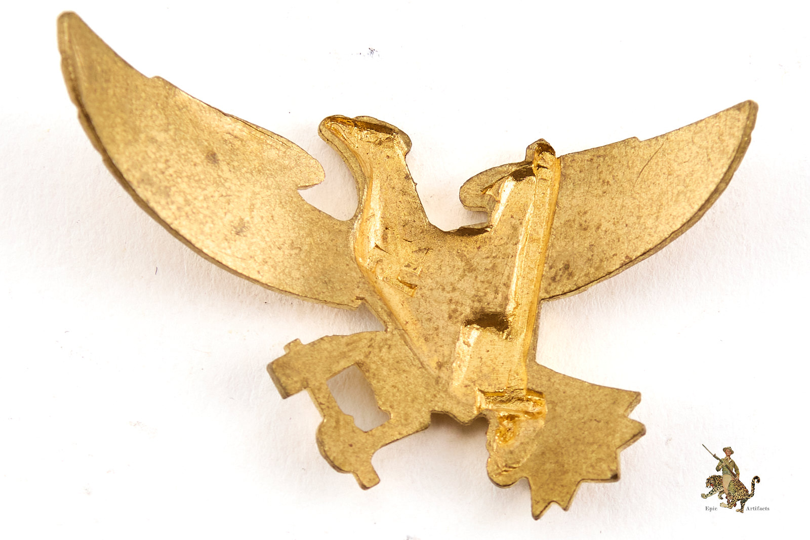 Product Description: A finely preserved HJ Hitler Youth Bugle Eagle, die-stamped in gilt tombak and exhibiting outstanding original finish. Measuring approximately 2 inches across the wings, the eagle shows a gentle curve yet appears never to have been affixed to a bugle, retaining exceptionally sharp detail throughout. The gilt surface remains remarkably intact, with only the slightest wear to the high points, highlighting the quality of the strike and the integrity of the original finish.
