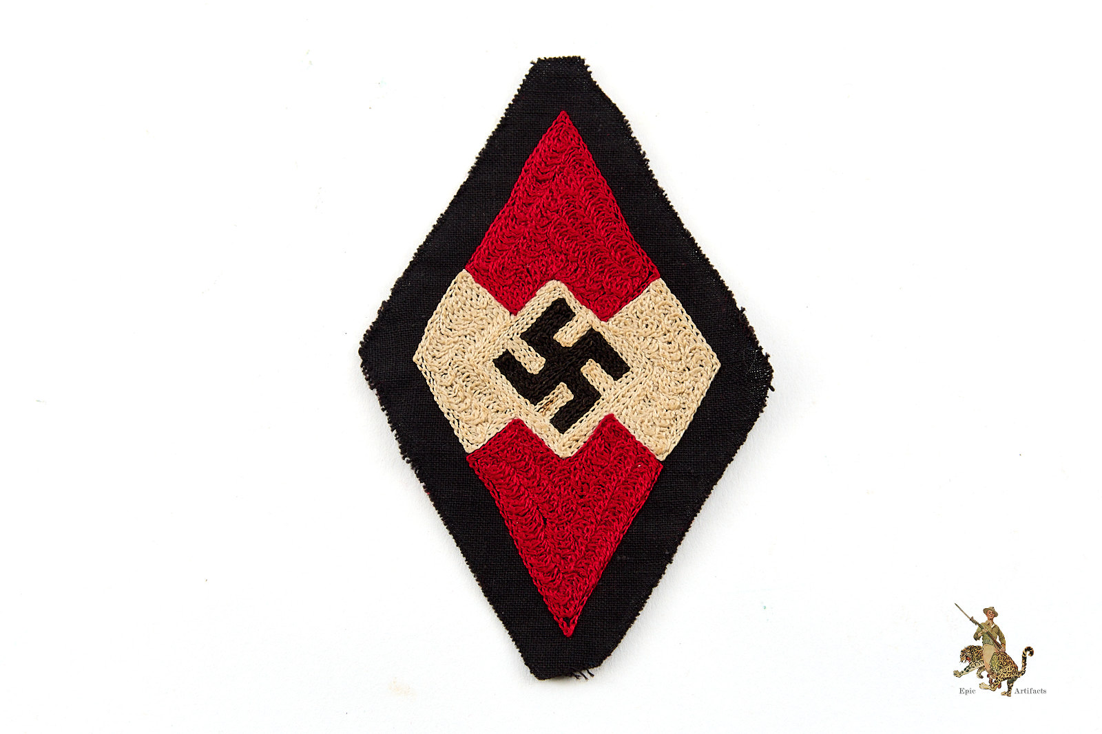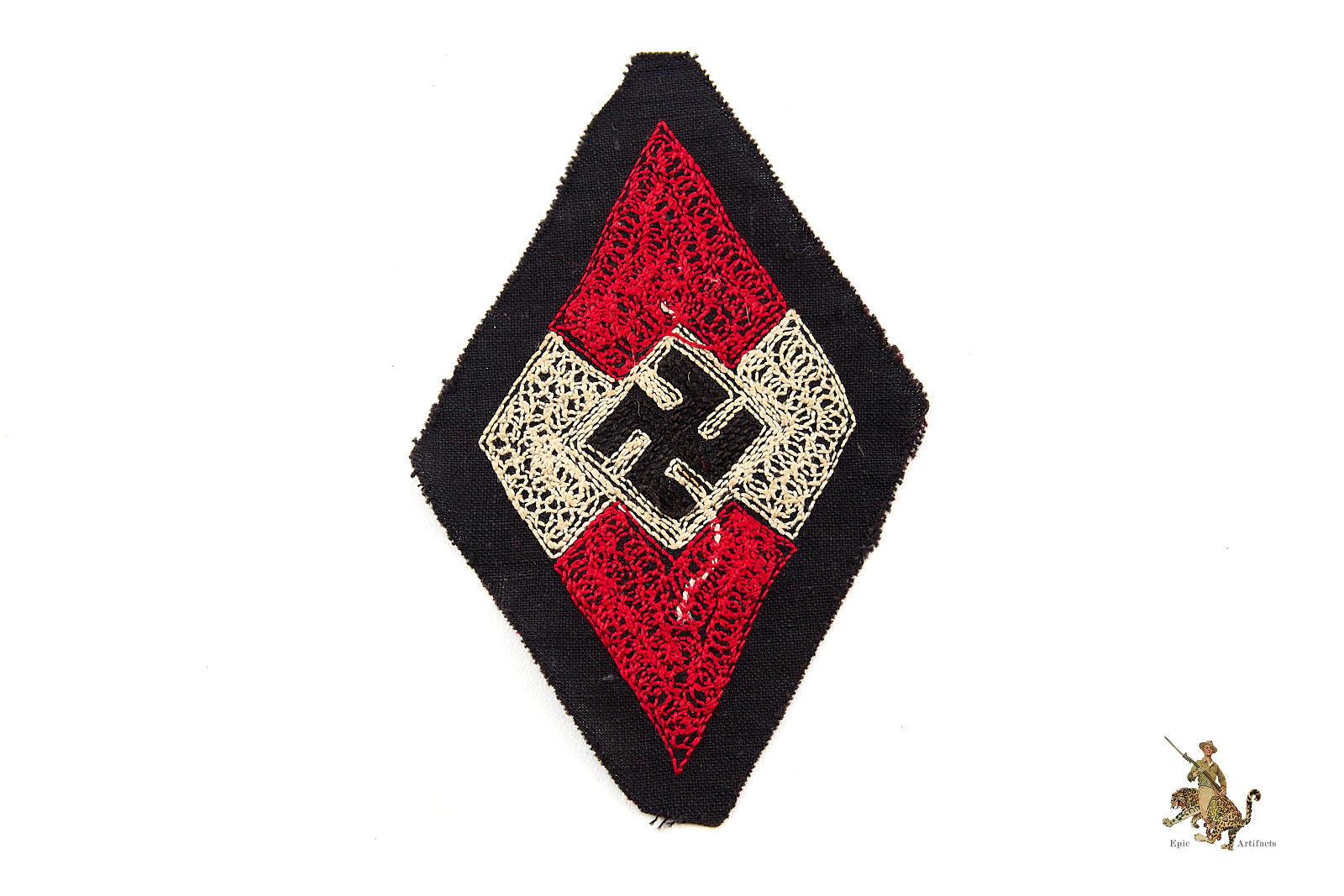 Product Description: A rare original HJ Hitler Youth Diamond Insignia – Chain Stitch, presented here in unissued form. Insignia is chain stitched onto thin black cotton material. Offered unissued, the badge measure approximately 3 inches wide by 4.5 inches long overall. Insignia rates as excellent plus condition with only minor signs of wear from age and storage.