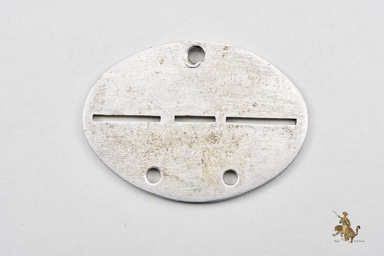 Product Description: This German WWII Home Horse Hospital ID Tag, commonly referred to as a dog tag is made of aluminum and features the stamped details of the soldier, including unit designation and unique identification numbers.  Disc is perforated to allow for breaking into two halves in case of death.  Has some surface dings and wear consistent with age.  This Home Horse Hospital ID Tag remains in excellent condition, with clear, legible stamping and minimal wear, showing careful preservation.