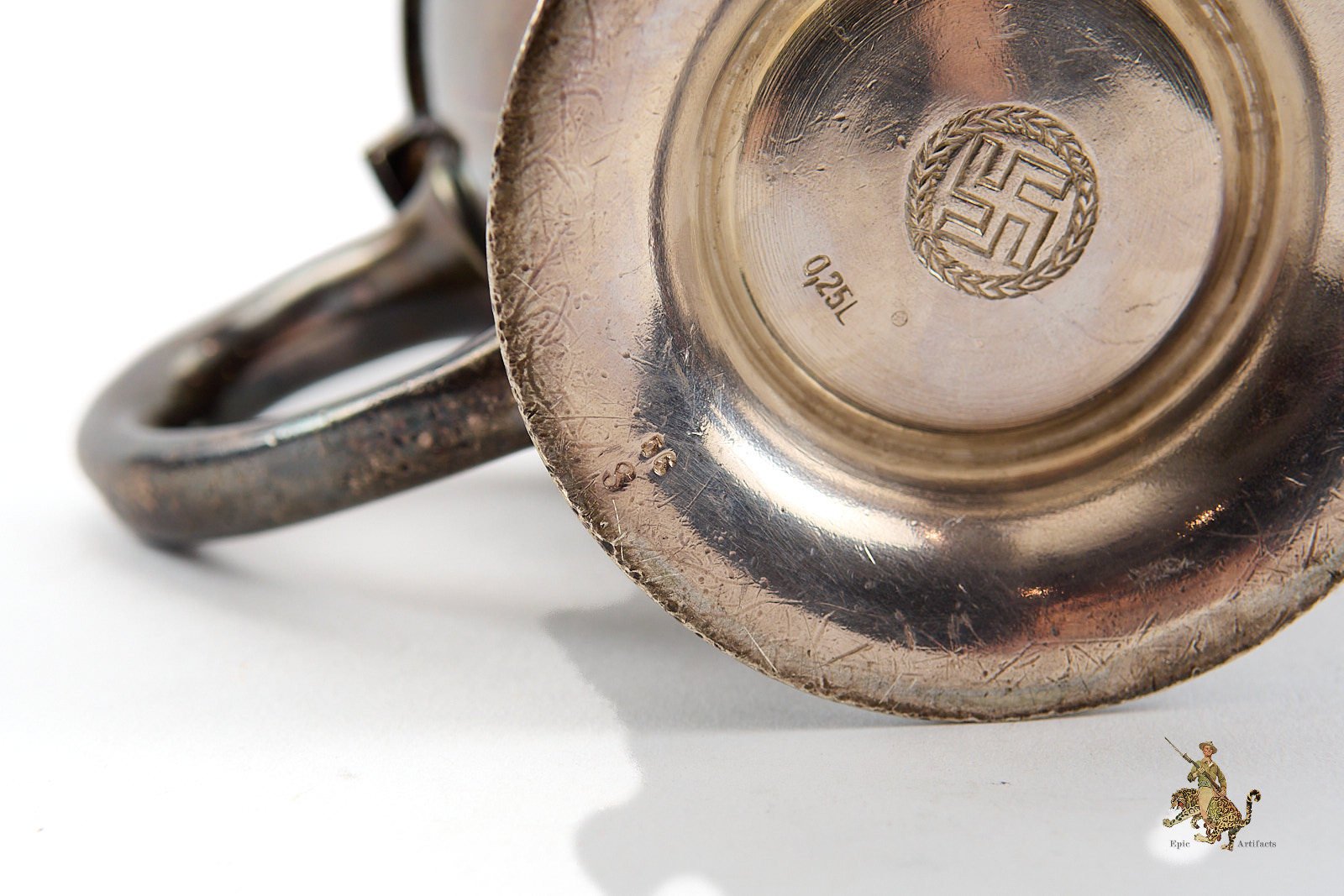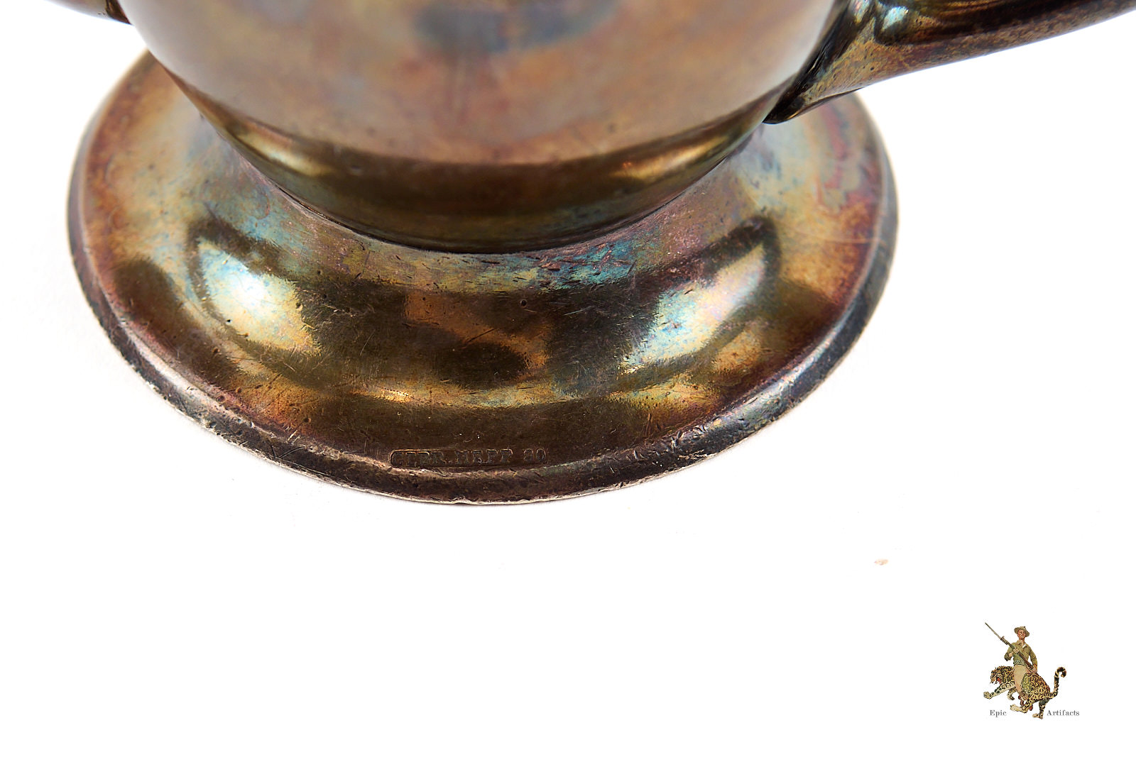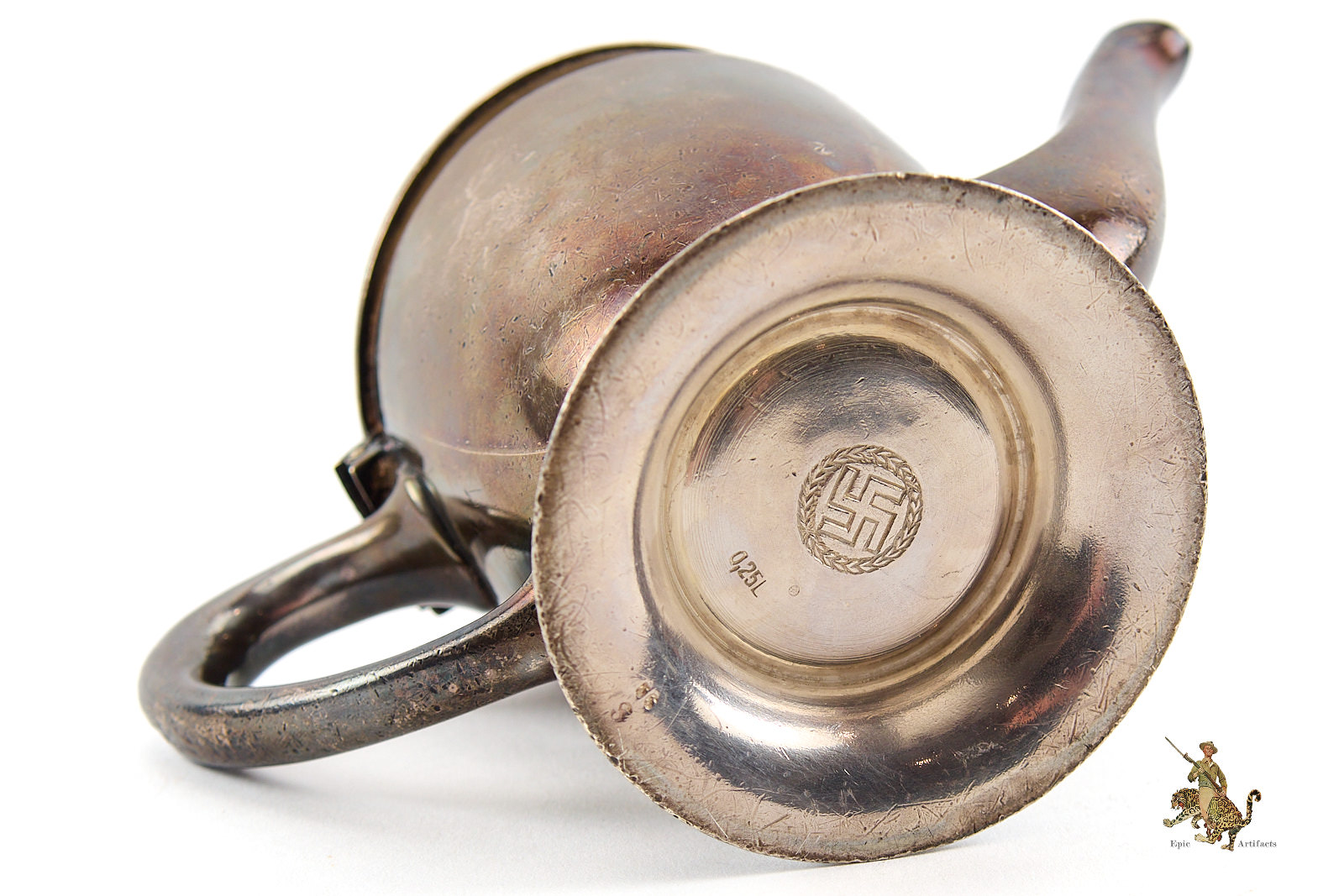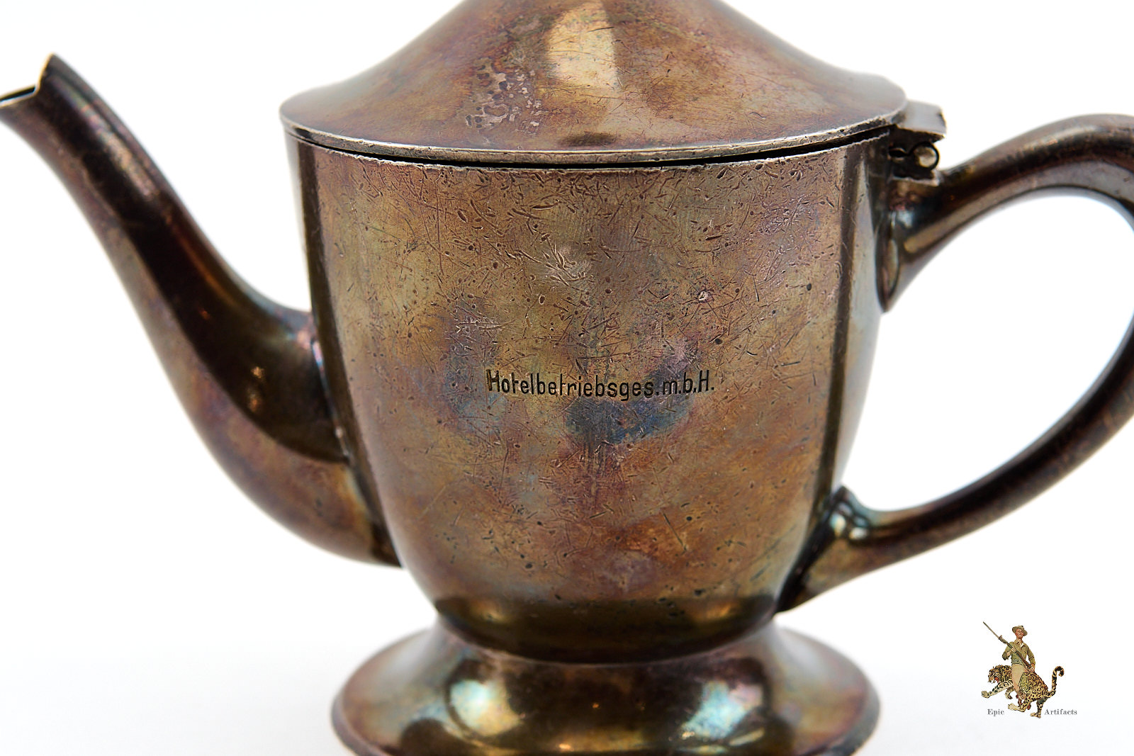 Product Description: An Original German NSDAP Silver Teapot, marked Hotelbetriebsges.m.b.H. Manufactured by the renowned firm Gebrüder Hepp of Pforzheim, the piece is executed in heavy silver-plated Alpaca metal, exhibiting the classic, understated design favored during the era. The hinged lid is firmly secured and operates as intended. Teapot measures approximately 5″ tall and 7″ from tip to handle.