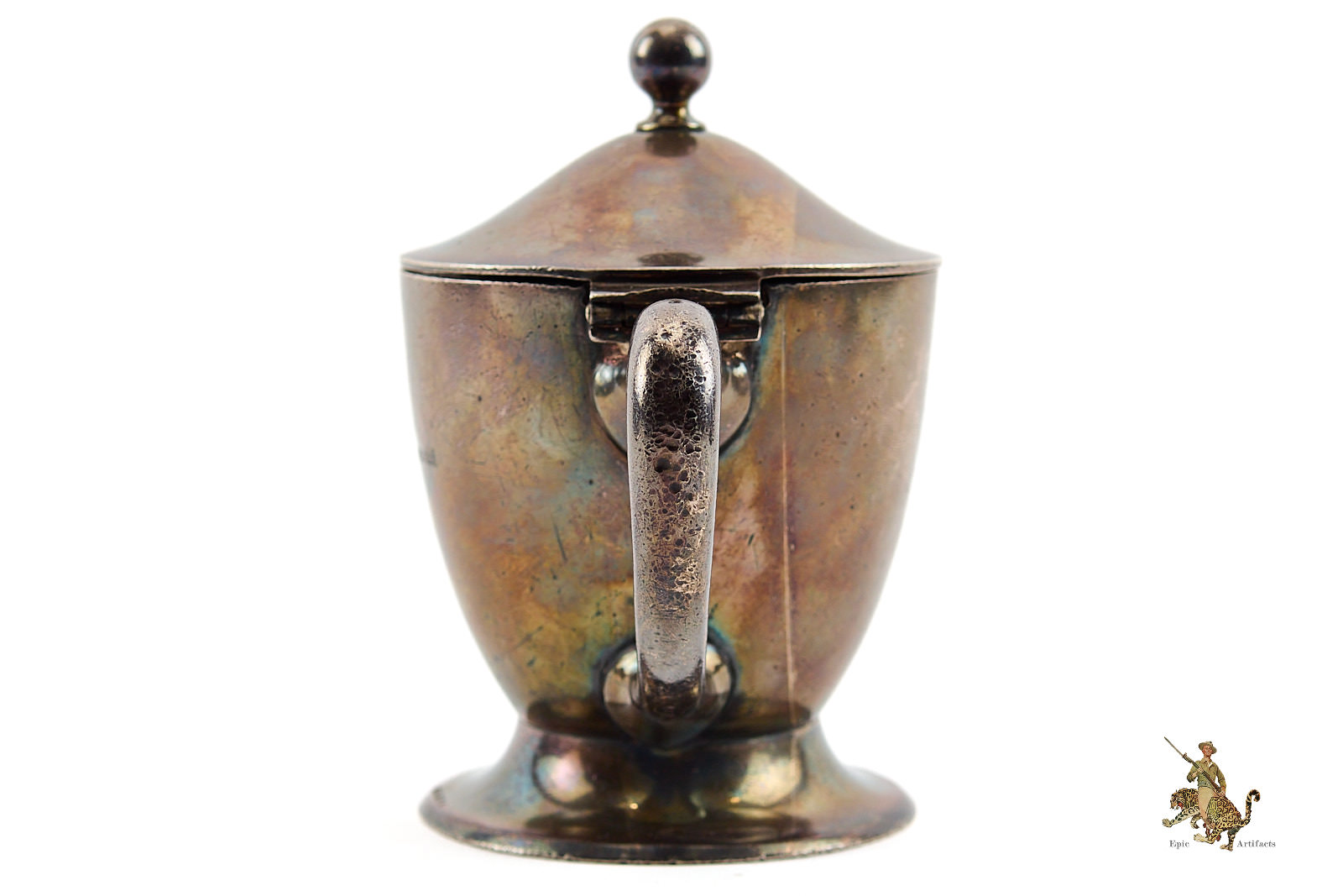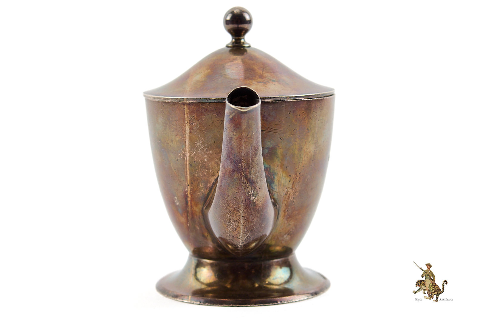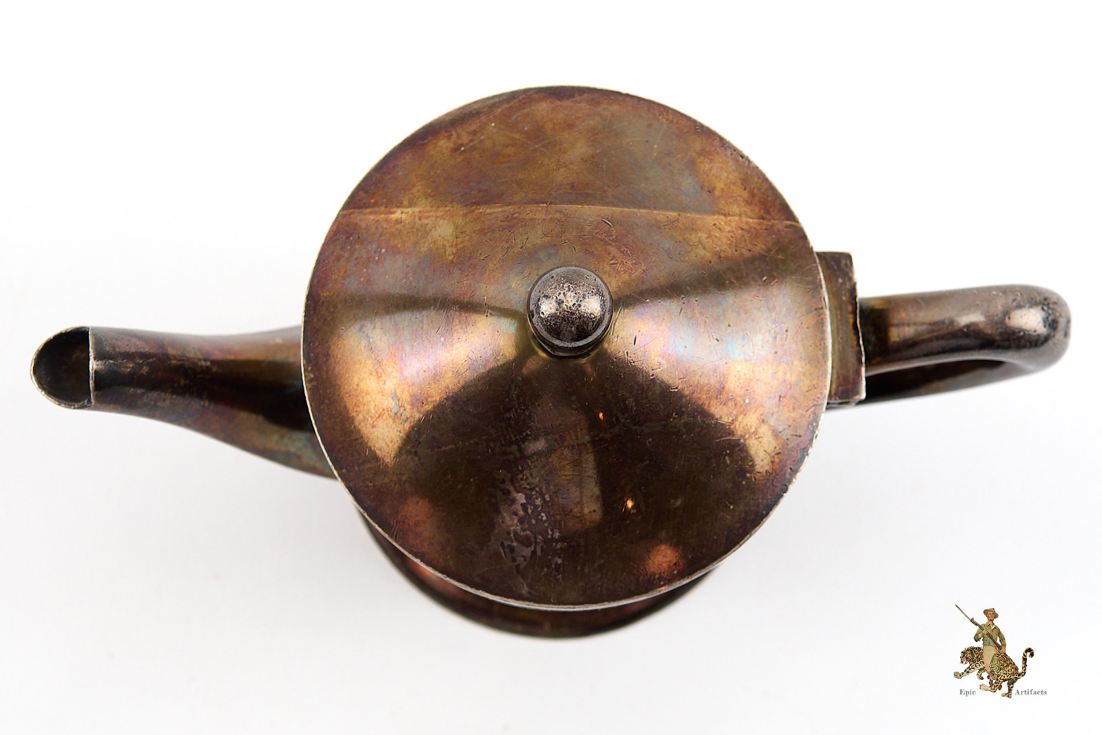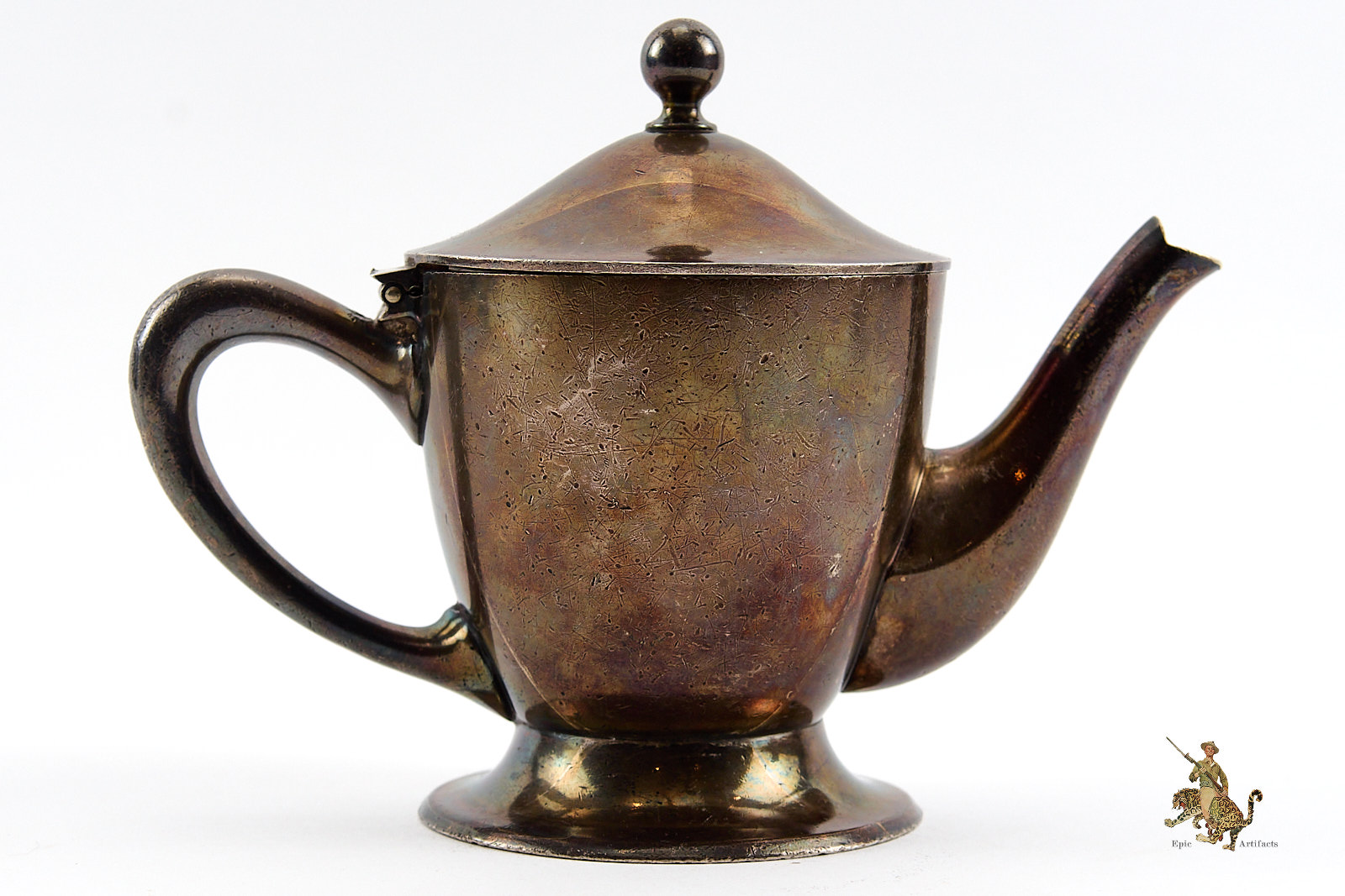 Product Description: An Original German NSDAP Silver Teapot, marked Hotelbetriebsges.m.b.H. Manufactured by the renowned firm Gebrüder Hepp of Pforzheim, the piece is executed in heavy silver-plated Alpaca metal, exhibiting the classic, understated design favored during the era. The hinged lid is firmly secured and operates as intended. Teapot measures approximately 5″ tall and 7″ from tip to handle.