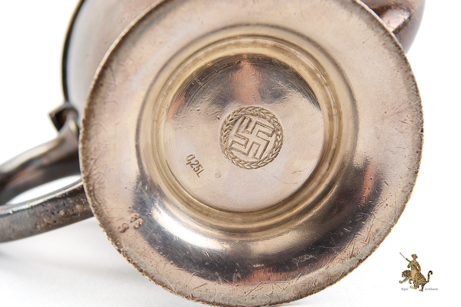 An exceptional and historically significant example of Third Reich hotel silver service, this Original German NSDAP Silver Teapot represents the refined yet ideologically marked aesthetic of official hospitality under the Nazi regime, as seen in the serviceware of the Hotel Salzburger Hof, then among the most prestigious hotels in the Reich.