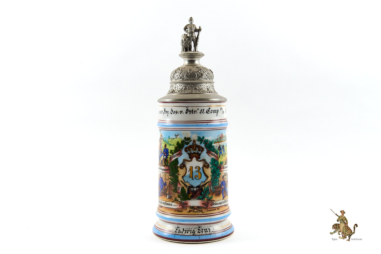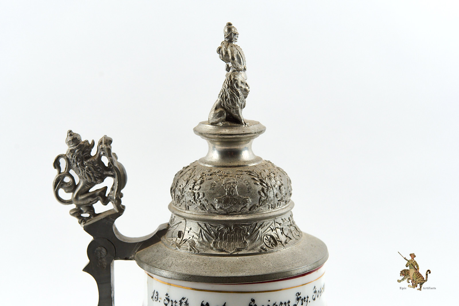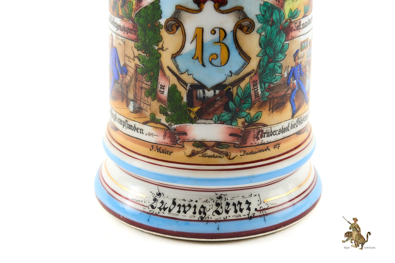 This Imperial Infantry Regiment No 13 Stein is an nice example of an infantry regimental stein, notable for its artistry, vivid preservation, and strong provenance to a named soldier. Such pieces offer both historical and aesthetic appeal, reflecting the pride and tradition of service in the Imperial German Army at the dawn of the twentieth century.