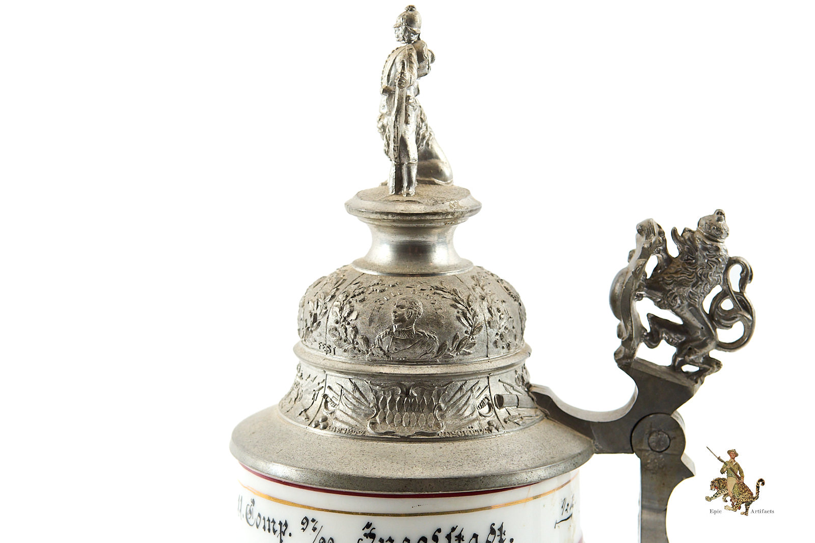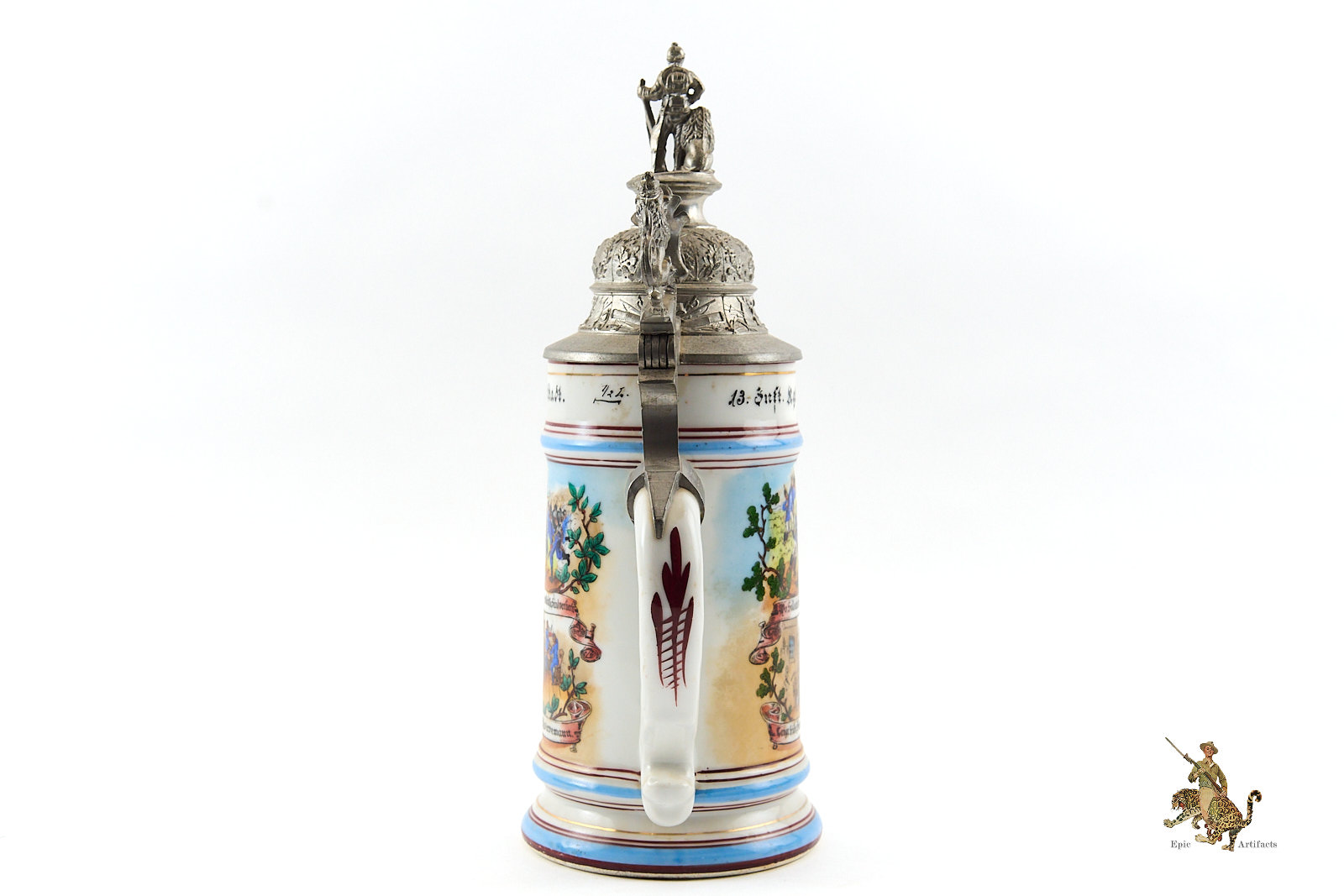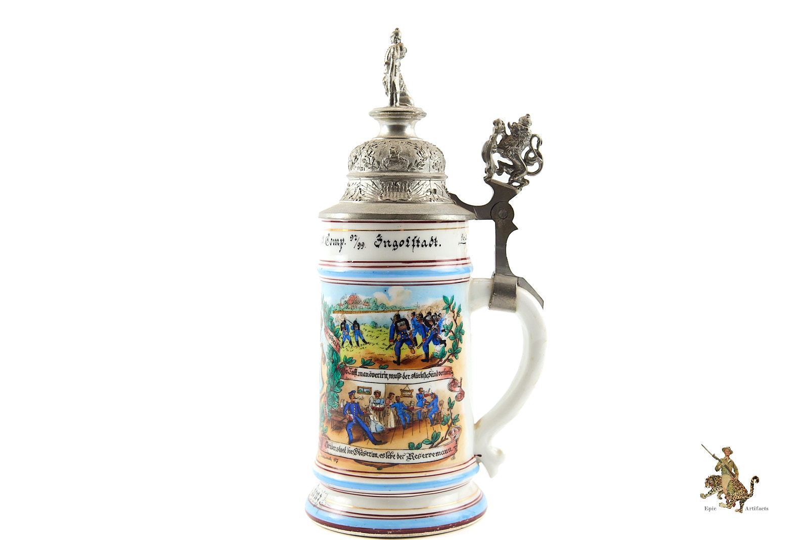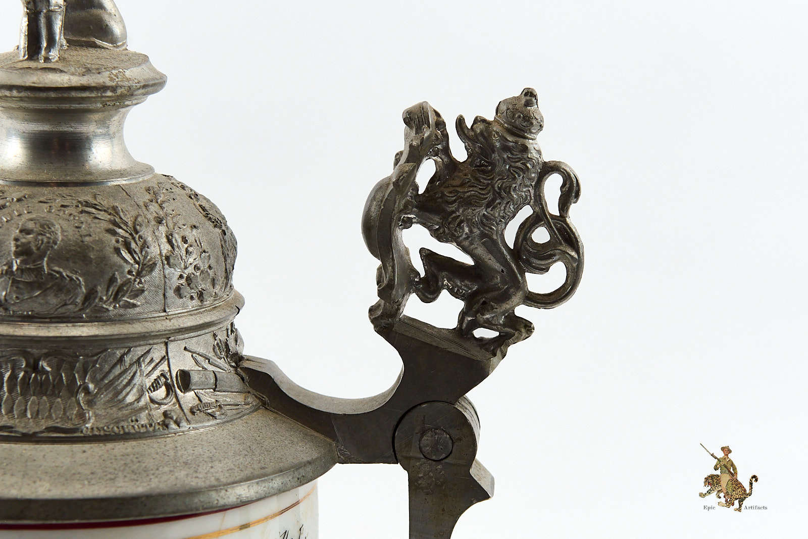 Crafted from porcelain or stoneware, the steins were richly decorated with hand-painted scenes of military life, patriotic emblems, and inscriptions naming the soldier, unit, and service dates. Pewter lids often featured ornate finials—such as soldiers or artillery shells—and some included lithophanes depicting farewells between soldiers and loved ones.