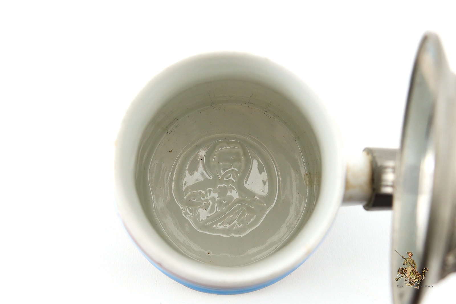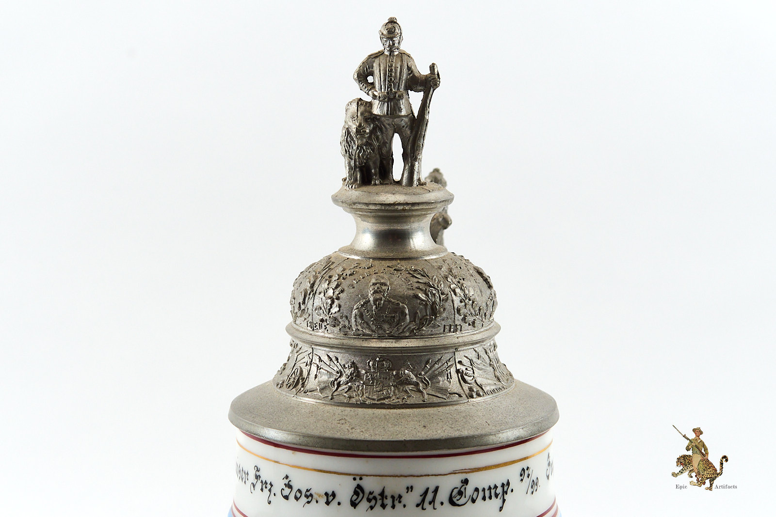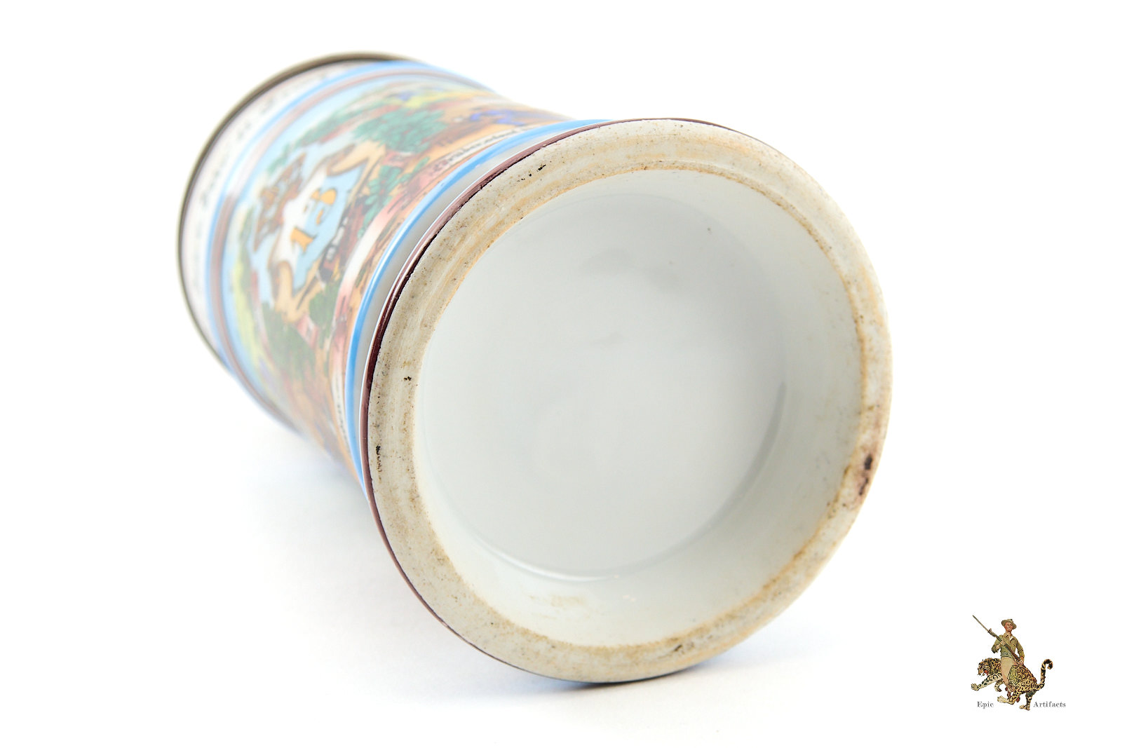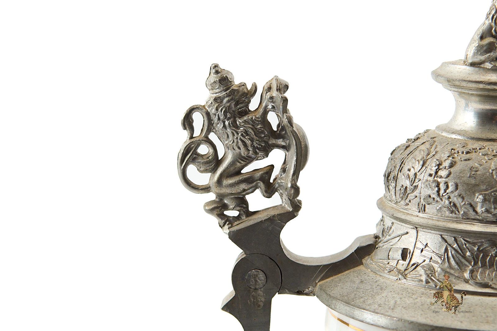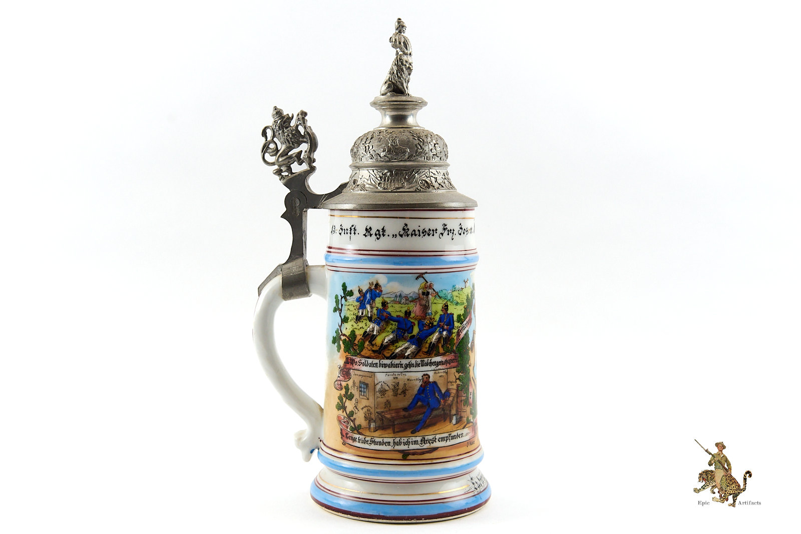 Crafted from porcelain or stoneware, the steins were richly decorated with hand-painted scenes of military life, patriotic emblems, and inscriptions naming the soldier, unit, and service dates. Pewter lids often featured ornate finials—such as soldiers or artillery shells—and some included lithophanes depicting farewells between soldiers and loved ones.