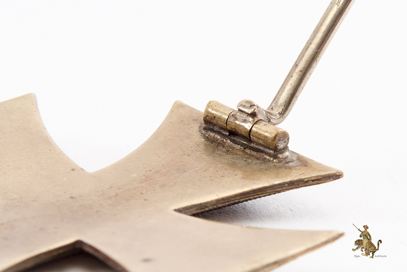 Product Description: Imperial Iron Cross 1st Class – Carl Delenius. A fine example of this sought-after Imperial German decoration, struck by Carl Delenius and marked with his distinctive square punch on the pin. The cross retains the majority of its original black paint to the iron core, complemented by a pleasing, even patina to the silvered frame, enhancing its period character. The reverse features a well-functioning barrel hinge and round wire “C” clasp, both operating smoothly. This Imperial Iron Cross 1st Class – Carl Delenius remains in excellent condition, exhibiting careful preservation and craftsmanship typical of its renowned maker.