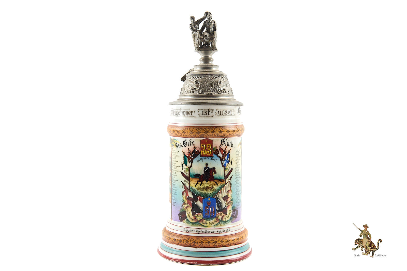 This Imperial Rhein Field Artillery Regiment No 23 Stein is an nice example of an Artillery regimental stein, notable for its artistry, vivid preservation, and strong provenance to a named soldier. Such pieces offer both historical and aesthetic appeal, reflecting the pride and tradition of service in the Imperial German Army at the dawn of the twentieth century.