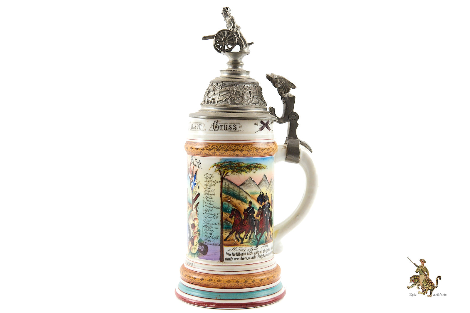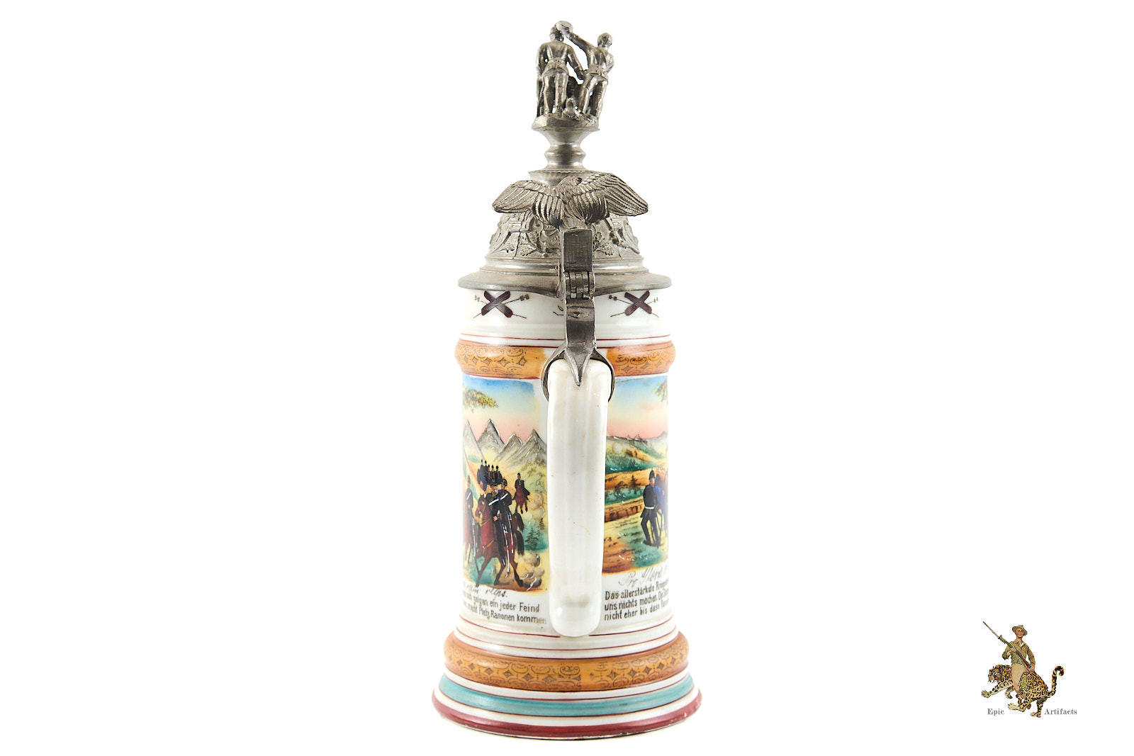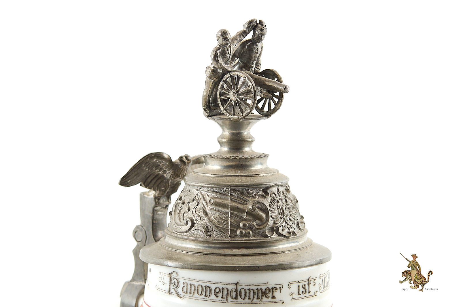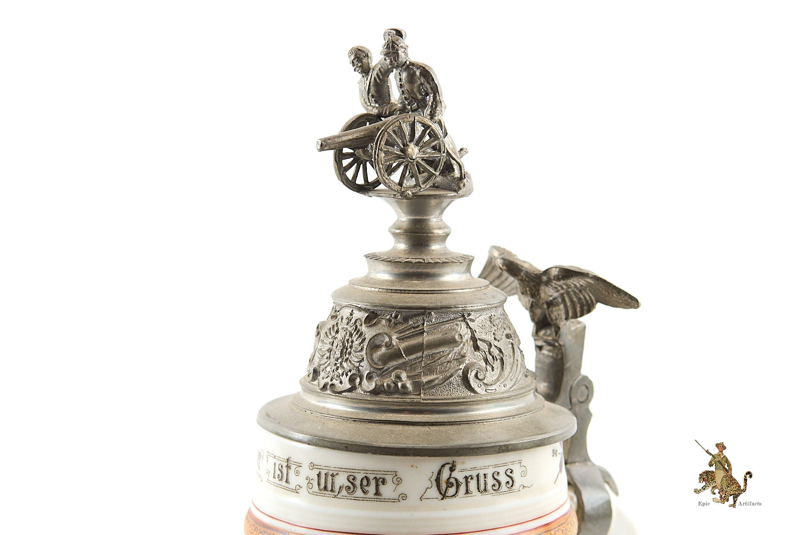 Crafted from porcelain or stoneware, the steins were richly decorated with hand-painted scenes of military life, patriotic emblems, and inscriptions naming the soldier, unit, and service dates. Pewter lids often featured ornate finials—such as soldiers or artillery shells—and some included lithophanes depicting farewells between soldiers and loved ones.