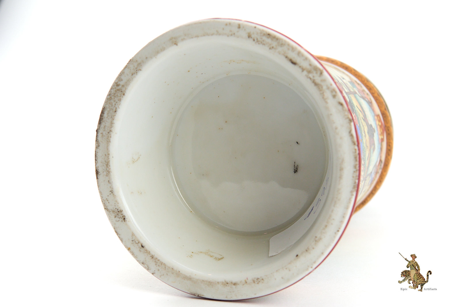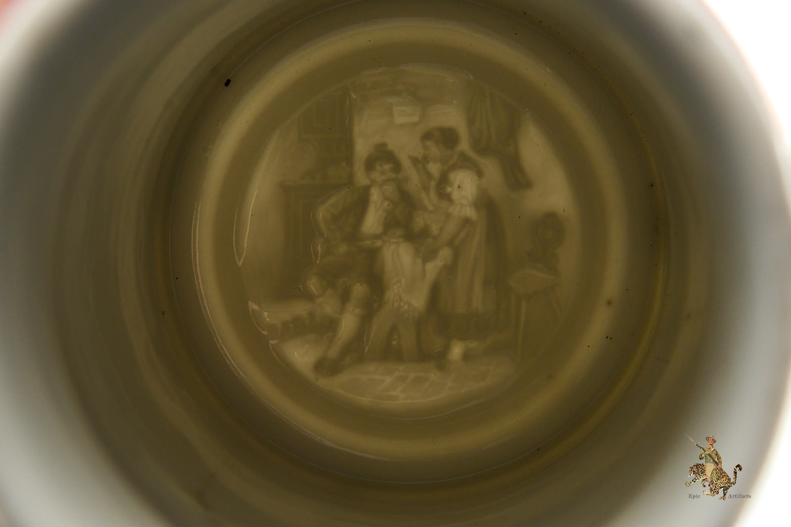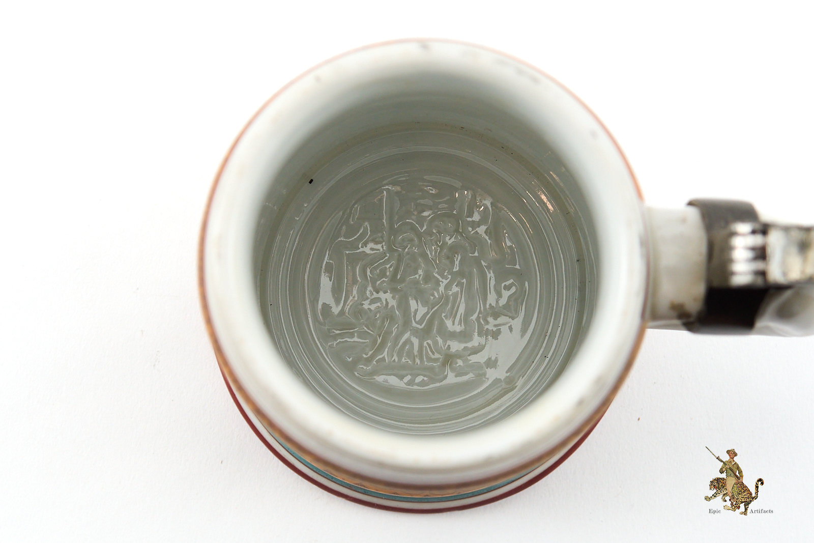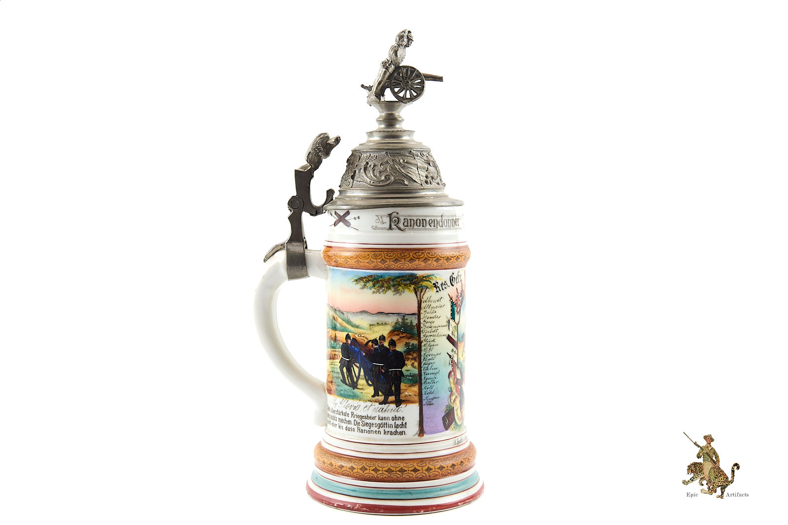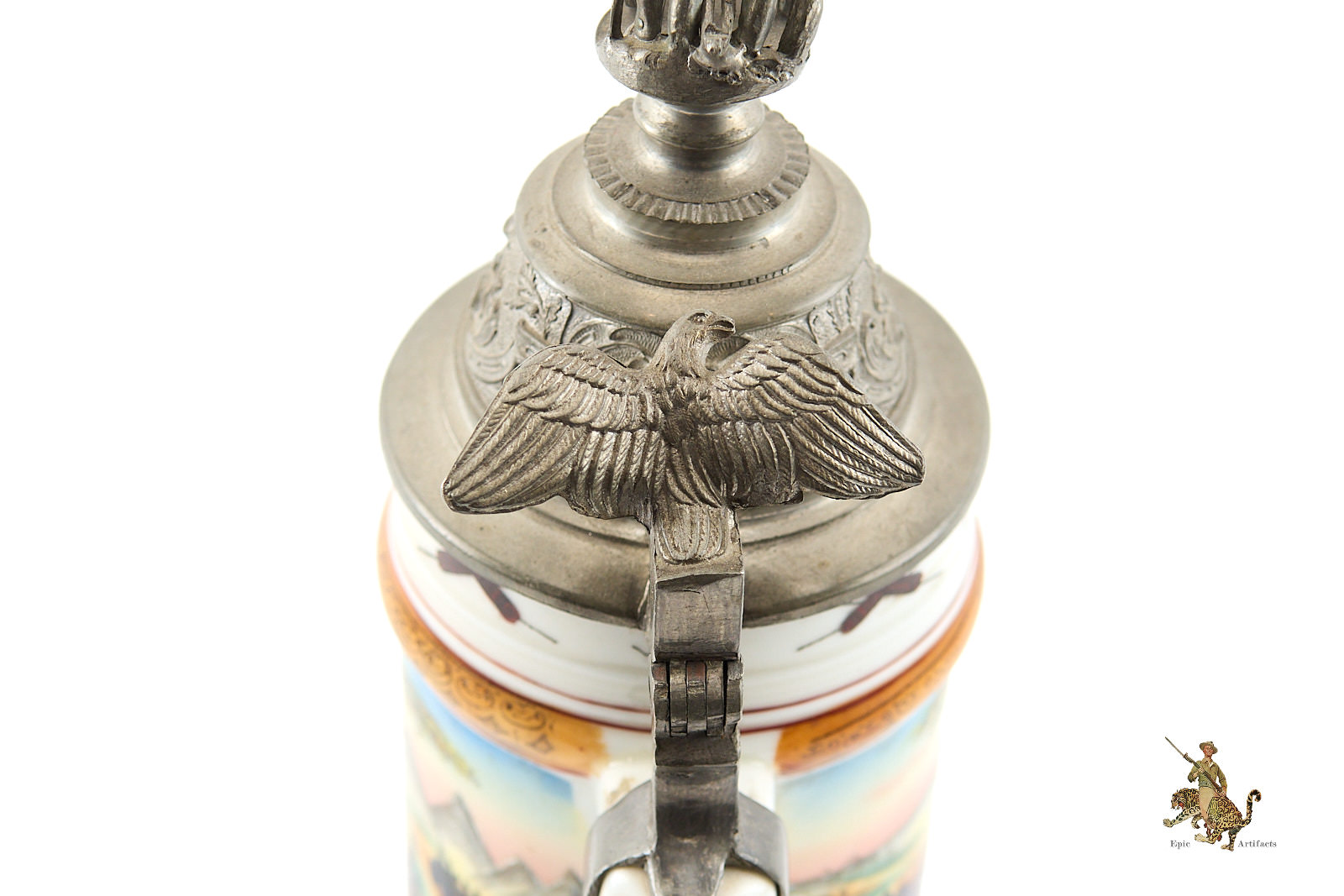 Crafted from porcelain or stoneware, the steins were richly decorated with hand-painted scenes of military life, patriotic emblems, and inscriptions naming the soldier, unit, and service dates. Pewter lids often featured ornate finials—such as soldiers or artillery shells—and some included lithophanes depicting farewells between soldiers and loved ones.