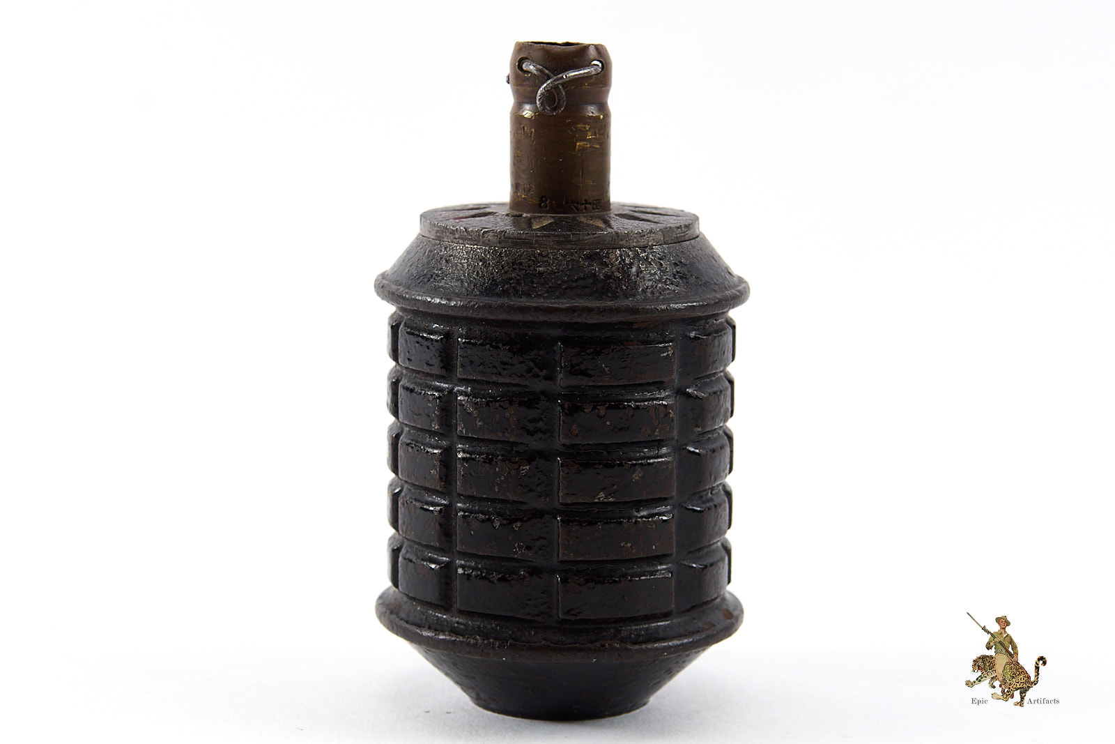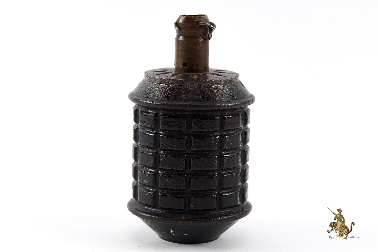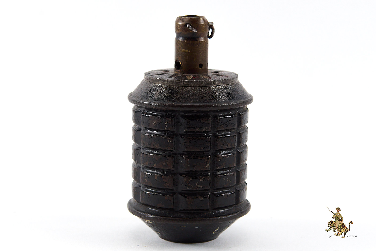 Historical Description: The Type 97 Japanese Grenade was introduced by Imperial Japanese forces in 1937 and saw extensive service throughout the Second Sino-Japanese War and World War II. Designed as a hand-thrown fragmentation grenade, it featured a smooth cylindrical steel body and a percussion-initiated time fuse. Intended to improve safety over earlier designs, the Type 97 reflected Japan’s efforts to modernize infantry equipment and was widely issued to frontline troops across the Pacific theater.