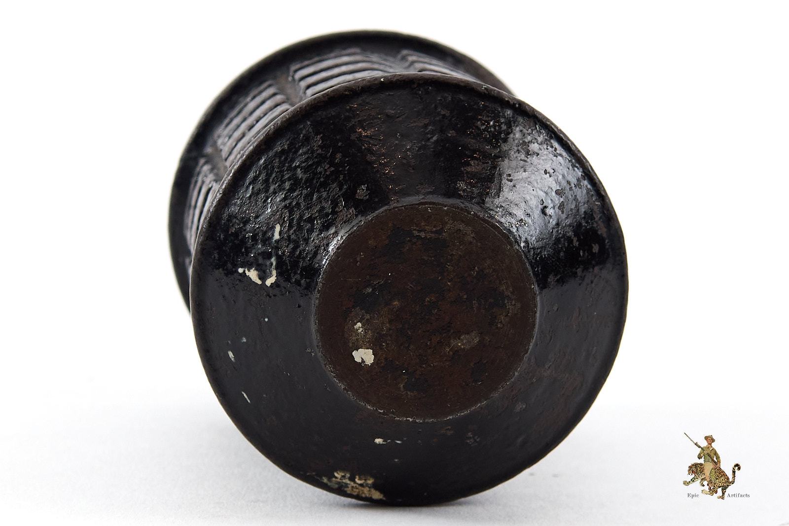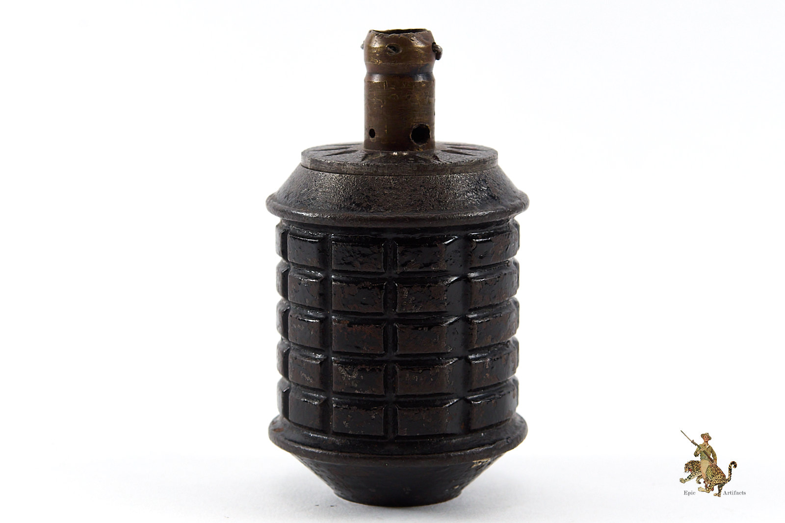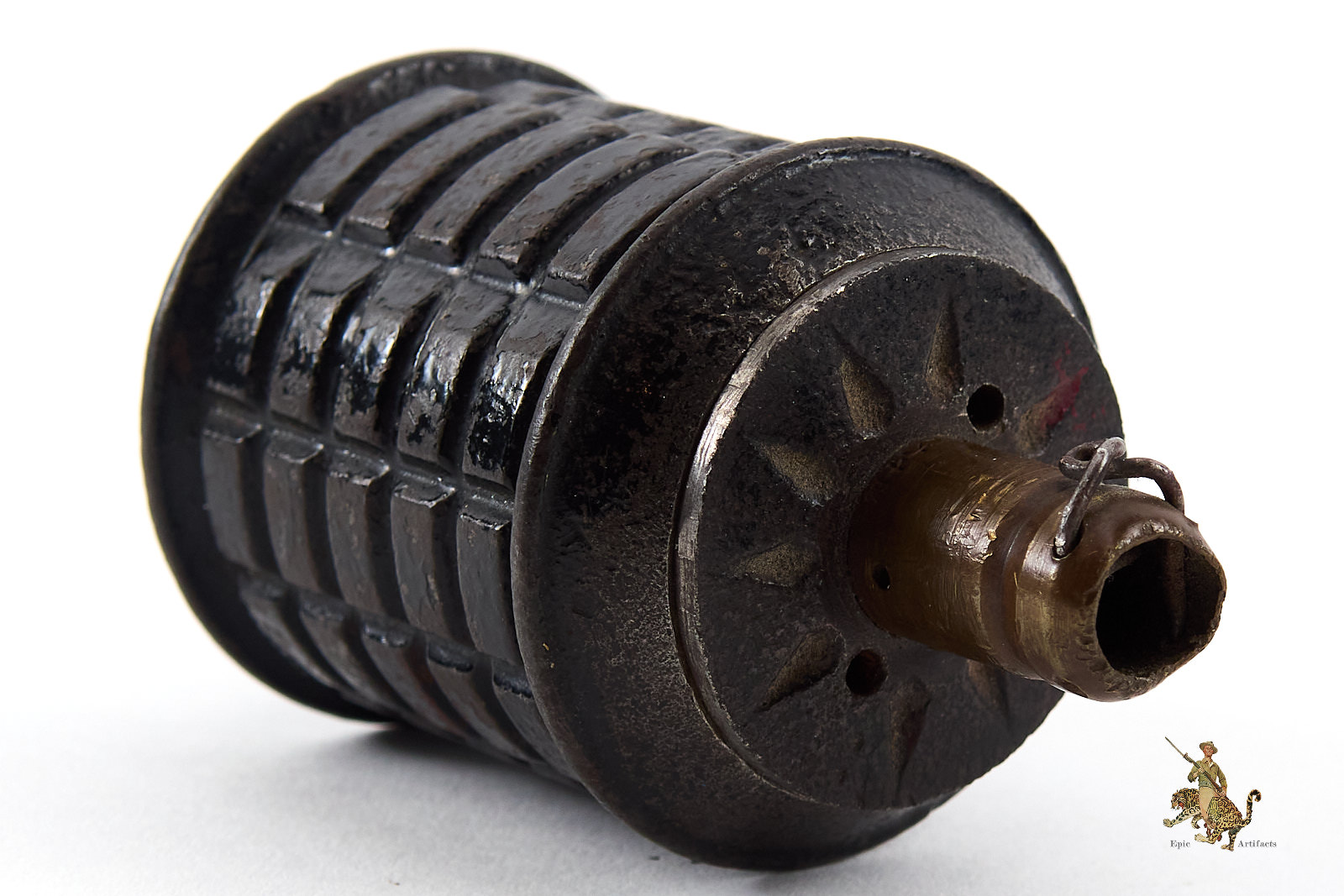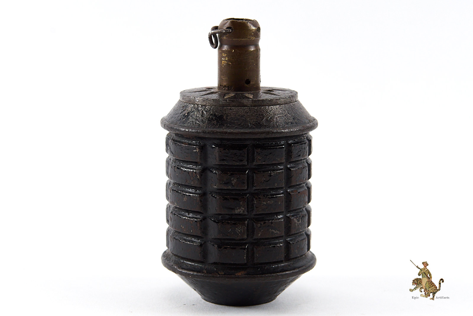 Historical Description: The Type 97 Japanese Grenade was introduced by Imperial Japanese forces in 1937 and saw extensive service throughout the Second Sino-Japanese War and World War II. Designed as a hand-thrown fragmentation grenade, it featured a smooth cylindrical steel body and a percussion-initiated time fuse. Intended to improve safety over earlier designs, the Type 97 reflected Japan’s efforts to modernize infantry equipment and was widely issued to frontline troops across the Pacific theater.