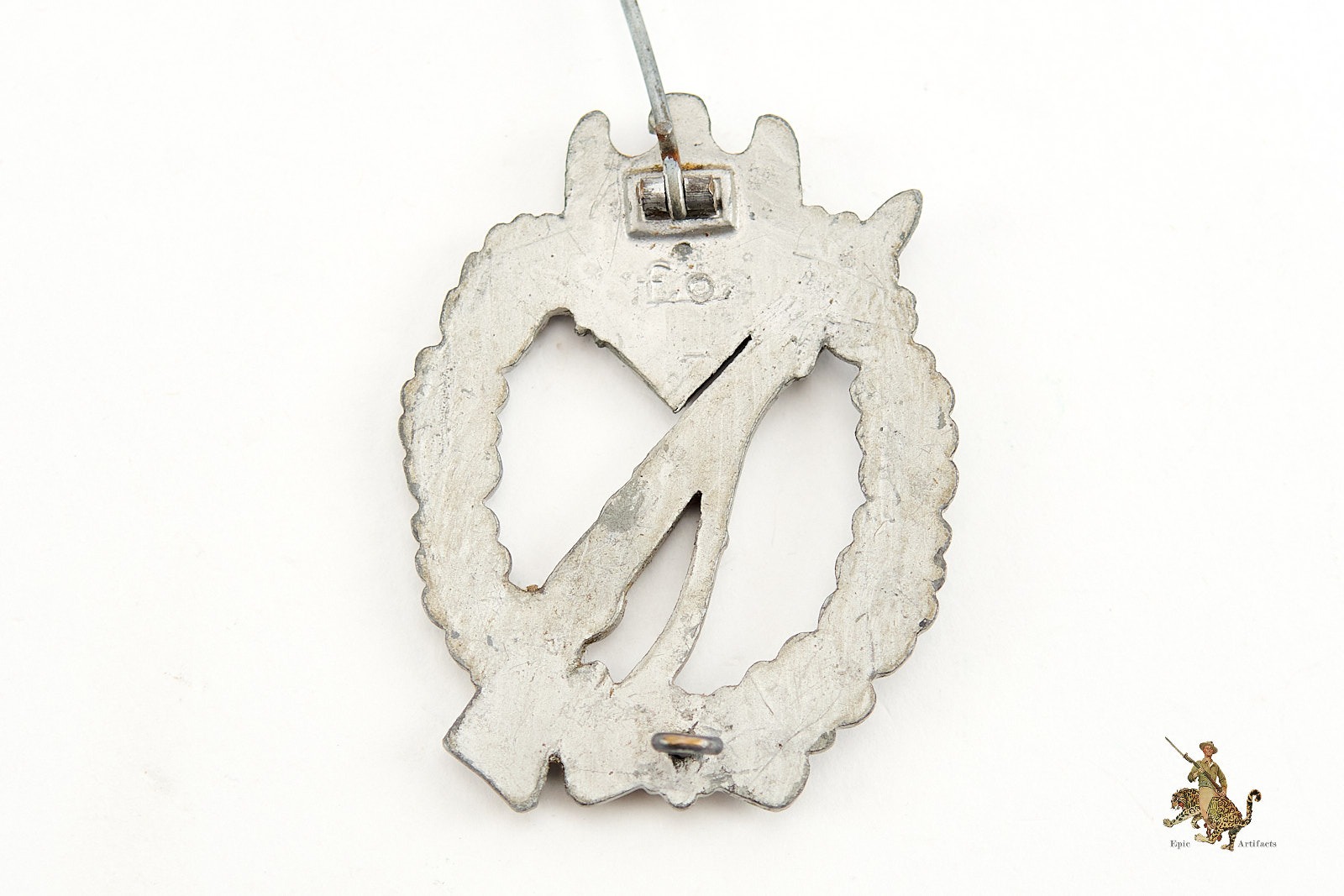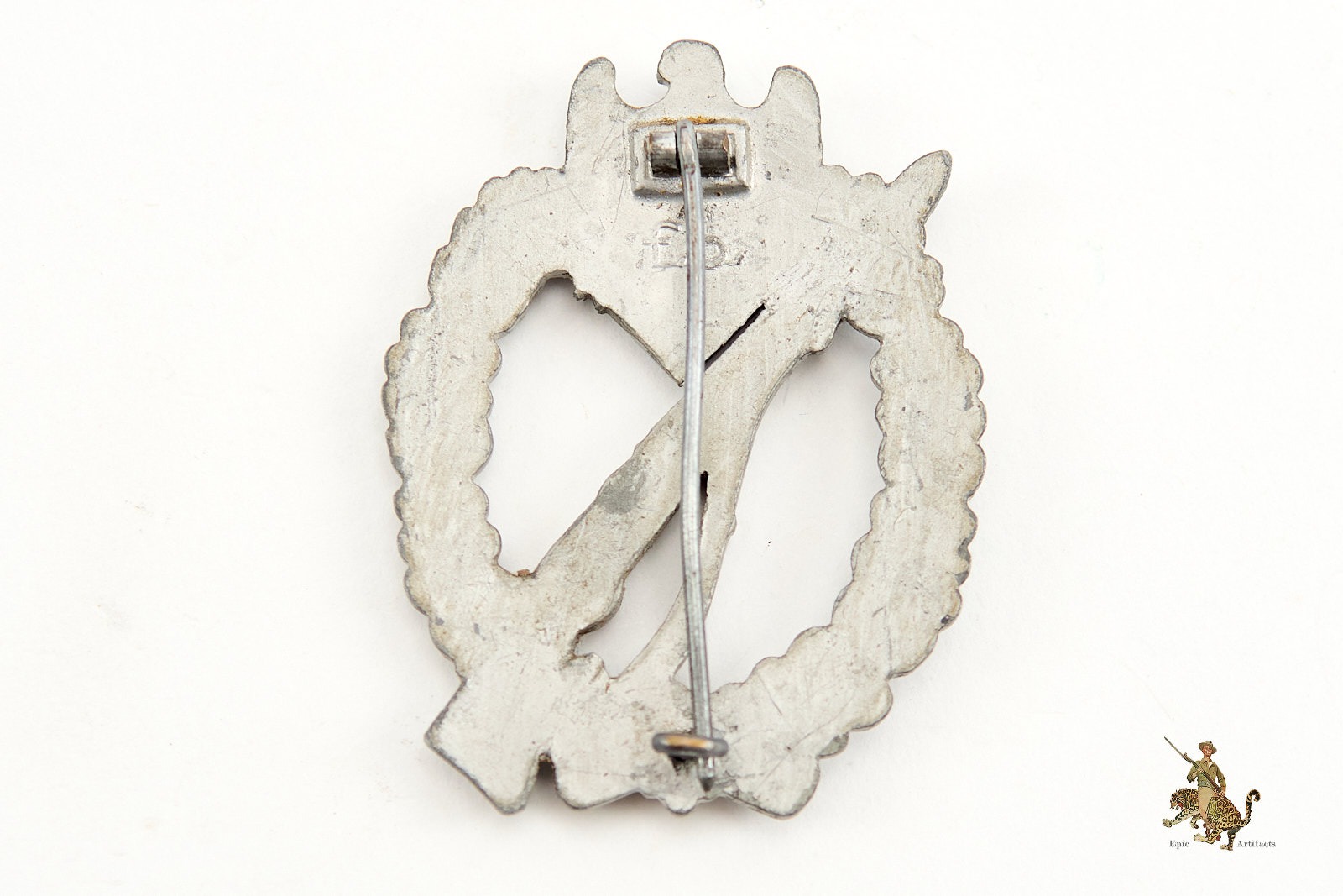 Historical Description: The Infantry Assault Badge (Infanterie-Sturmabzeichen) was instituted on December 20, 1939, by German Army commander Generalfeldmarschall Walther von Brauchitsch. The design of the badge featured the iconic K98 rifle, the standard German Infantry weapon of WWII, surrounded by oak leaves and surmounted by a German Army eagle and swastika emblem. The creation of this design has been attributed to the C.E. Juncker firm in Berlin. The badge could be awarded to members of the Heer and SS-VT (later the Waffen-SS) who participate in ground combat as infantry. To earn this award, soldiers had to participate in three or more assaults, counterattacks, or reconnaissance missions, or to have participated in hand to hand combat in an assault, or to have participated in three days of reestablishing combat positions. These actions had to take place on separate days to meet the award criteria. On June 1, 1940, a Bronze grade of this award was instituted, for motorized infantry. The criteria for the award were the same, only for motorized units. The earliest versions of the Infantry Assault Badge were made of Tombak or other high-quality alloys, with a plated finish. Later production awards were generally zinc alloy, with a bronze or silver wash that often faded with wear and time.