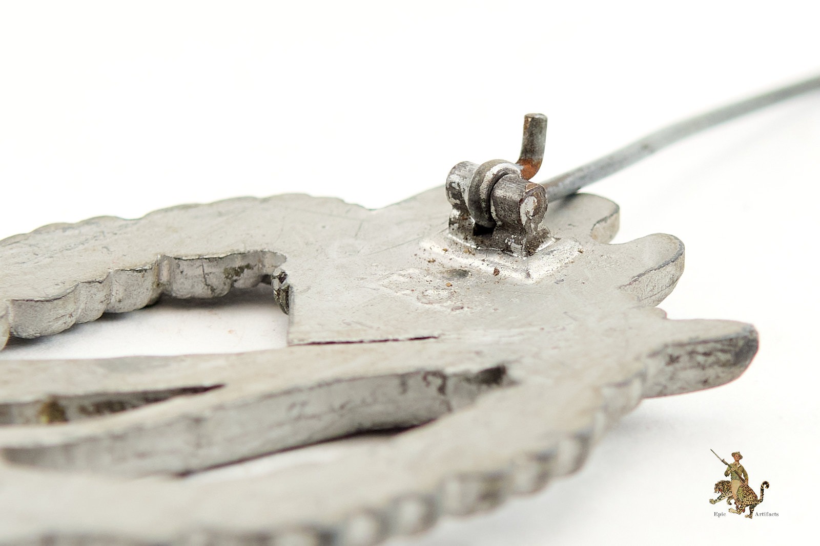 Approximately 90% of the original silver finish remains intact, exhibiting pleasing and even wear with a soft, contrasting patina across the raised and recessed elements. The reverse is well-preserved, featuring the correct f.o. maker mark and fitted with its original hardware, including a functional hinge and ? style catch system specific to this variant. A highly desirable badge, notable for both its rarity and condition, and an excellent acquisition for the advanced collector of German combat awards.