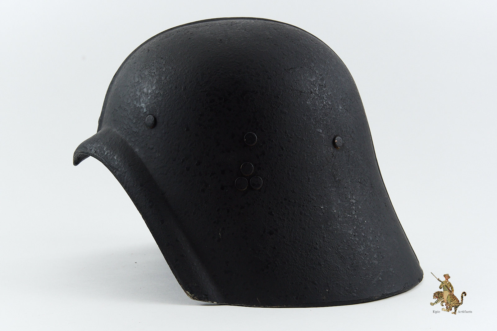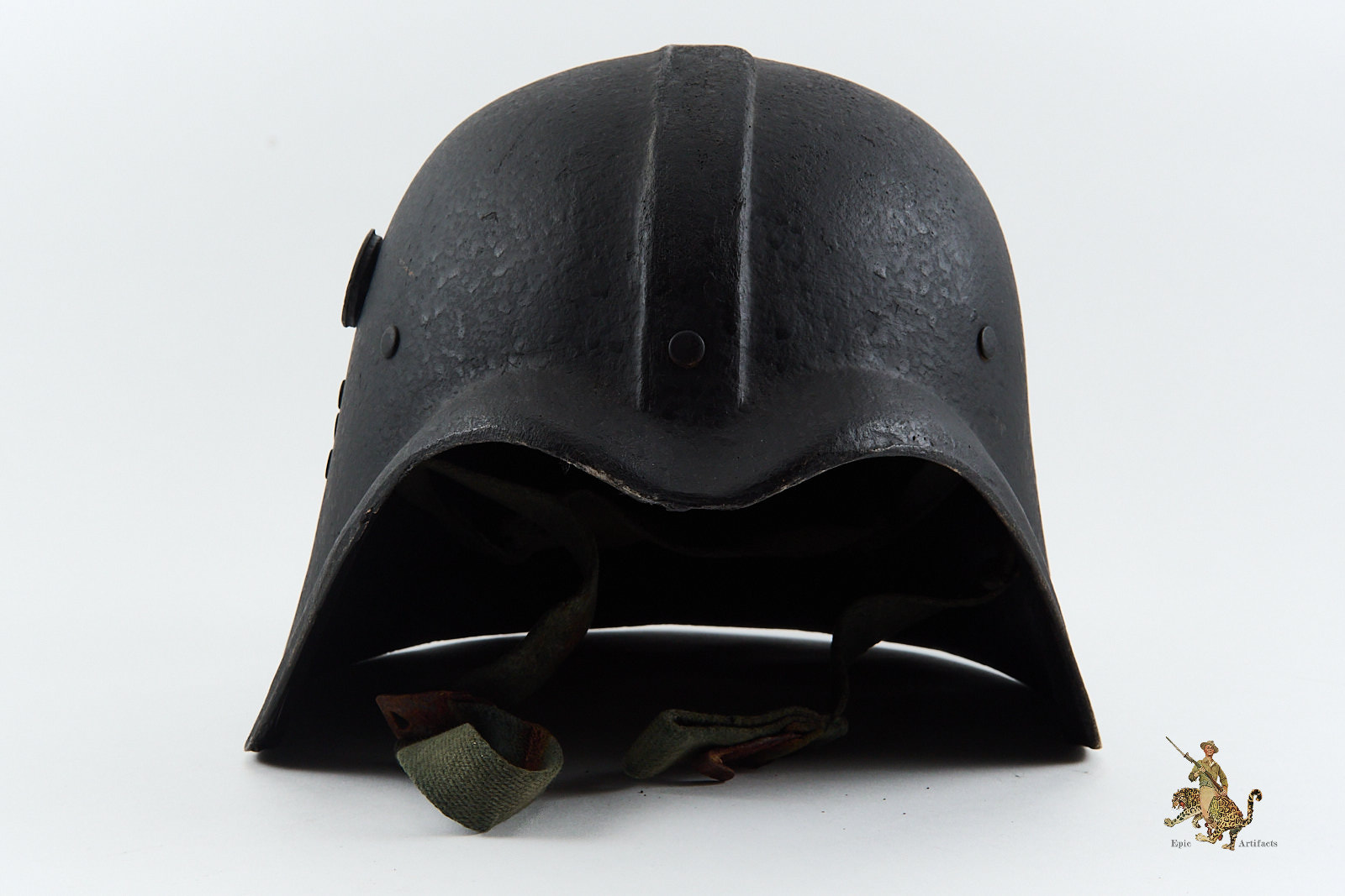Historical Description: The Iraqi Fedayeen Helmet Saddam Hussein Guard, often referred to as the “Darth Vader helmet” for its menacing, futuristic design, was worn by the Fedayeen Saddam, a paramilitary force loyal to Saddam Hussein and led by his son, Uday Hussein. Formed in the mid-1990s, the Fedayeen operated outside the regular Iraqi military, serving as both an internal security force and a symbol of regime loyalty. The helmet’s construction features black molded fiberglass, a nylon webbing liner, original chinstrap, and a distinctive neck guard—a component frequently missing from surviving examples. Affixed to the side is a molded rubber insignia showing Saddam Hussein’s profile alongside the slogan “Allah, al-watan, al-qa’ed” (God, Homeland, Leader), reinforcing the group’s ideological devotion.