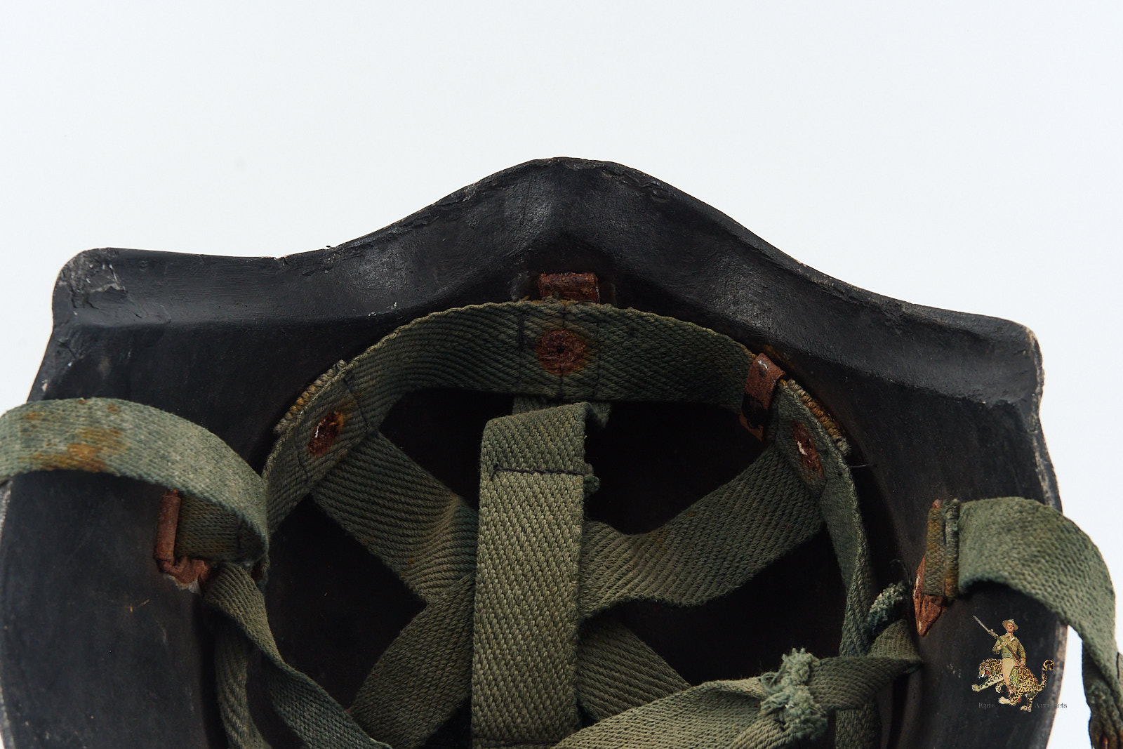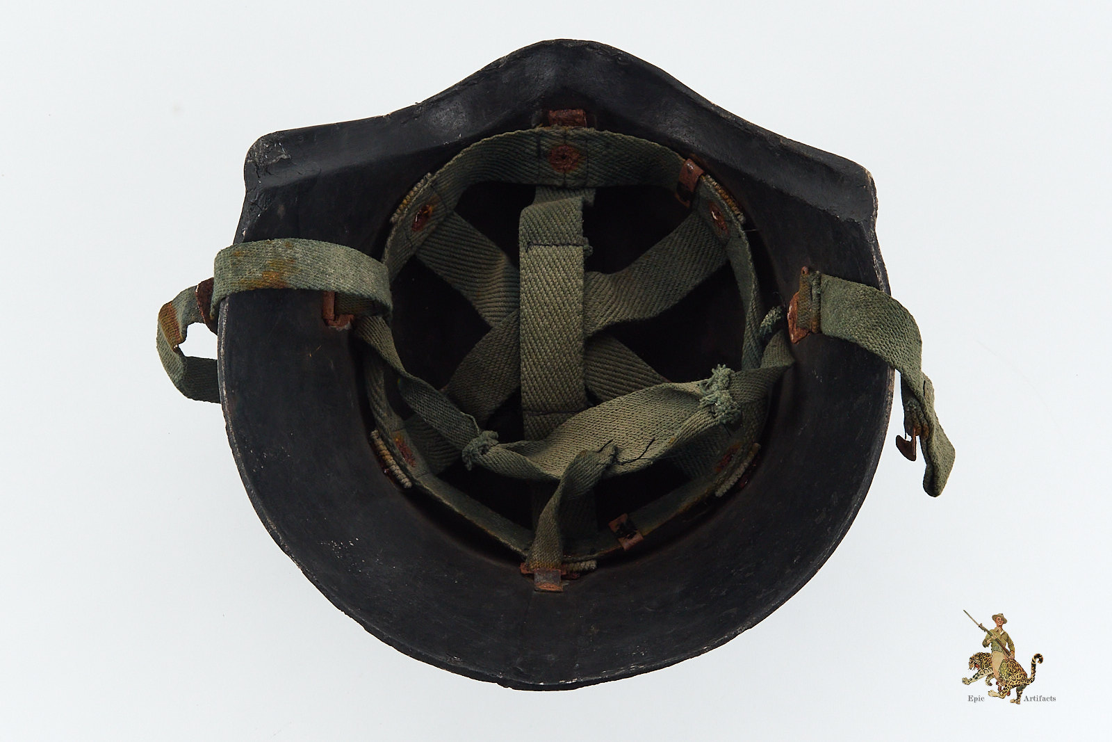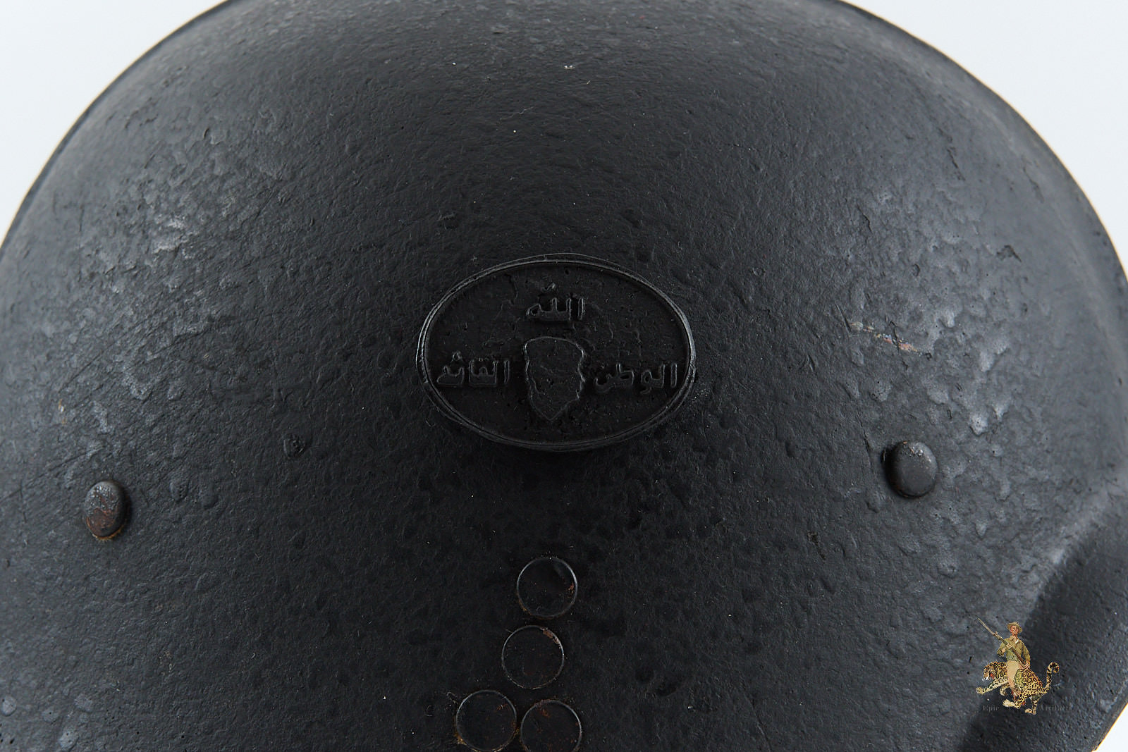 This example is constructed of molded white fiberglass factory-painted in black, retaining its original integrated nylon webbing liner and chinstrap. The metal fittings show honest age oxidation consistent with service use. Still affixed to the right side is the distinctive molded rubber Fedayeen Saddam insignia featuring the profile of Saddam Hussein above the motto Allah, al-watan, qa’ed (God, Homeland, Leader). The exterior exhibits almost all of the original black pain, showing only minor edge wear, and areas of paint loss—appropriate signs of handling and field wear.  Overall this helmet rates as near mint with the only flaws being extremely minor rim wear and oxidation to the metal suspension fittings.