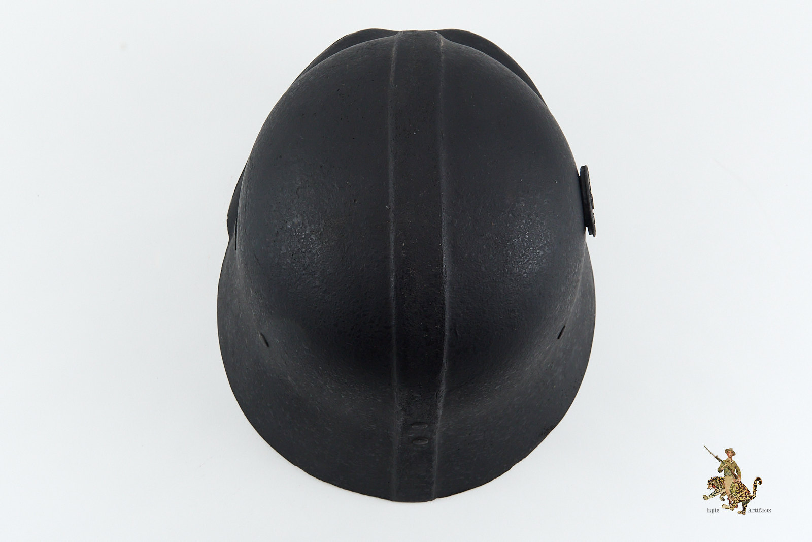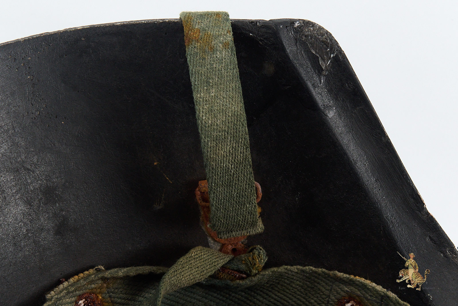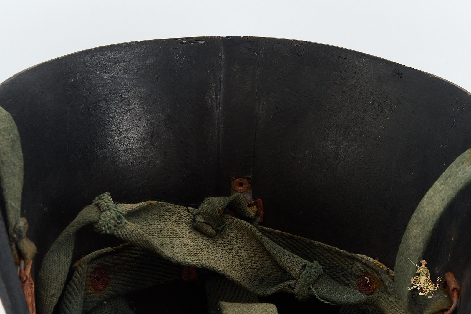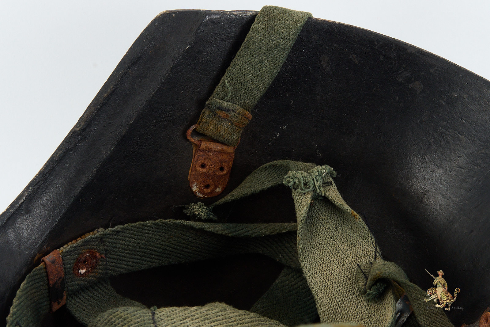 This example is constructed of molded white fiberglass factory-painted in black, retaining its original integrated nylon webbing liner and chinstrap. The metal fittings show honest age oxidation consistent with service use. Still affixed to the right side is the distinctive molded rubber Fedayeen Saddam insignia featuring the profile of Saddam Hussein above the motto Allah, al-watan, qa’ed (God, Homeland, Leader). The exterior exhibits almost all of the original black pain, showing only minor edge wear, and areas of paint loss—appropriate signs of handling and field wear.  Overall this helmet rates as near mint with the only flaws being extremely minor rim wear and oxidation to the metal suspension fittings.