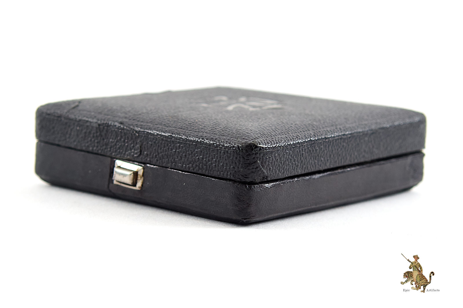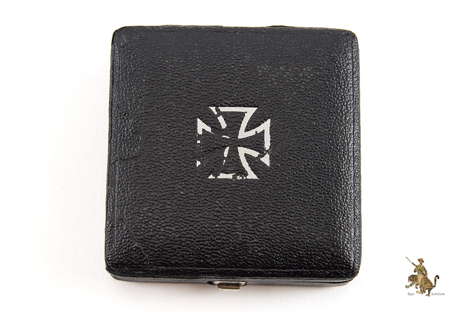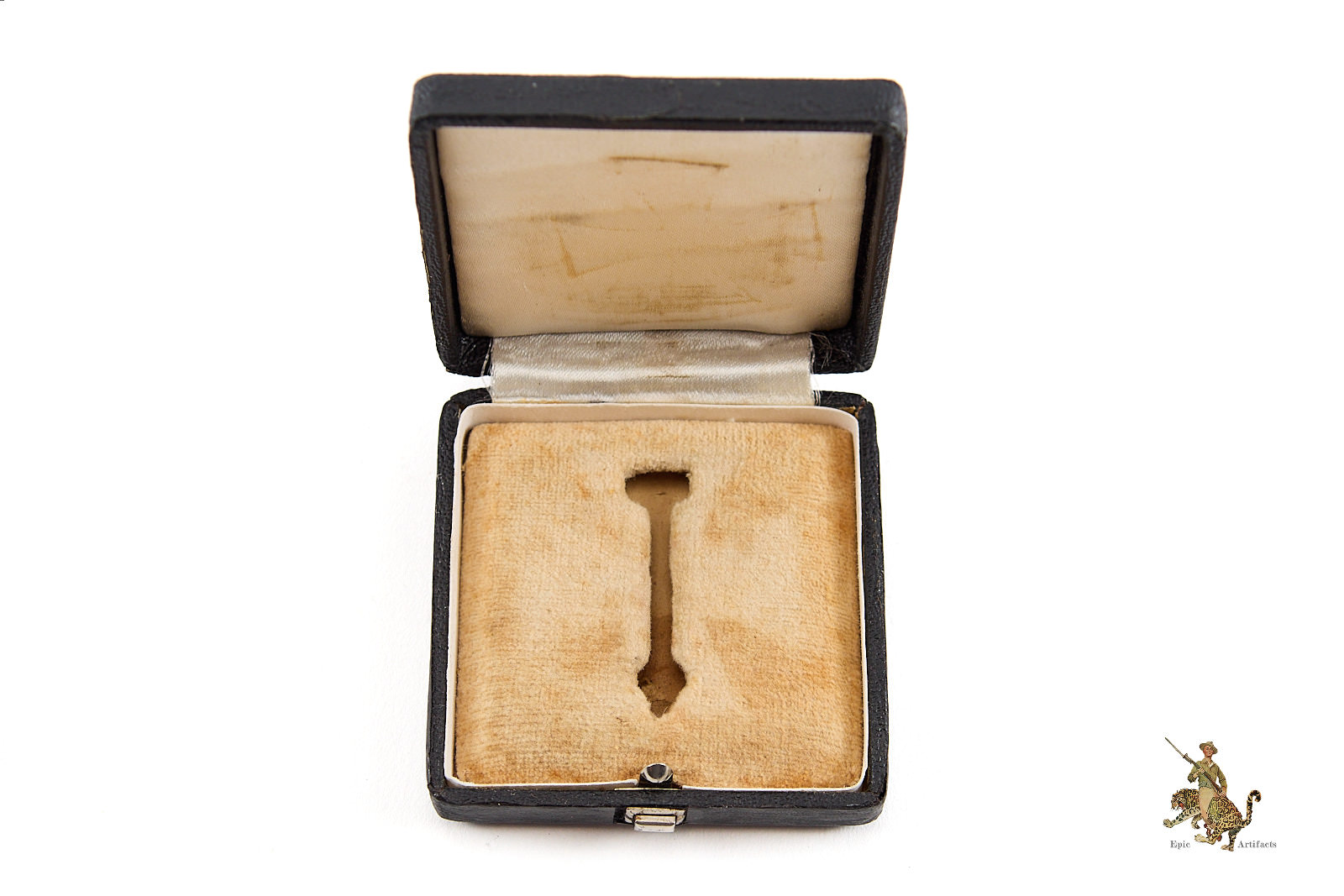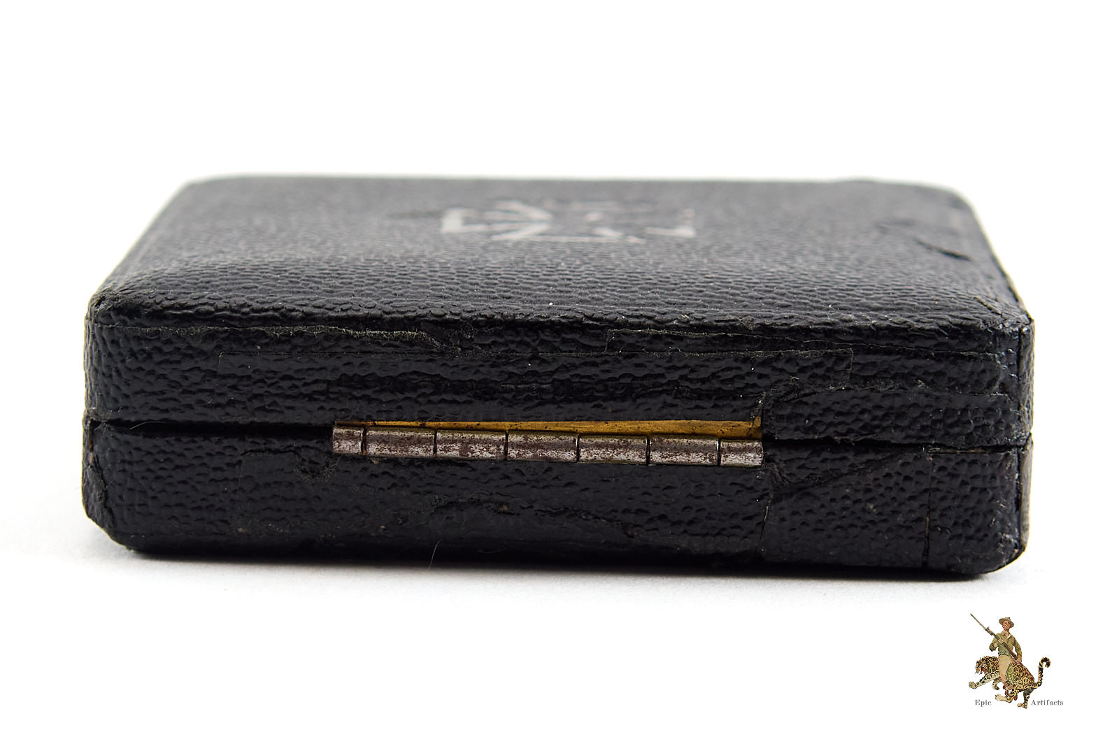 This outstanding piece is offered complete with its original presentation case, featuring the characteristic leatherette exterior with a silver-embossed Iron Cross emblem on the lid, showing only minimal wear and silvering loss from age. The hinge and rectangular push-button clasp remain intact and operational, while the cream flocked interior retains its original form and tone. Believed to be among the examples associated with the famed “Russian Hoard” discovered in the 1990s, this cross represents one of the finest surviving specimens of its type—a superb, collector-grade Mayer EK1 combining condition, rarity, and provenance in equal measure.