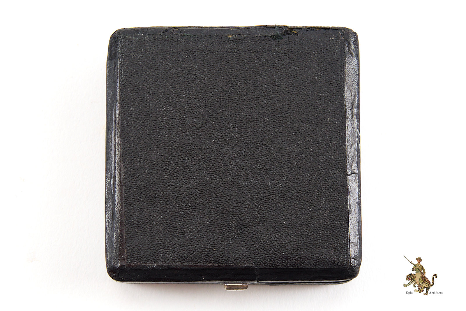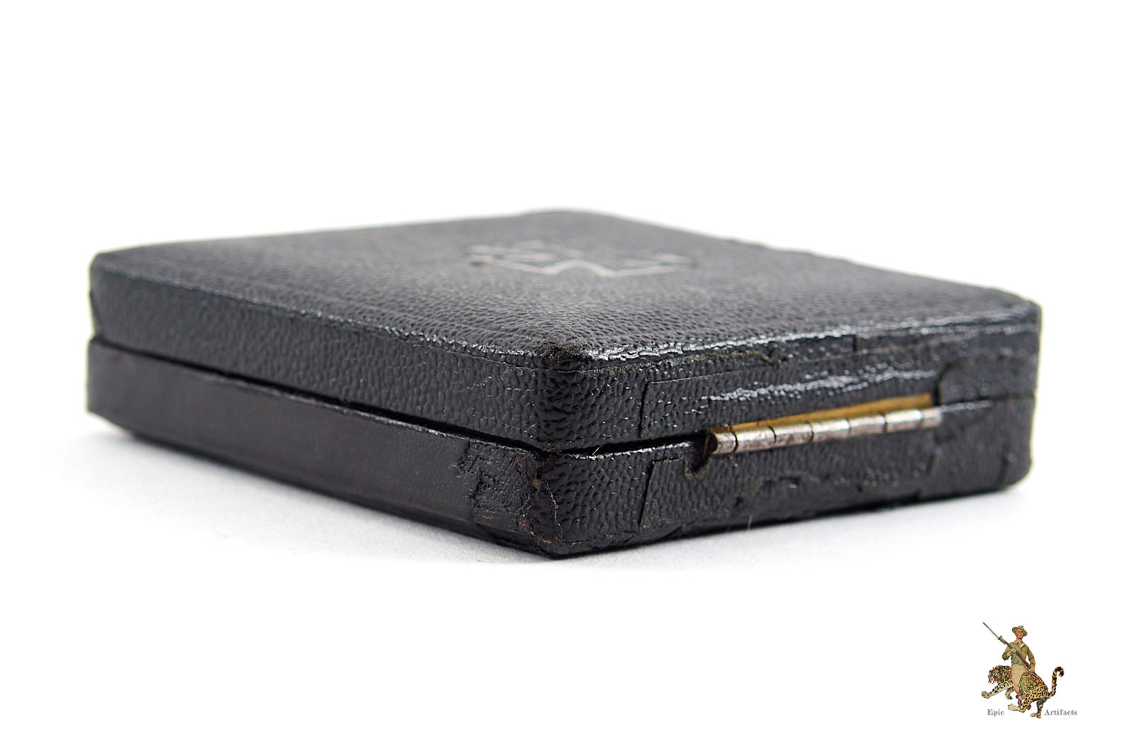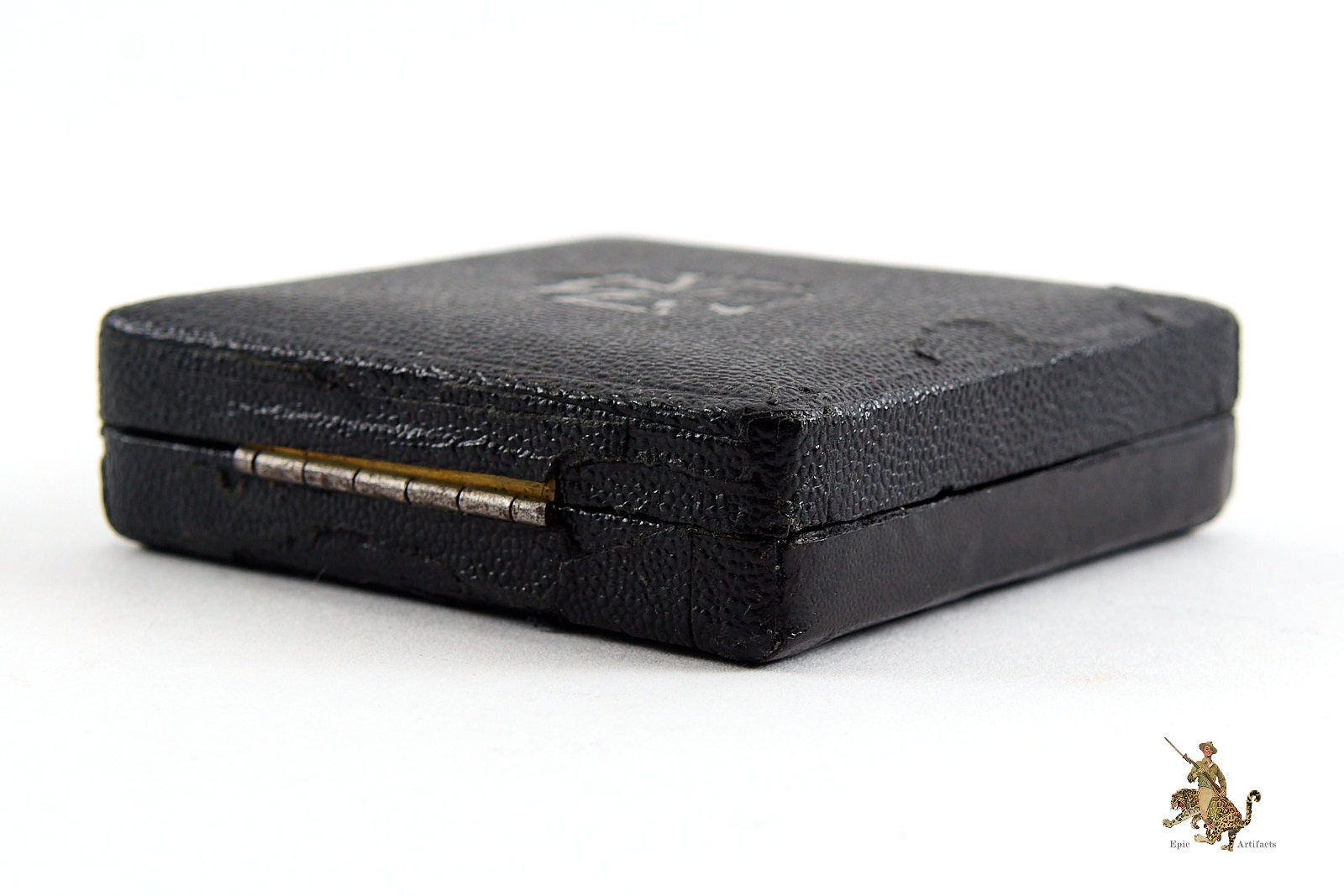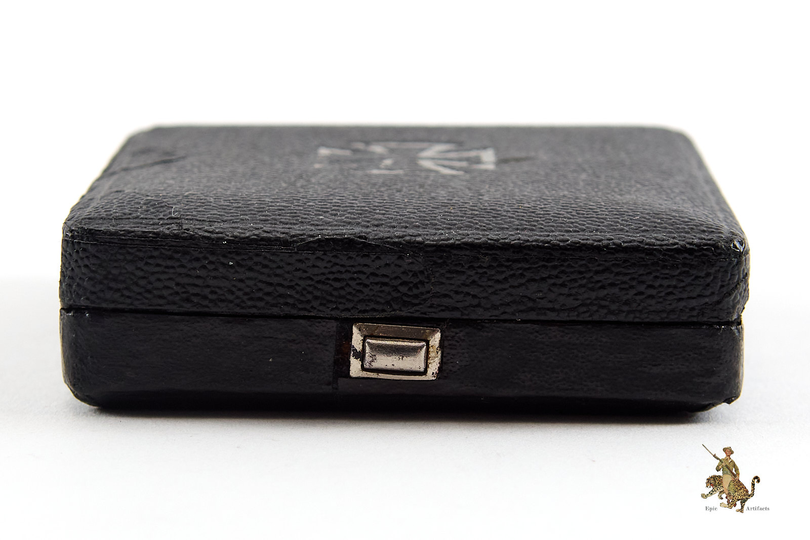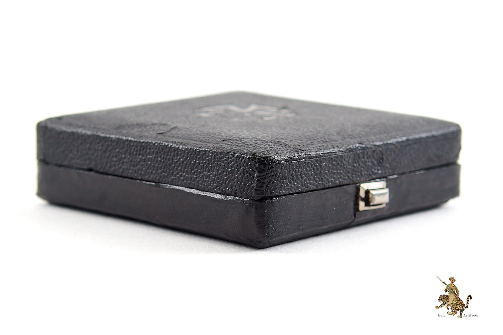 This outstanding piece is offered complete with its original presentation case, featuring the characteristic leatherette exterior with a silver-embossed Iron Cross emblem on the lid, showing only minimal wear and silvering loss from age. The hinge and rectangular push-button clasp remain intact and operational, while the cream flocked interior retains its original form and tone. Believed to be among the examples associated with the famed “Russian Hoard” discovered in the 1990s, this cross represents one of the finest surviving specimens of its type—a superb, collector-grade Mayer EK1 combining condition, rarity, and provenance in equal measure.