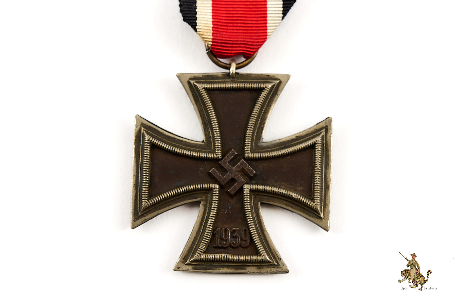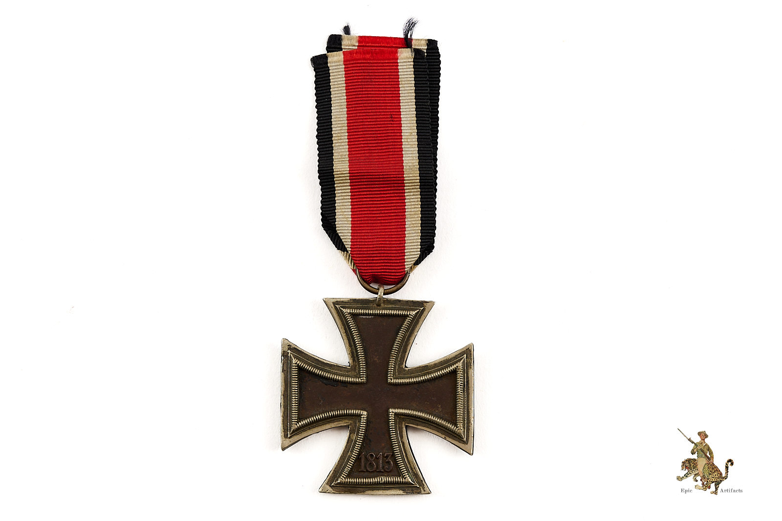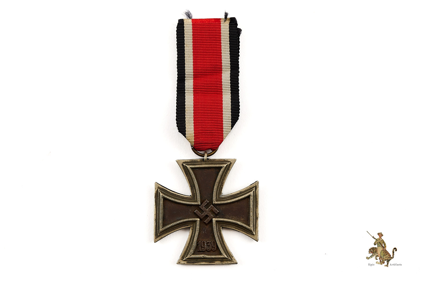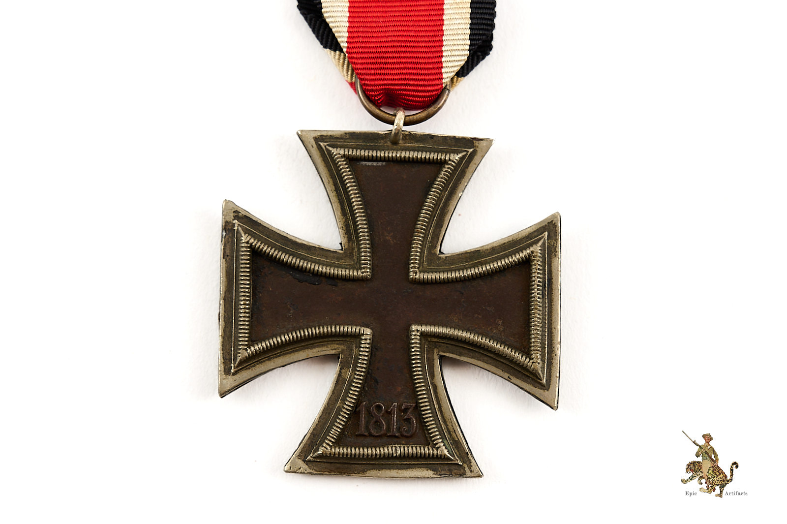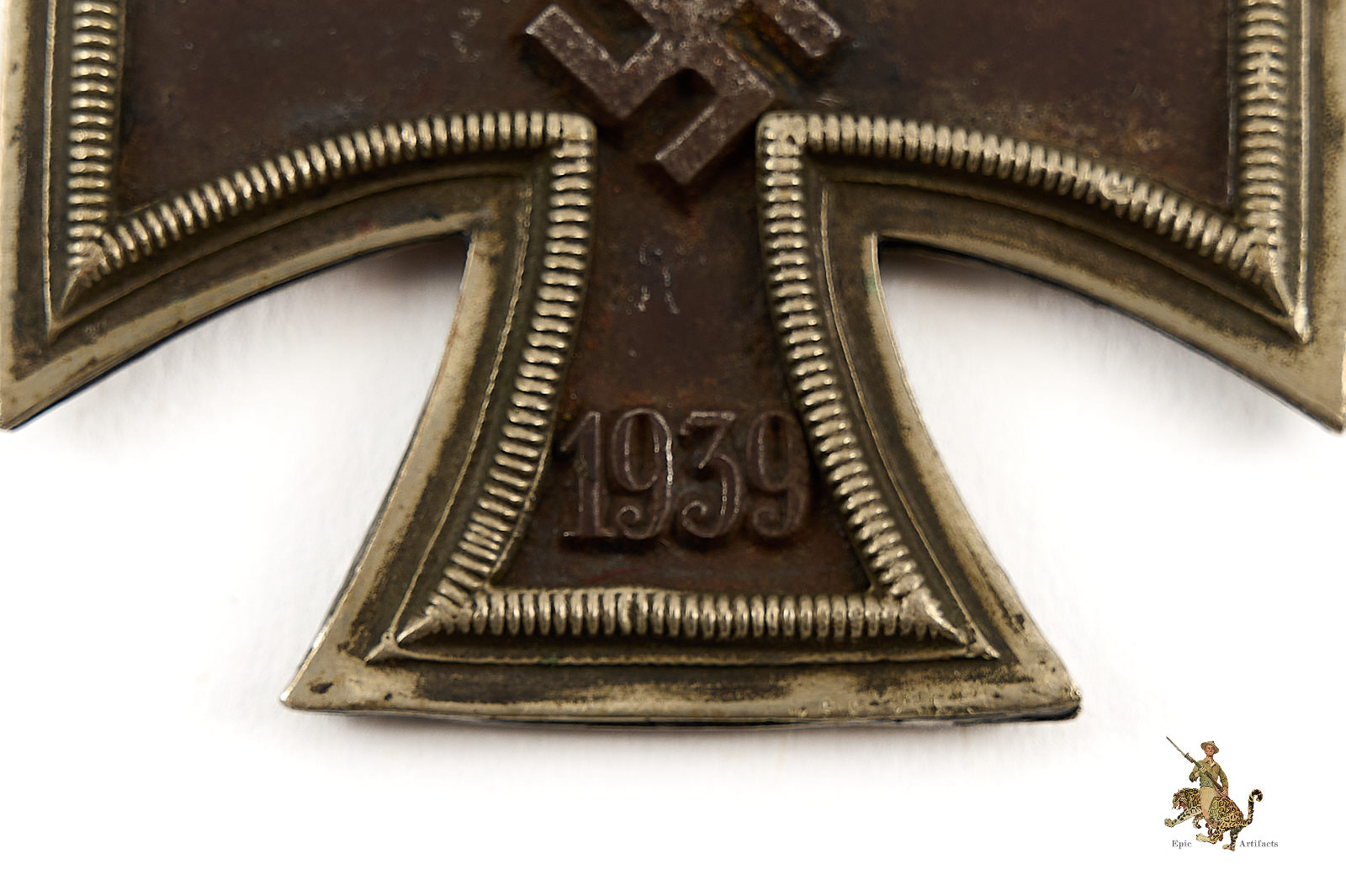 Historical Description: There is no more iconic German military award than the Iron Cross. The long history of this order began during the Napoleonic Wars. King Friedrich Wilhelm III of Prussia instituted the “Eisernes Kreuz” (Iron Cross) in March of 1813. The award criteria changed somewhat with time, but generally speaking, Iron Crosses could be awarded for individual acts of bravery, or for leadership achievements on the battlefield. The design was created by a Karl Friedrich Schinkel, his choice of the black cross with silver outline was derived from the heraldic emblem of the Teutonic Knights. There were a number of different type and grades of Iron Cross awards throughout its long history, but the basic details of the most widely awarded grades: The Iron Cross 1st Class and Iron Cross 2nd Class- remained the same. The first-class award was a breast badge, with fittings on the reverse to allow it to be worn on the uniform. These fittings varied widely over time and from maker to maker, and could be a simple in and catch, a screw post and retaining disc, or more elaborate setups. The second-class award was suspended from a ribbon, originally in the Prussian colors of black and white, later in the Reich colors of black, red and white. On the original versions of these crosses, in 1813, the front of the iron core of each grade was bare, and only the second-class award had ornamentation: a crown over the initials “FW” representing the King, a sprig of oak leaves, and the date 1813. The core was redesigned in 1870, when the cross was re-instituted during the Franco-Prussian War. The reverse ornamentation on the Iron Cross 2nd Class remained the same, but the front of the core on both grades now bore another crown, a “W” representing Kaiser Wilhelm, and the date 1870. This pattern repeated again when the cross was reinstituted for WWI- everything stayed the same, only the date 1870 was replaced with 1914. The final reinstitution of the cross came in 1939. For this version, the front of the core for both grades bore a swastika and the date 1939. The oak leaves, crown and royal initials were removed from the reverse, with only the date 1813 remaining as a reminder of the legacy of this award. In WWII, hundreds of thousands of Iron Cross First Class awards were bestowed, and four and a half million Iron Cross Second Class awards. Iron Crosses were made by a large number of authorized manufacturers Some variants of these awards were mass produced in huge numbers. Others were made in very limited quantities.