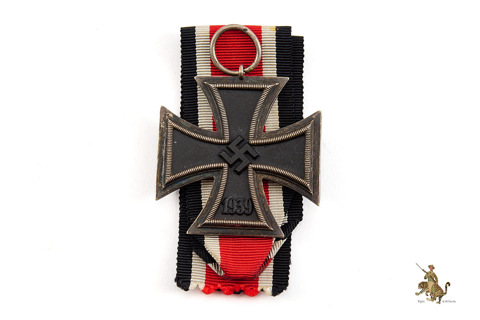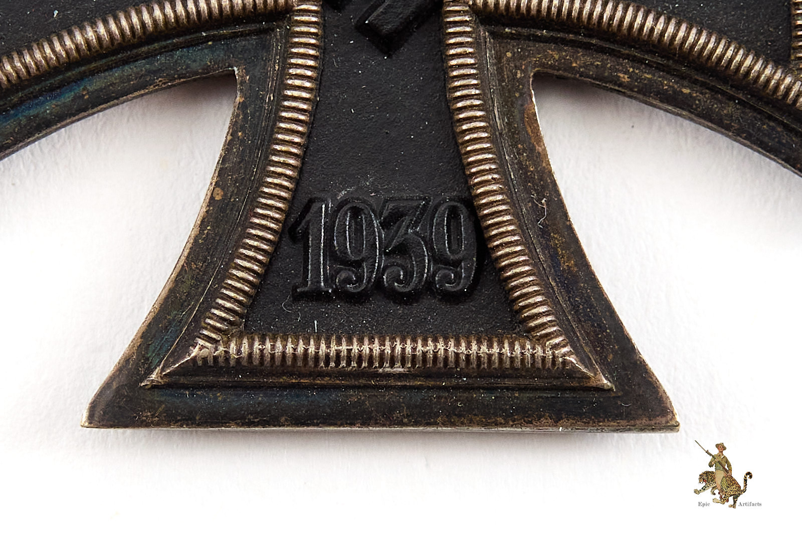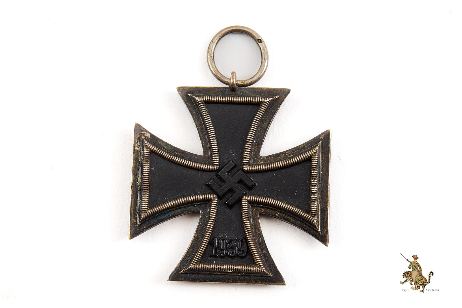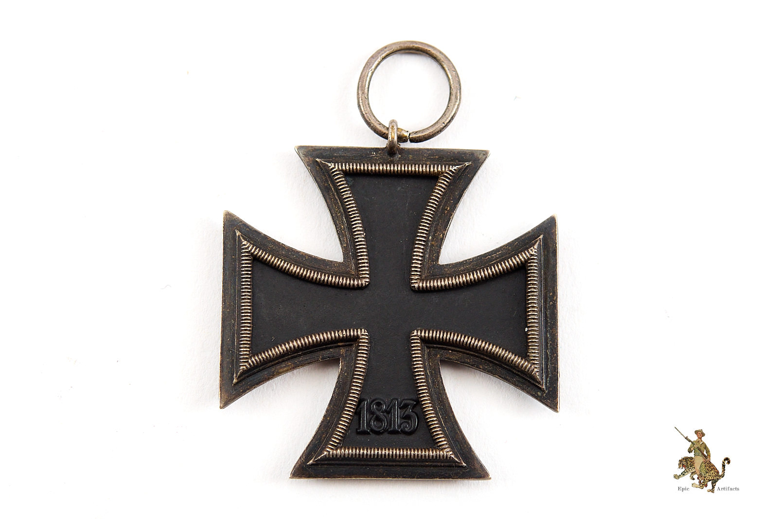 Historical Description: There is no more iconic German military award than the Iron Cross. The long history of this order began during the Napoleonic Wars. King Friedrich Wilhelm III of Prussia instituted the “Eisernes Kreuz” (Iron Cross) in March of 1813. The award criteria changed somewhat with time, but generally speaking, Iron Crosses could be awarded for individual acts of bravery, or for leadership achievements on the battlefield. The design was created by a Karl Friedrich Schinkel, his choice of the black cross with silver outline was derived from the heraldic emblem of the Teutonic Knights. There were a number of different type and grades of Iron Cross awards throughout its long history, but the basic details of the most widely awarded grades: The Iron Cross 1st Class and Iron Cross 2nd Class- remained the same. The first-class award was a breast badge, with fittings on the reverse to allow it to be worn on the uniform. These fittings varied widely over time and from maker to maker, and could be a simple in and catch, a screw post and retaining disc, or more elaborate setups. The second-class award was suspended from a ribbon, originally in the Prussian colors of black and white, later in the Reich colors of black, red and white. On the original versions of these crosses, in 1813, the front of the iron core of each grade was bare, and only the second-class award had ornamentation: a crown over the initials “FW” representing the King, a sprig of oak leaves, and the date 1813. The core was redesigned in 1870, when the cross was re-instituted during the Franco-Prussian War. The reverse ornamentation on the Iron Cross 2nd Class remained the same, but the front of the core on both grades now bore another crown, a “W” representing Kaiser Wilhelm, and the date 1870. This pattern repeated again when the cross was reinstituted for WWI- everything stayed the same, only the date 1870 was replaced with 1914. The final reinstitution of the cross came in 1939. For this version, the front of the core for both grades bore a swastika and the date 1939. The oak leaves, crown and royal initials were removed from the reverse, with only the date 1813 remaining as a reminder of the legacy of this award. In WWII, hundreds of thousands of Iron Cross First Class awards were bestowed, and four and a half million Iron Cross Second Class awards. Iron Crosses were made by a large number of authorized manufacturers Some variants of these awards were mass produced in huge numbers. Others were made in very limited quantities.