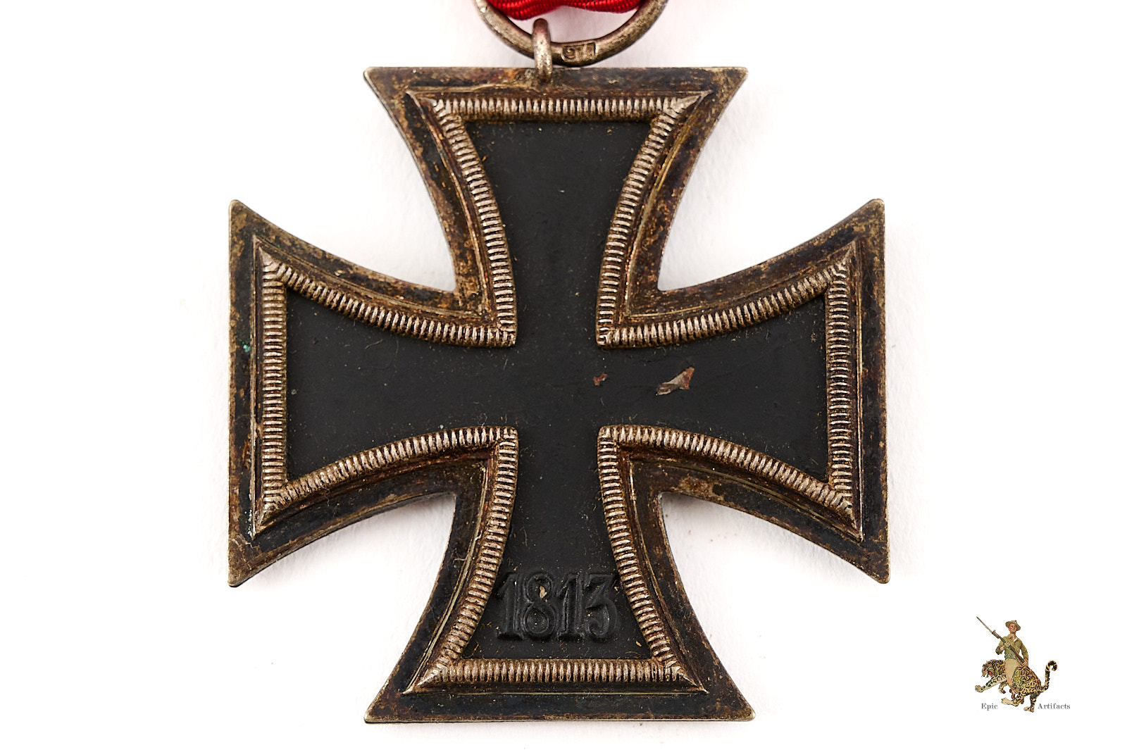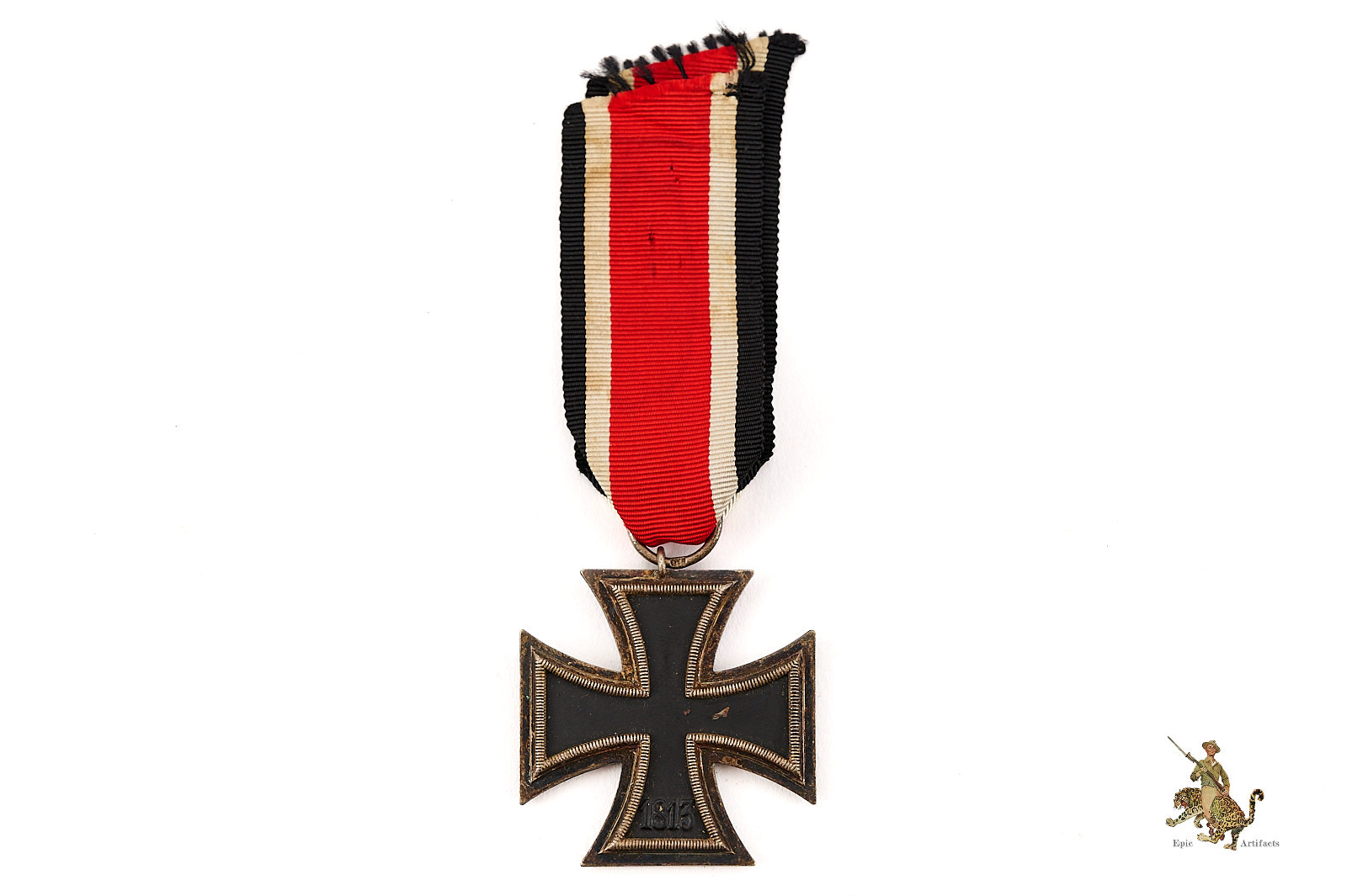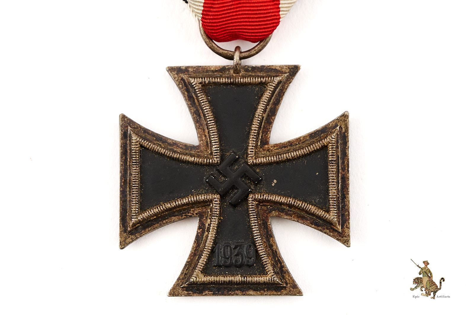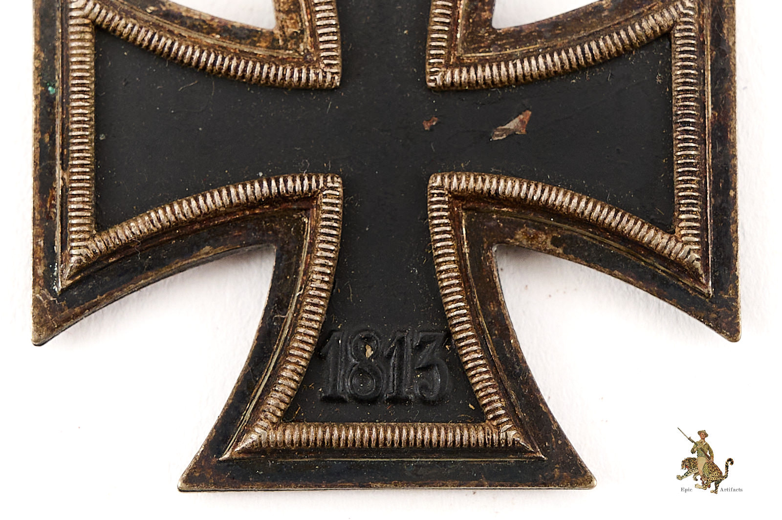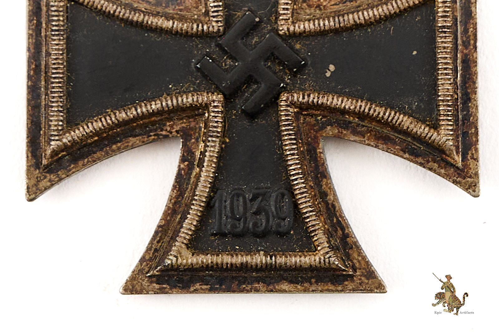 Historical Description: There is no more iconic German military award than the Iron Cross. The long history of this order began during the Napoleonic Wars. King Friedrich Wilhelm III of Prussia instituted the “Eisernes Kreuz” (Iron Cross) in March of 1813. The award criteria changed somewhat with time, but generally speaking, Iron Crosses could be awarded for individual acts of bravery, or for leadership achievements on the battlefield. The design was created by a Karl Friedrich Schinkel, his choice of the black cross with silver outline was derived from the heraldic emblem of the Teutonic Knights. There were a number of different type and grades of Iron Cross awards throughout its long history, but the basic details of the most widely awarded grades: The Iron Cross 1st Class and Iron Cross 2nd Class- remained the same. The first-class award was a breast badge, with fittings on the reverse to allow it to be worn on the uniform. These fittings varied widely over time and from maker to maker, and could be a simple in and catch, a screw post and retaining disc, or more elaborate setups. The second-class award was suspended from a ribbon, originally in the Prussian colors of black and white, later in the Reich colors of black, red and white. On the original versions of these crosses, in 1813, the front of the iron core of each grade was bare, and only the second-class award had ornamentation: a crown over the initials “FW” representing the King, a sprig of oak leaves, and the date 1813. The core was redesigned in 1870, when the cross was re-instituted during the Franco-Prussian War. The reverse ornamentation on the Iron Cross 2nd Class remained the same, but the front of the core on both grades now bore another crown, a “W” representing Kaiser Wilhelm, and the date 1870. This pattern repeated again when the cross was reinstituted for WWI- everything stayed the same, only the date 1870 was replaced with 1914. The final reinstitution of the cross came in 1939. For this version, the front of the core for both grades bore a swastika and the date 1939. The oak leaves, crown and royal initials were removed from the reverse, with only the date 1813 remaining as a reminder of the legacy of this award. In WWII, hundreds of thousands of Iron Cross First Class awards were bestowed, and four and a half million Iron Cross Second Class awards. Iron Crosses were made by a large number of authorized manufacturers Some variants of these awards were mass produced in huge numbers. Others were made in very limited quantities.