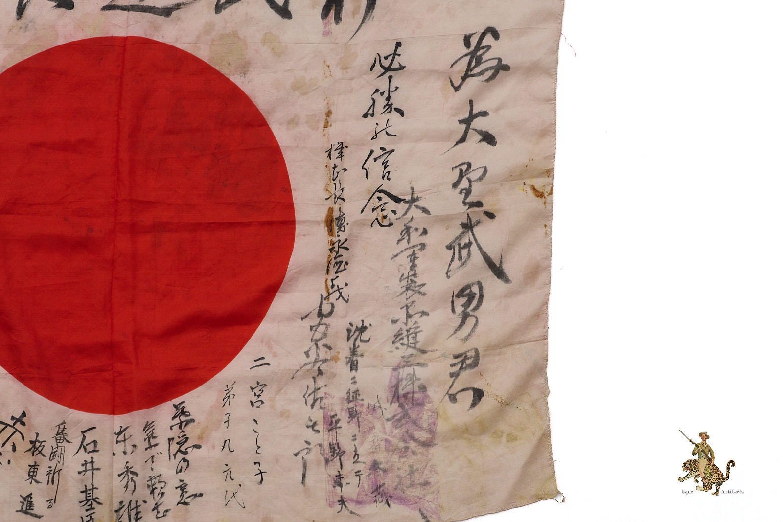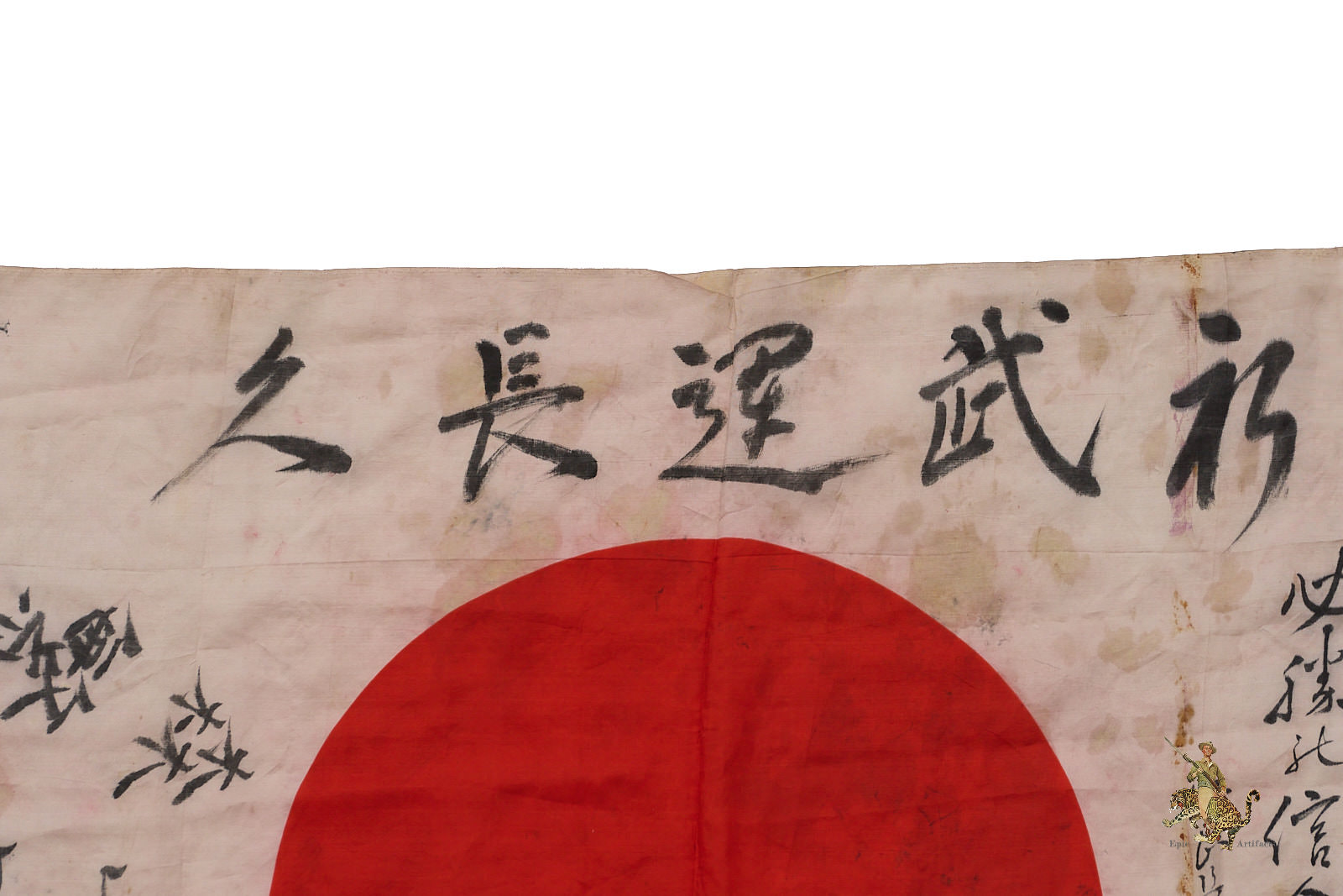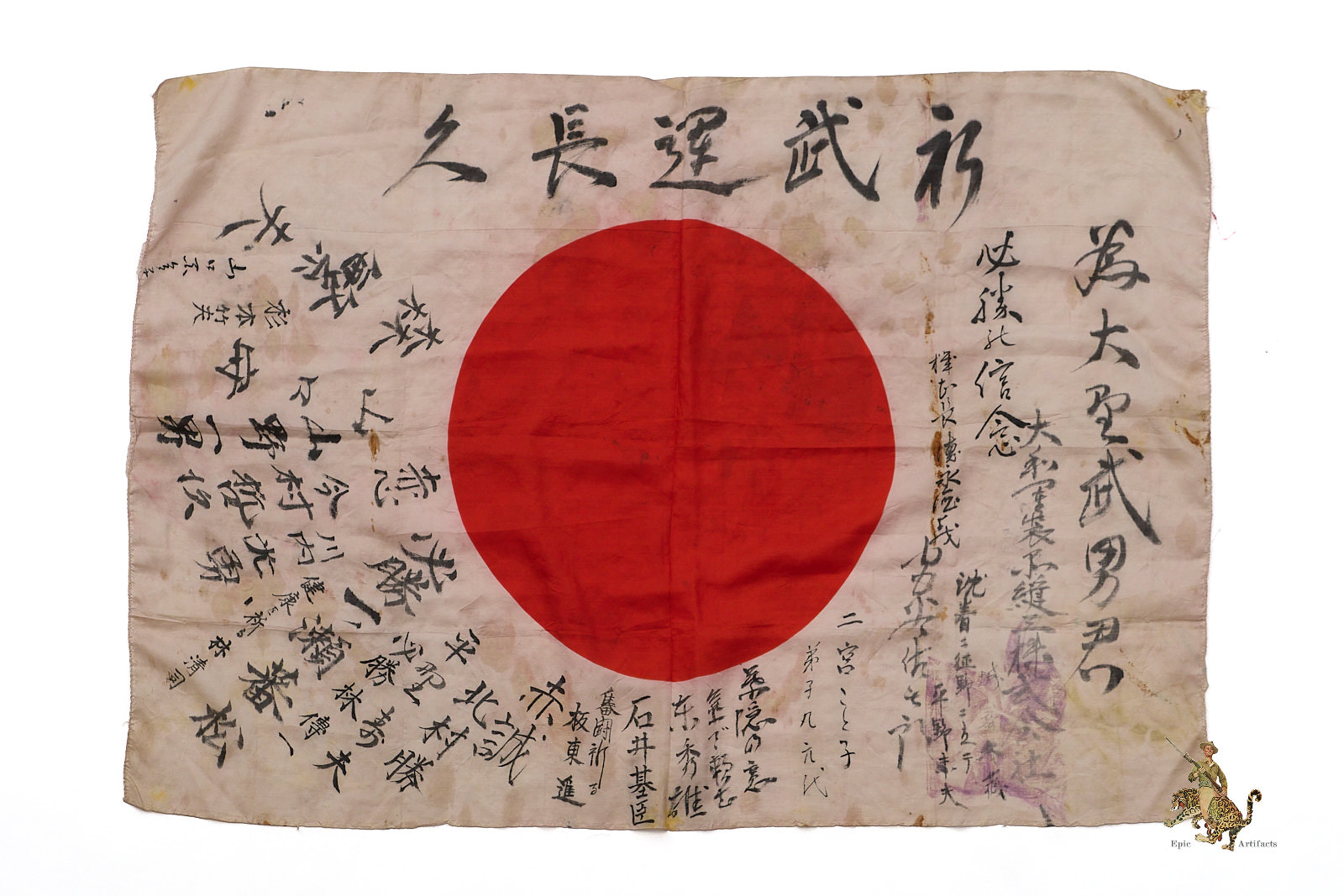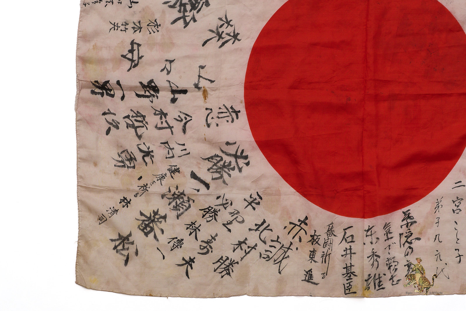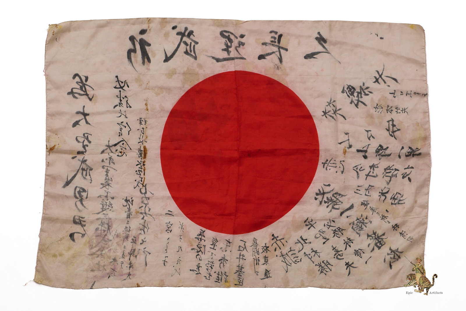 Historical Description: The national flag of Japan is a rectangular white banner with a red disk at the center, representing the sun. It is most commonly known in Japan as “Hinomaru,” the Circle of the Sun. The first historical reference to this flag was in the year 701; the oldest surviving example predates the 16th century. Starting with the Meiji Restoration of 1868, the Hinomaru flag became an important patriotic symbol, and in 1870 it became the national flag used by the Imperial Navy and by merchant ships. The Navy also used, as its ensign and war flag, a version of the sun flag, called the Rising Sun flag, that featured 16 red rays emanating from the central disk. Both the Hinomaru sun flag, and the Rising Sun flag, were very important in Imperial Japan and during World War 2. Soldiers were traditionally given signed examples of the Hinomaru flag bearing the signatures of friends and family, along with short patriotic messages wishing them luck. After WWII, use of the traditional Japanese flags was restricted, though these restrictions were later eased. Japanese flags were eagerly collected souvenirs for American servicemen in the Pacific, and genuine wartime examples remain very collectible today.