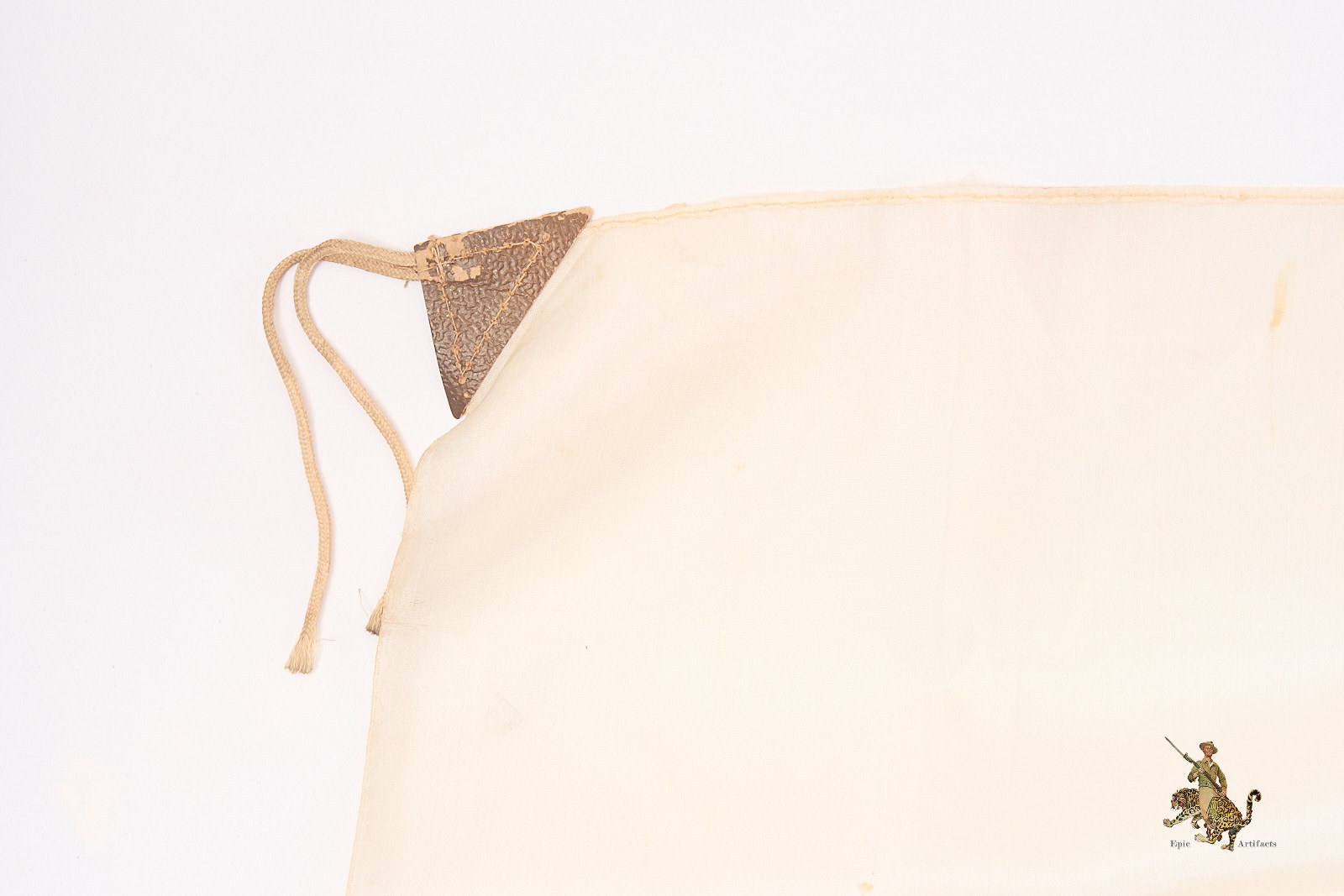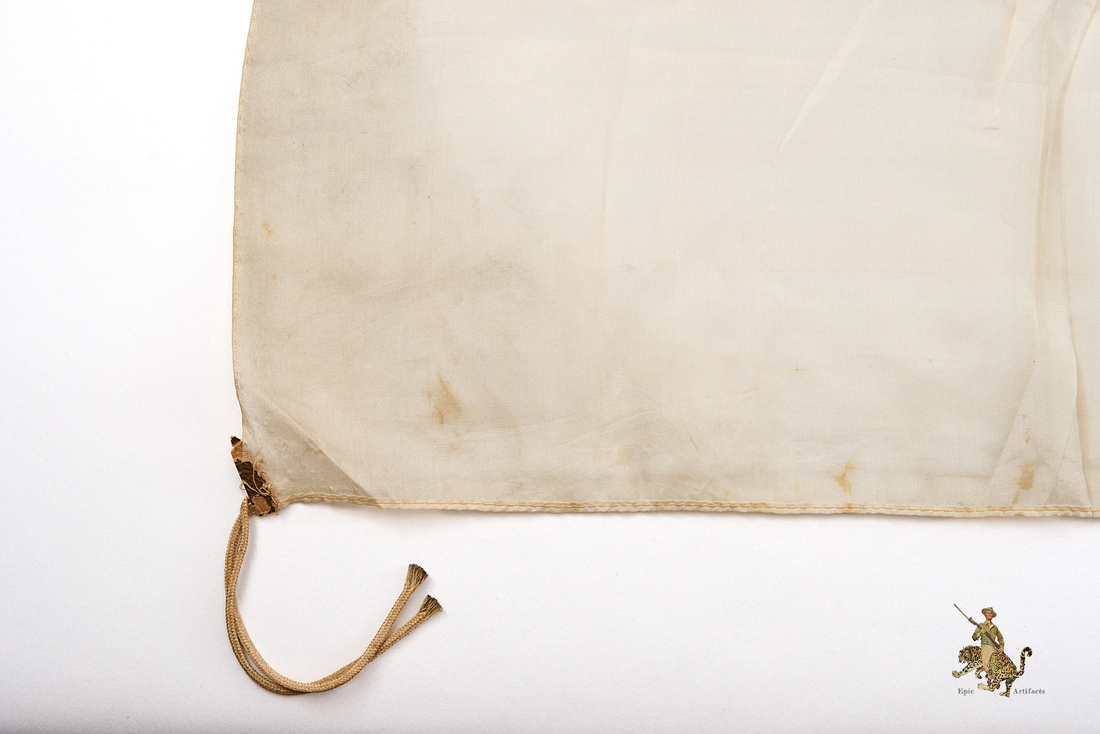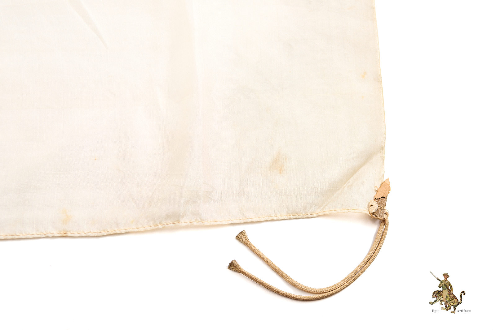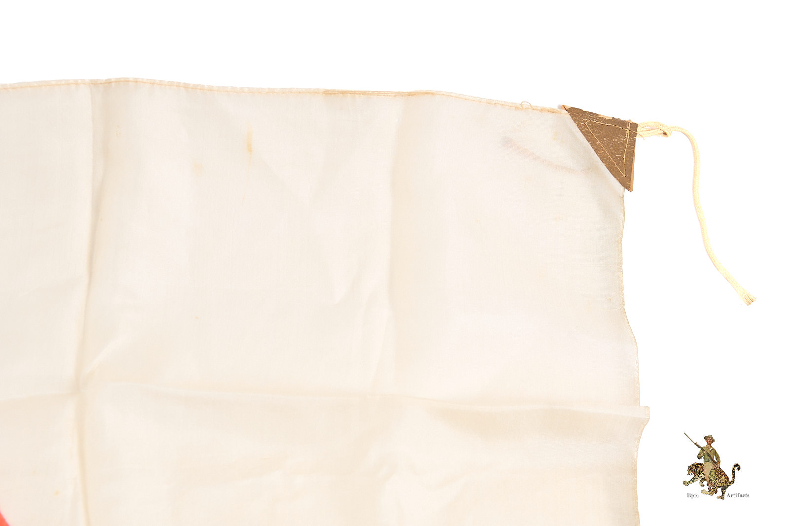 Product Description: This Japanese Silk Flag “Meatball” 36″ x 26″ is a textbook original piece, that was likely taken to the US as a war souvenir by a returning veteran. It’s made of a very nice quality fine silk, and measures 36″ x 26,” a nice size for display. The center of the flag features a printed red disk, that retains great original color. The edges are finished with neat machine stitching. At the hoist end, each corner has a correct triangular reinforcement, with intact ties for affixing this to a pole. This Japanese Silk Flag “Meatball” 36″ x 26″ has normal creases from being stored folded for decades, and also shows light age toning and a few areas of very light discoloration. It looks great on display, and remains in a strong excellent condition.