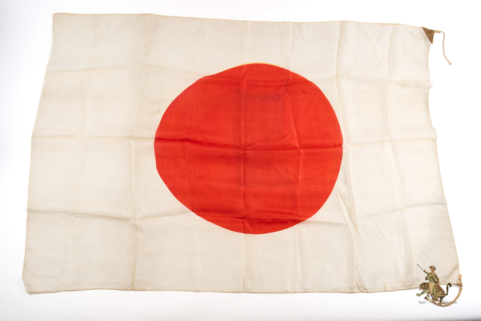 Historical Description: The national flag of Japan is a rectangular white banner with a red disk at the center, representing the sun. It is most commonly known in Japan as “Hinomaru,” the Circle of the Sun. The first historical reference to this flag was in the year 701; the oldest surviving example predates the 16th century. Starting with the Meiji Restoration of 1868, the Hinomaru flag became an important patriotic symbol, and in 1870 it became the national flag used by the Imperial Navy and by merchant ships. The Navy also used, as its ensign and war flag, a version of the sun flag, called the Rising Sun flag, that featured 16 red rays emanating from the central disk. Both the Hinomaru sun flag, and the Rising Sun flag, were very important in Imperial Japan and during World War 2. Soldiers were traditionally given signed examples of the Hinomaru flag bearing the signatures of friends and family, along with short patriotic messages wishing them luck. After WWII, use of the traditional Japanese flags was restricted, though these restrictions were later eased. Japanese flags were eagerly collected souvenirs for American servicemen in the Pacific, and genuine wartime examples remain very collectible today.
