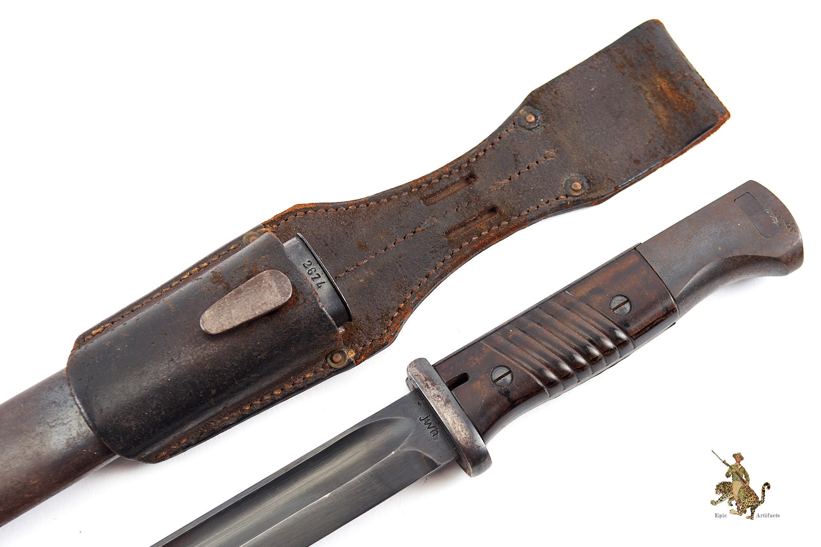 The accompanying brown leather frog, while missing its securing strap, remains structurally sound, displaying natural wear and fading from age. The maker’s marking on the reverse survives but is faint. Altogether, this K98 Bayonet with Frog – jwh – Matching Numbers is a desirable, fully matched set from a less commonly encountered manufacturer, appealing for its authenticity and strong condition, and would make a noteworthy addition to a serious collection.