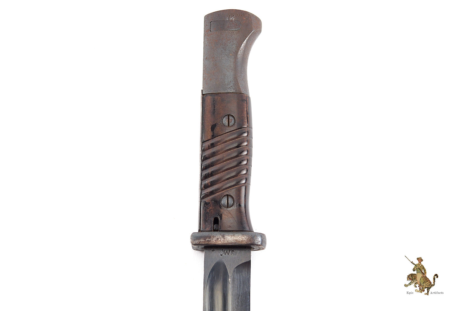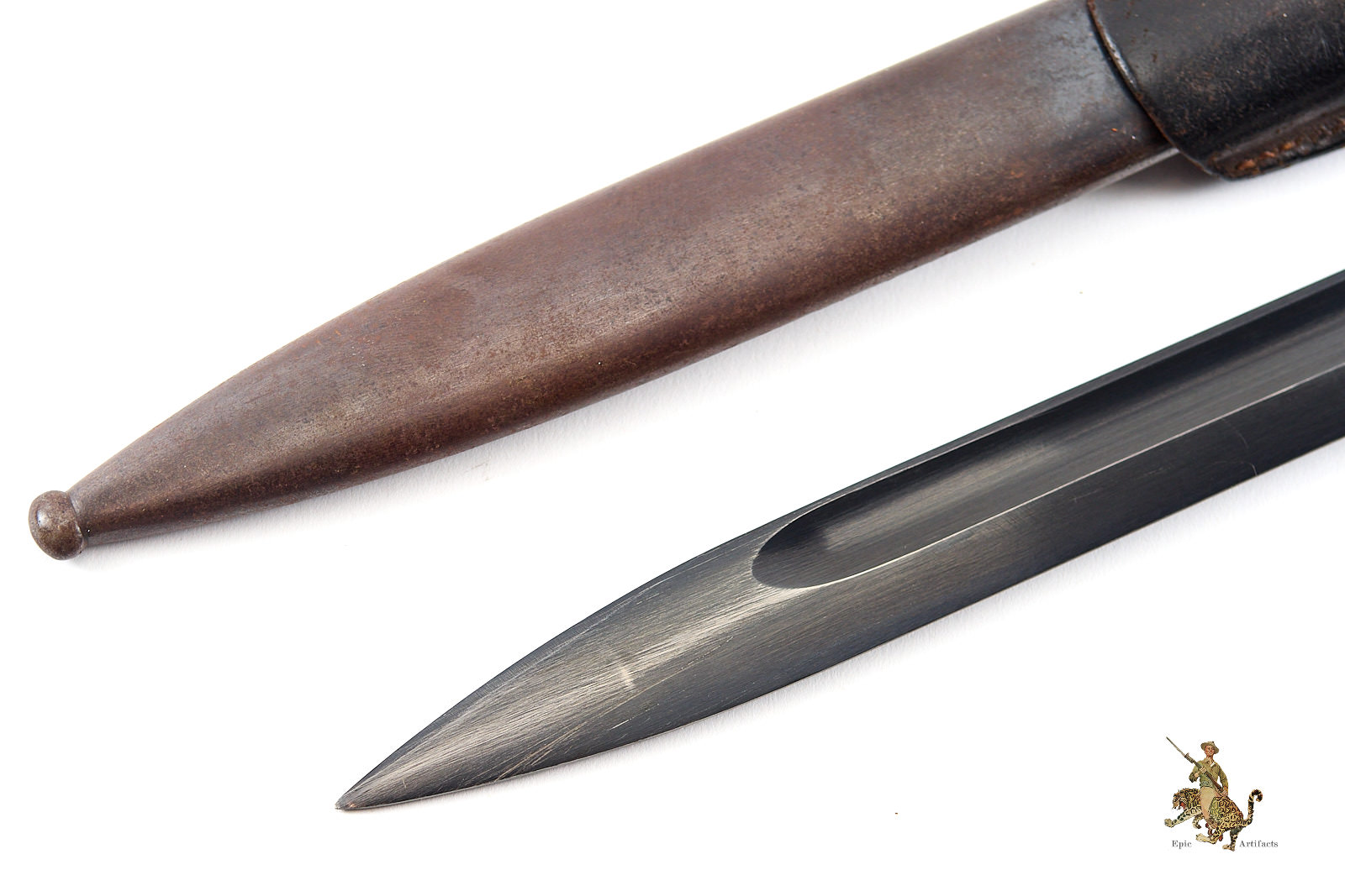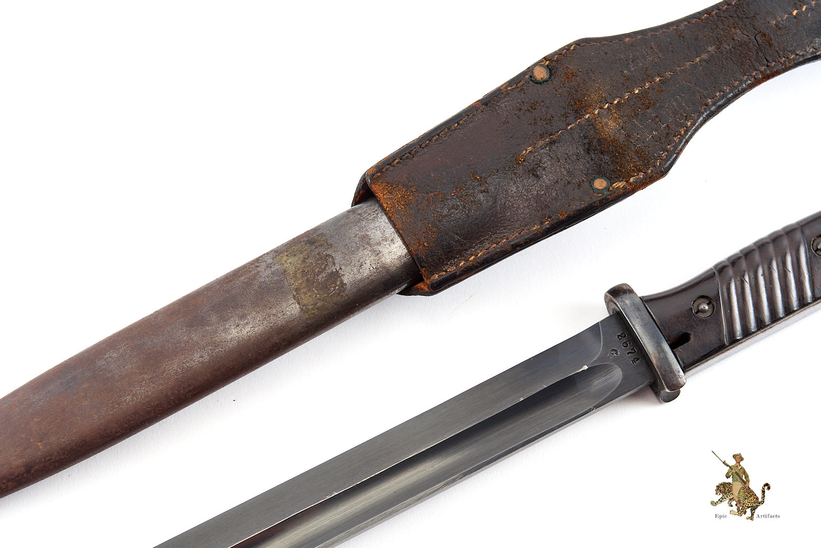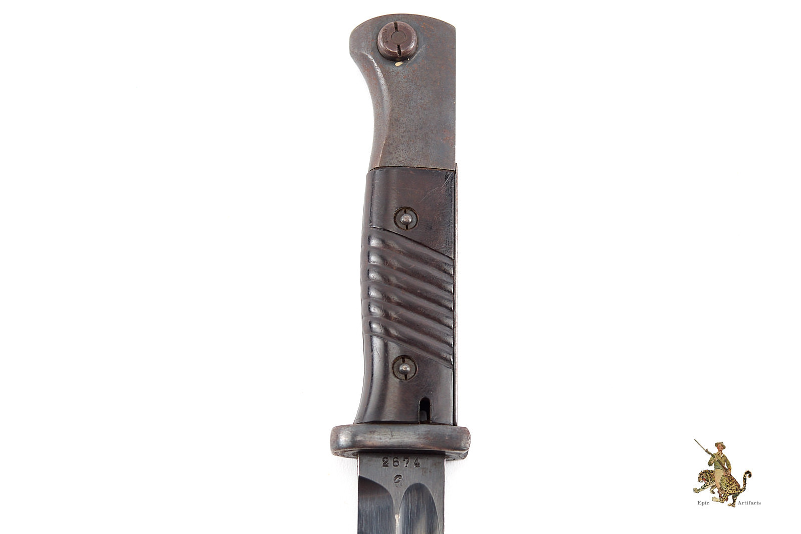 Historical Description: The bayonet was an important part of the combat equipment of the German soldier in both World Wars. The first pattern of German combat bayonet was the Mauser model 1898 which had a long, slender blade. As a result of experiences in combat use in WWI, it was soon decided to shorten the blades on these weapons. This 1898 pattern bayonet was used early in WWI alongside the 1898/05 and the S84/98 bayonets, which were initially shorter, and stronger, than the unmodified 1898 type. Both of these types were made with and without a saw-backed blade. Due to the challenges faced by German industry and the shortages of raw materials, a variety of “Ersatz” (replacement) types were introduced during WWI. After the war, the S84/98 bayonet became standard issue in the Reichswehr and later, in the Wehrmacht, for troops armed with the K98 rifle (the standard WWII German infantry weapon). The bayonets made for issue with the K98 rifle initially had wooden grips. Later, some bayonets were made with Bakelite grips. The bayonets were worn on the belt by means of a leather frog, of which there were a number of prewar and wartime variations including a short bayonet frog for use with the folding shovel, and a webbing frog for tropical use. In 1942, a new model of bayonet was introduced, knows as the SG42. This was a very modernized bayonet, with a comfortable Bakelite grip, and a relatively short blade that made it ideal for use either as a bayonet or a fighting knife. Within the grip was a removable multi-tool insert with a folding knife/bottle opener, awl and screwdriver. Although the SG42 was proposed as a replacement for the S84/98, few were manufactured. German combat bayonets were made in countless variations and all are very collectible today, with some rare variants being very avidly sought-after.