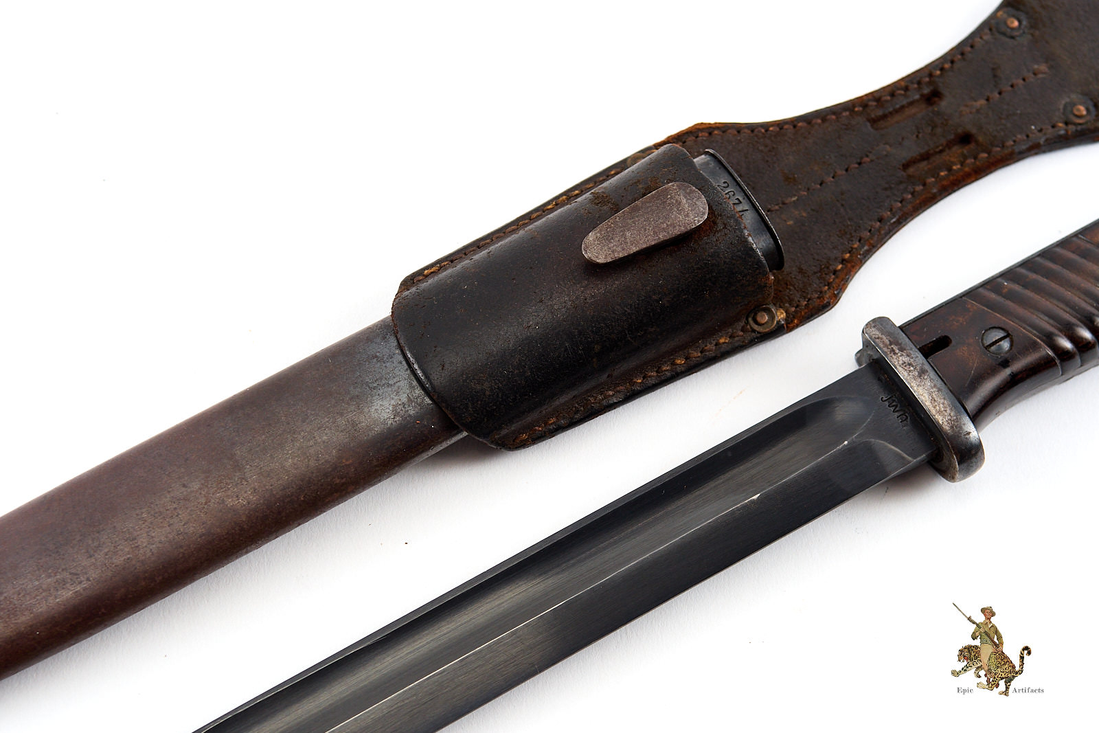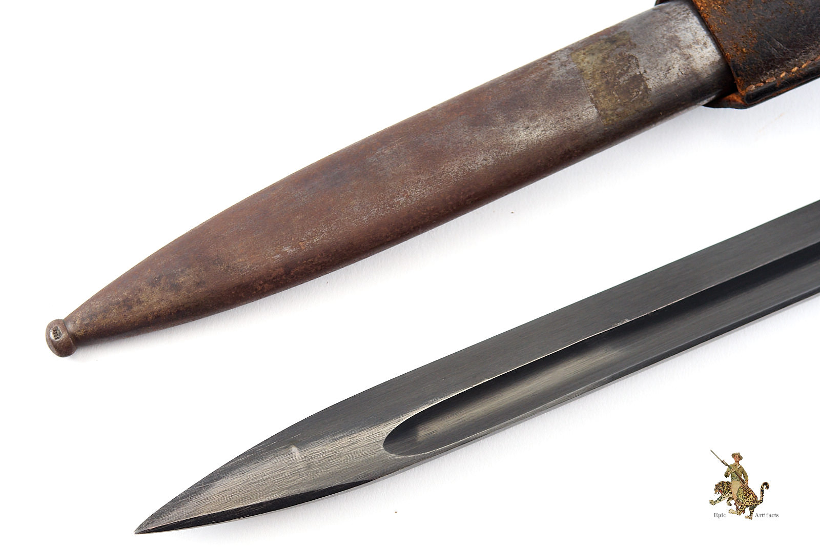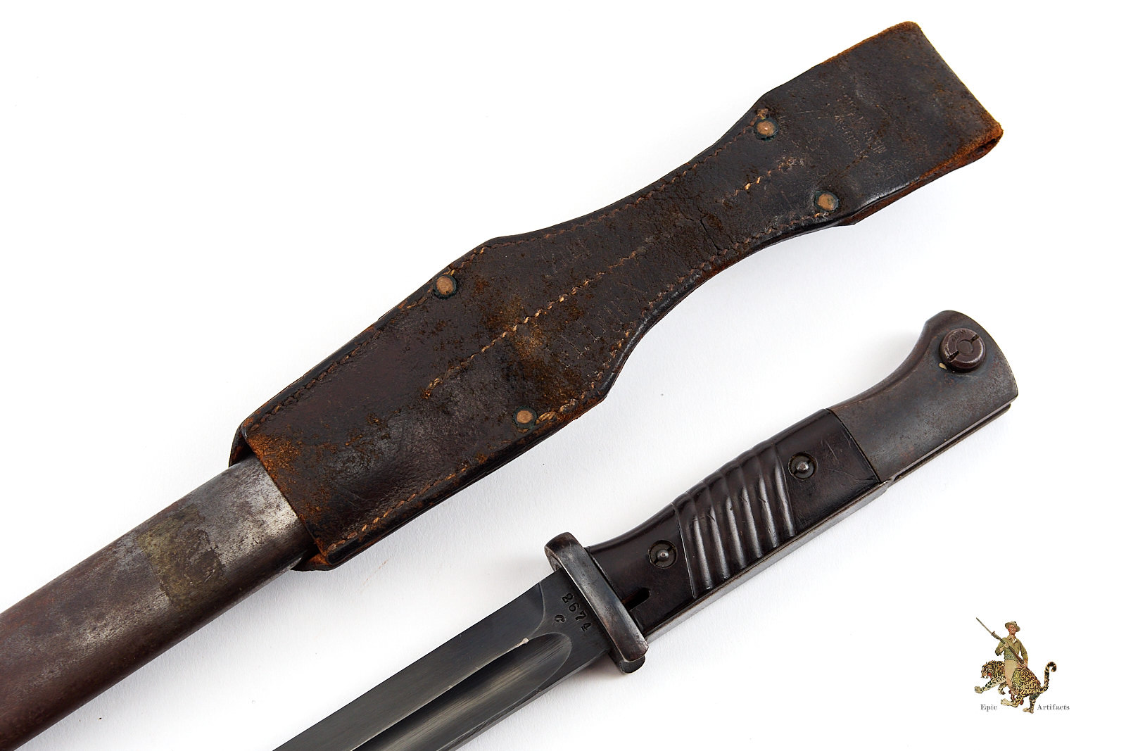 Historical Description: The bayonet was an important part of the combat equipment of the German soldier in both World Wars. The first pattern of German combat bayonet was the Mauser model 1898 which had a long, slender blade. As a result of experiences in combat use in WWI, it was soon decided to shorten the blades on these weapons. This 1898 pattern bayonet was used early in WWI alongside the 1898/05 and the S84/98 bayonets, which were initially shorter, and stronger, than the unmodified 1898 type. Both of these types were made with and without a saw-backed blade. Due to the challenges faced by German industry and the shortages of raw materials, a variety of “Ersatz” (replacement) types were introduced during WWI. After the war, the S84/98 bayonet became standard issue in the Reichswehr and later, in the Wehrmacht, for troops armed with the K98 rifle (the standard WWII German infantry weapon). The bayonets made for issue with the K98 rifle initially had wooden grips. Later, some bayonets were made with Bakelite grips. The bayonets were worn on the belt by means of a leather frog, of which there were a number of prewar and wartime variations including a short bayonet frog for use with the folding shovel, and a webbing frog for tropical use. In 1942, a new model of bayonet was introduced, knows as the SG42. This was a very modernized bayonet, with a comfortable Bakelite grip, and a relatively short blade that made it ideal for use either as a bayonet or a fighting knife. Within the grip was a removable multi-tool insert with a folding knife/bottle opener, awl and screwdriver. Although the SG42 was proposed as a replacement for the S84/98, few were manufactured. German combat bayonets were made in countless variations and all are very collectible today, with some rare variants being very avidly sought-after.