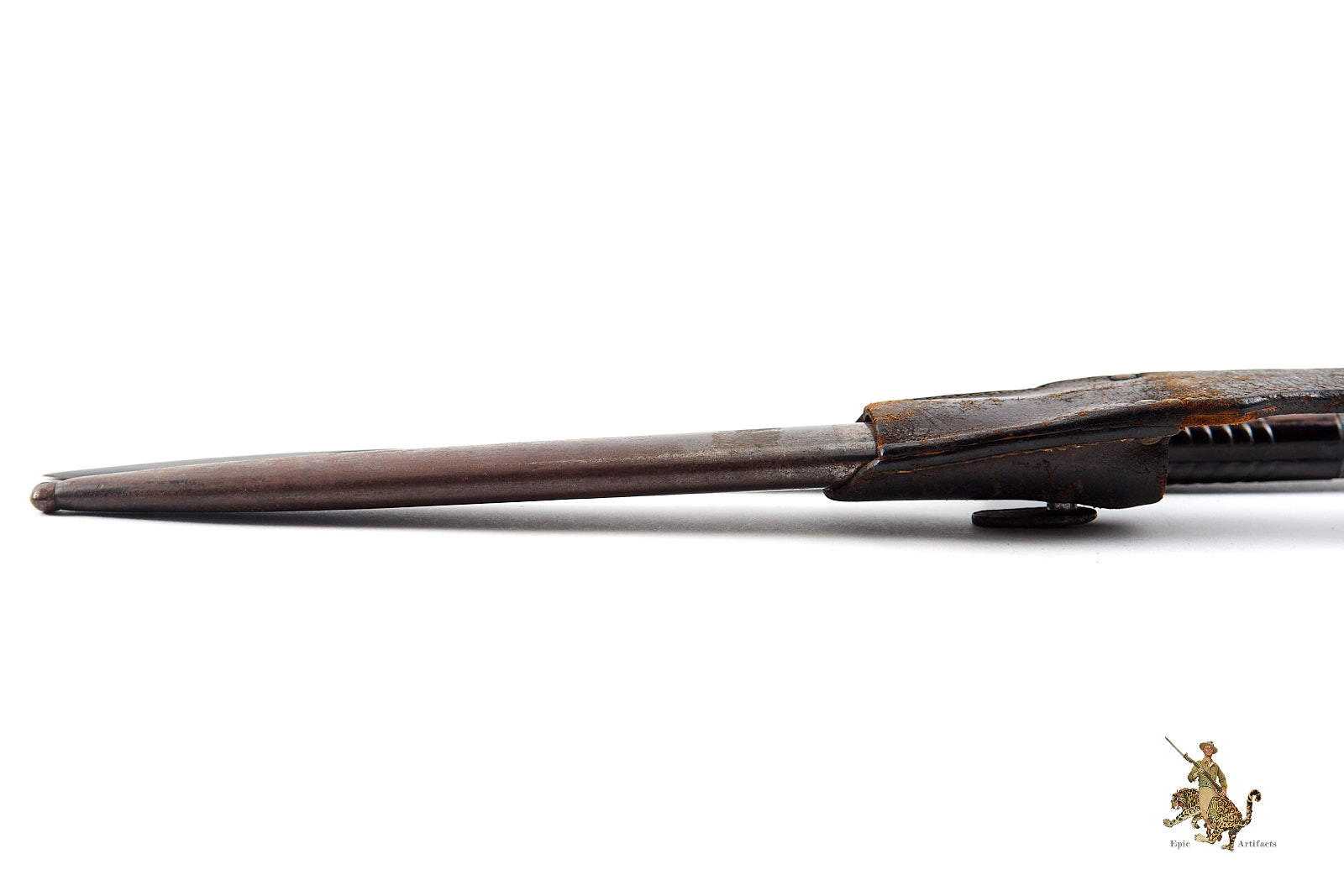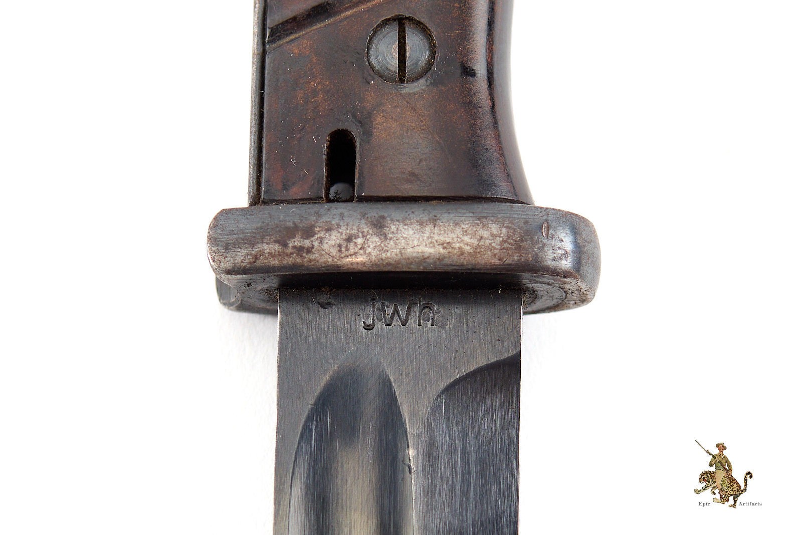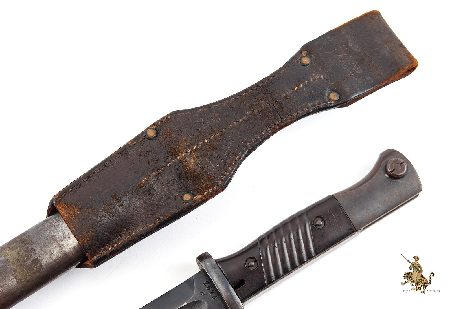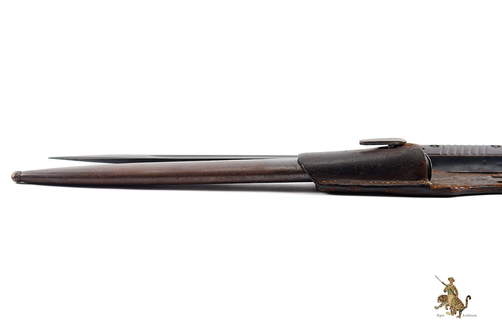 Historical Description: The bayonet was an important part of the combat equipment of the German soldier in both World Wars. The first pattern of German combat bayonet was the Mauser model 1898 which had a long, slender blade. As a result of experiences in combat use in WWI, it was soon decided to shorten the blades on these weapons. This 1898 pattern bayonet was used early in WWI alongside the 1898/05 and the S84/98 bayonets, which were initially shorter, and stronger, than the unmodified 1898 type. Both of these types were made with and without a saw-backed blade. Due to the challenges faced by German industry and the shortages of raw materials, a variety of “Ersatz” (replacement) types were introduced during WWI. After the war, the S84/98 bayonet became standard issue in the Reichswehr and later, in the Wehrmacht, for troops armed with the K98 rifle (the standard WWII German infantry weapon). The bayonets made for issue with the K98 rifle initially had wooden grips. Later, some bayonets were made with Bakelite grips. The bayonets were worn on the belt by means of a leather frog, of which there were a number of prewar and wartime variations including a short bayonet frog for use with the folding shovel, and a webbing frog for tropical use. In 1942, a new model of bayonet was introduced, knows as the SG42. This was a very modernized bayonet, with a comfortable Bakelite grip, and a relatively short blade that made it ideal for use either as a bayonet or a fighting knife. Within the grip was a removable multi-tool insert with a folding knife/bottle opener, awl and screwdriver. Although the SG42 was proposed as a replacement for the S84/98, few were manufactured. German combat bayonets were made in countless variations and all are very collectible today, with some rare variants being very avidly sought-after.