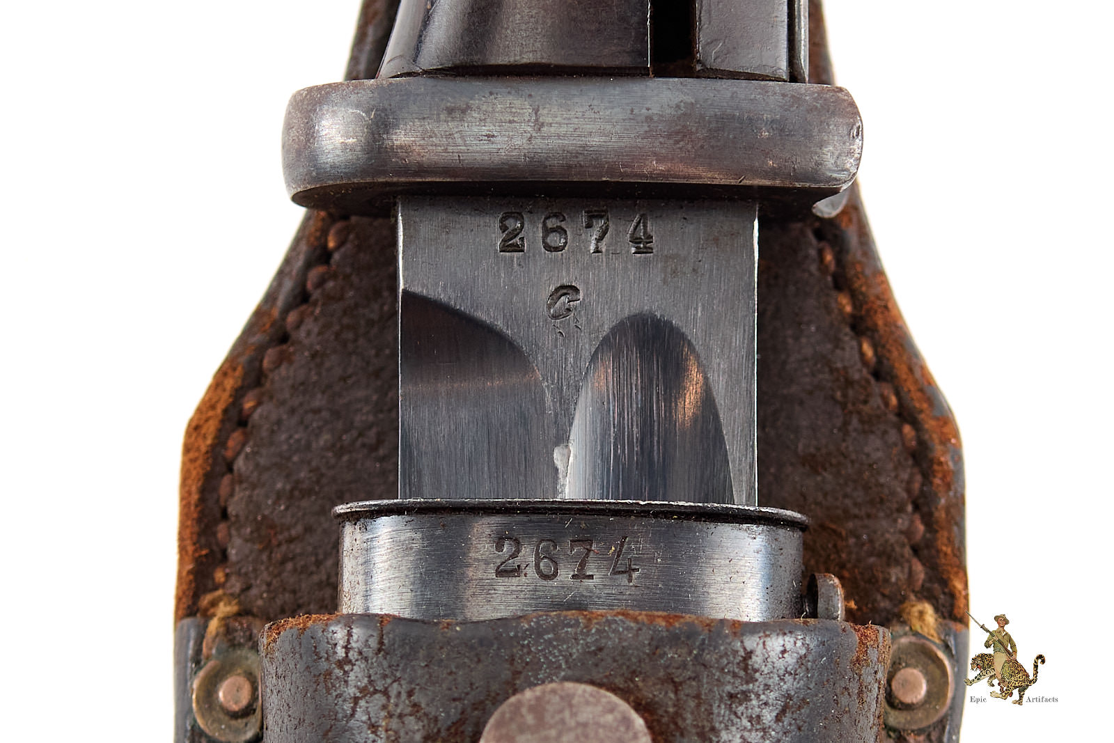 Product Description: A well-preserved wartime example manufactured by Staatliche Waffenfabrik, Châtellerault (“jwh”) between 1941 and 1944, this bayonet and scabbard pair features fully matching serial number 2674. The blade remains in excellent+ condition, retaining the majority of its original blued finish with only expected runner wear from service use. Its reddish Bakelite grips present attractively, and the pommel bears the correct Waffenamt inspection marks along with light, age-appropriate surface corrosion. The scabbard retains portions of its original finish and displays honest wear and scattered corrosion, including a proper Waffenamt stamp at the tip.